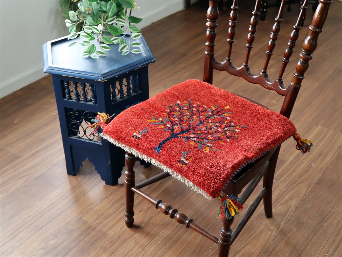 ギャッベ イラン産手織り 座布団サイズ 40×43cm レッド カラフルな花の咲いた樹と動物