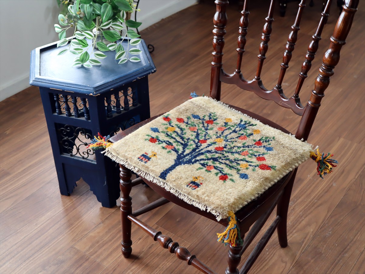 - ギャッベ イラン産手織り 座布団サイズ 37×40cm ナチュラルアイボリー カラフルなザクロの樹と動物