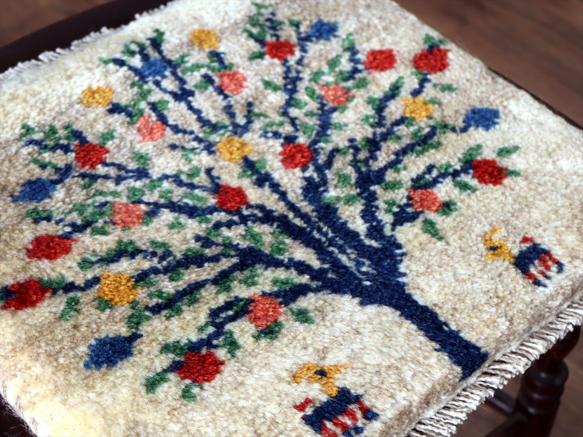 ギャッベ イラン産手織り 座布団サイズ 37×40cm ナチュラルアイボリー カラフルなザクロの樹と動物