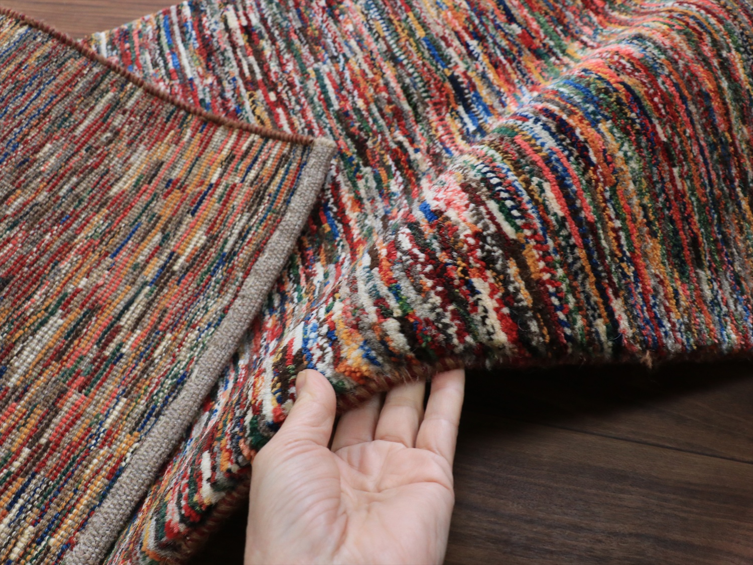何色ものカラフルな毛糸を使って、織り子さんが色を変えては結んで、色を変えては結んで、を繰り返して仕上げられています。正面から見て下のほうは、ドットの目が大きく変化しているところがユニークです。