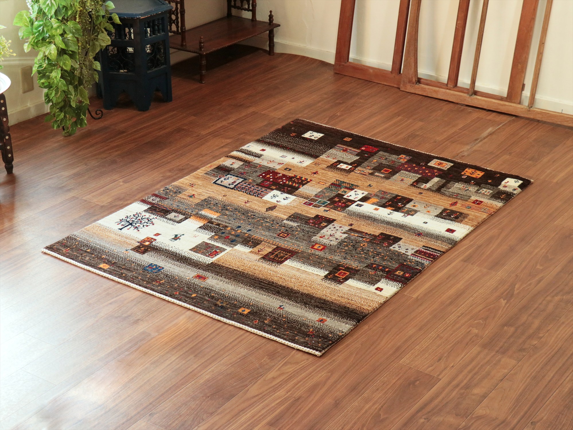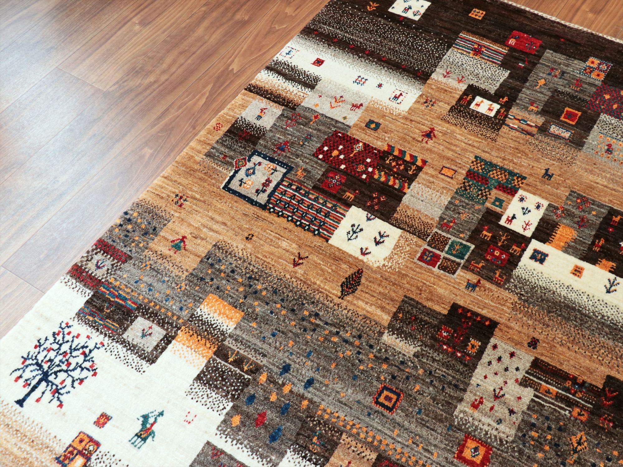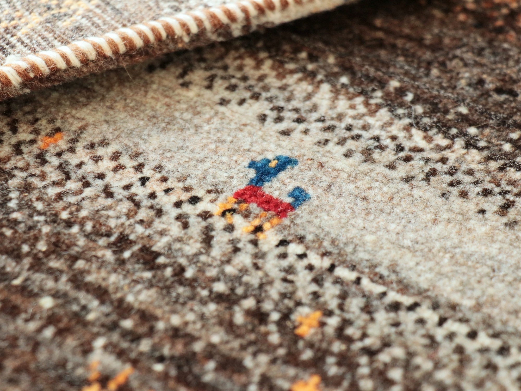 染めていない羊毛のアイボリー、ブラウン、グレーの色合いを使った不規則なパズルのようなデザイン。細かな織りだからこそ表現可能な小さなモチーフが魅力的♪ラクダや魚や小さなお花モチーフやひし形や四角などの幾何学モチーフが入っています。