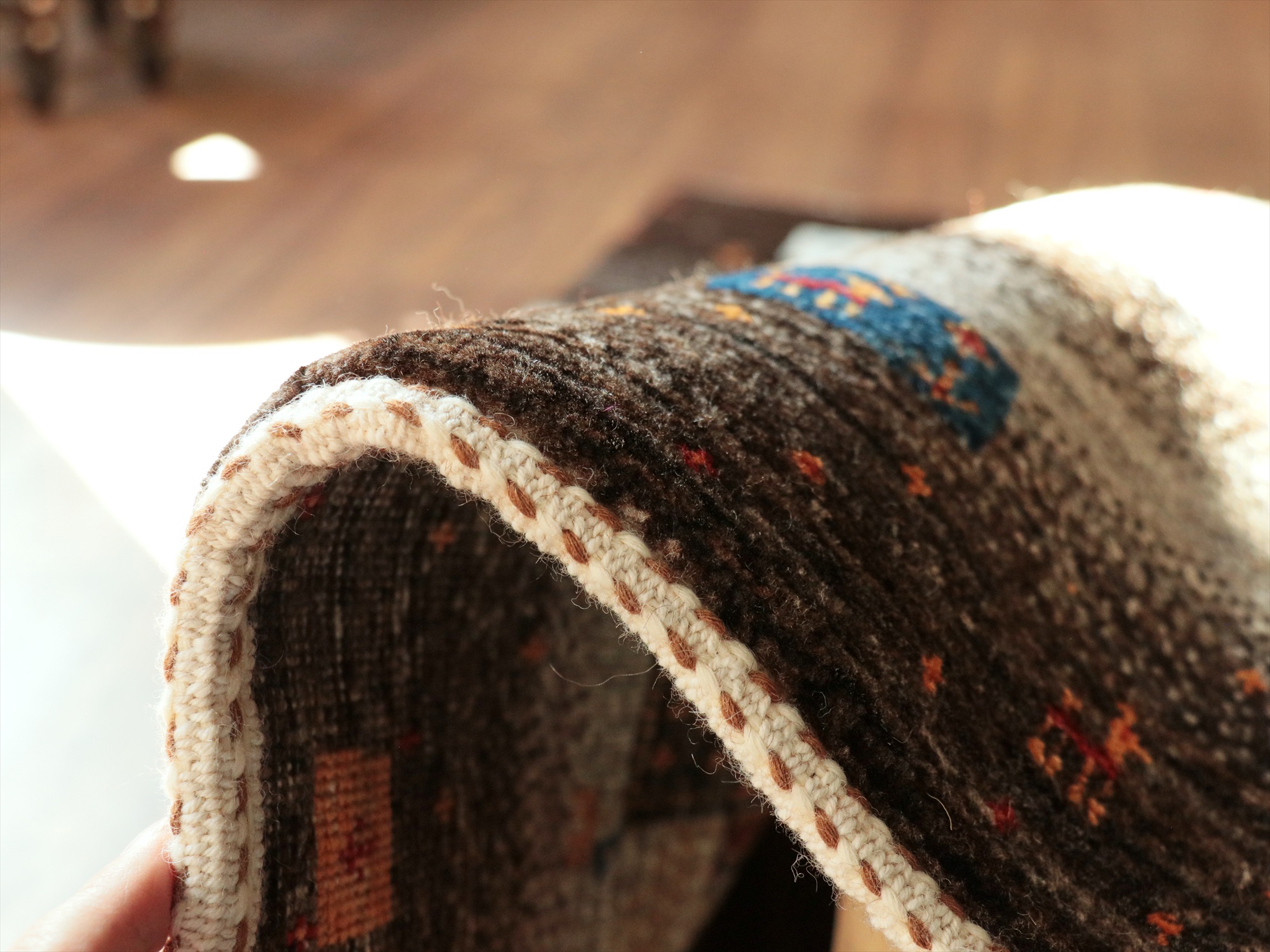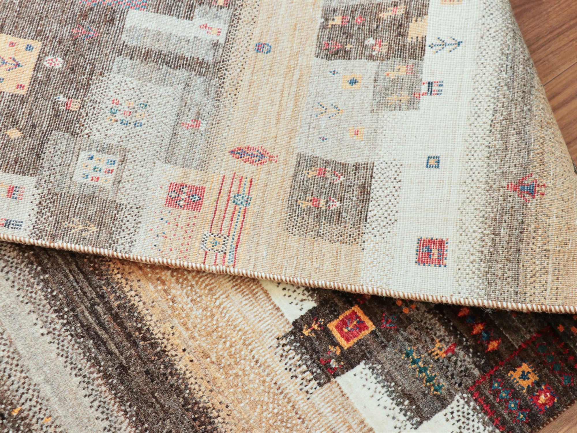 繊細なモチーフをくっきり見せるため、毛足は短めの刈り込みになっています。ラグの厚みは1.1-1.2cm程度のすっきりとしたパイルのギャッベです。