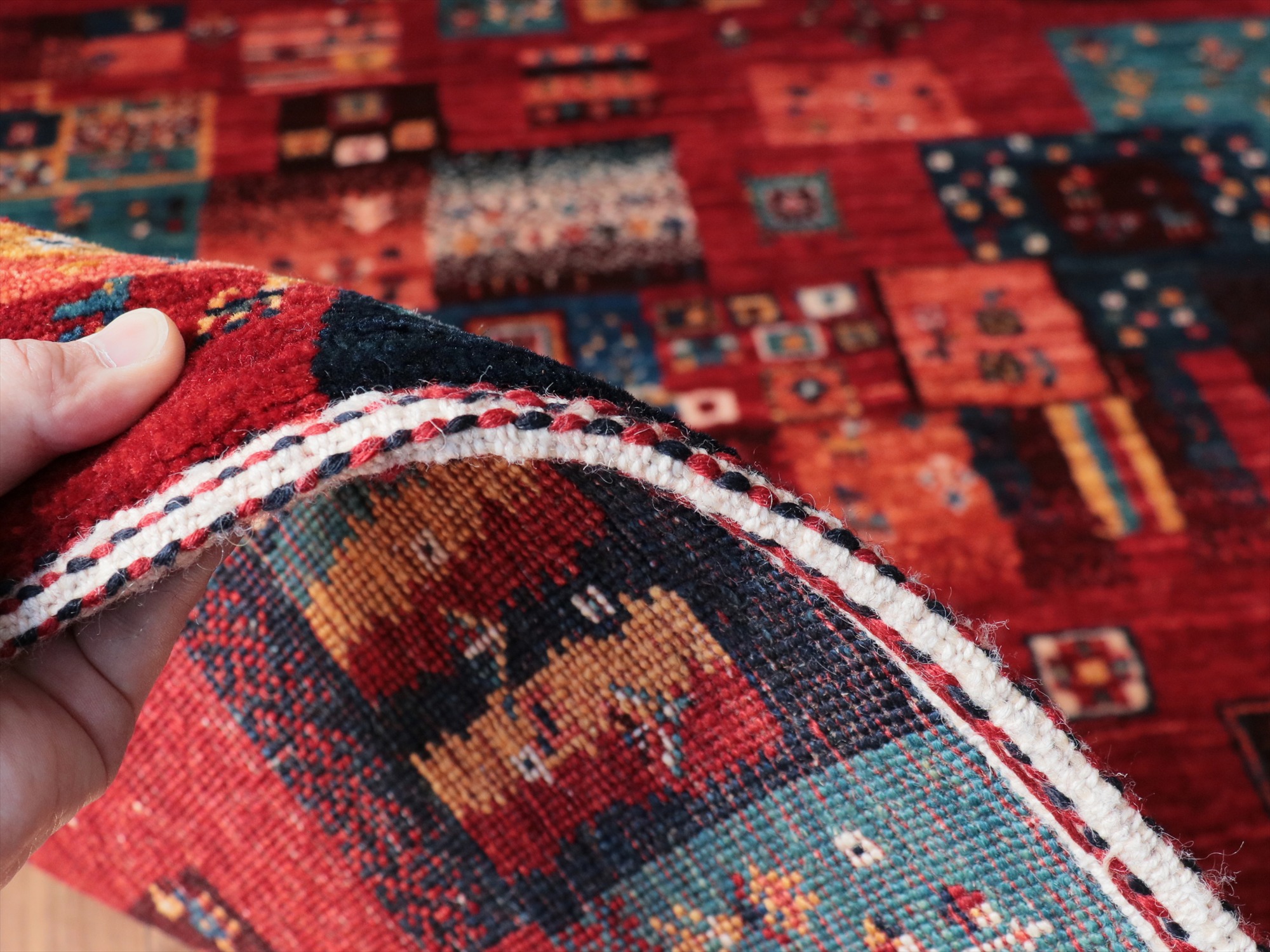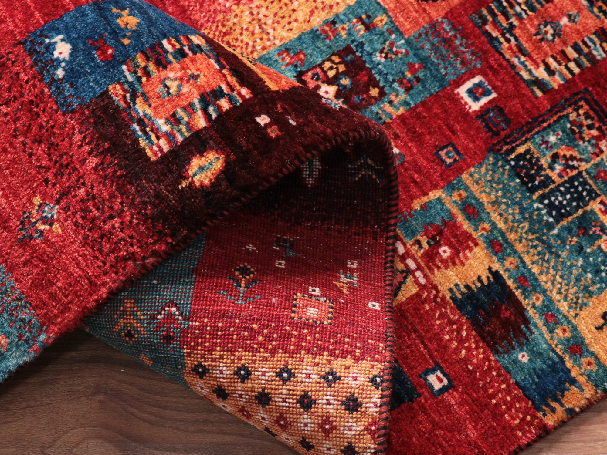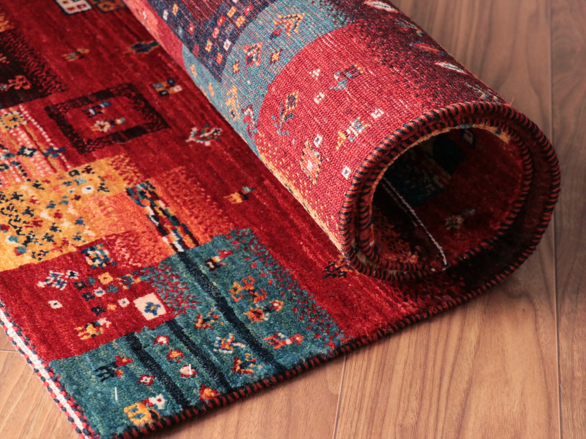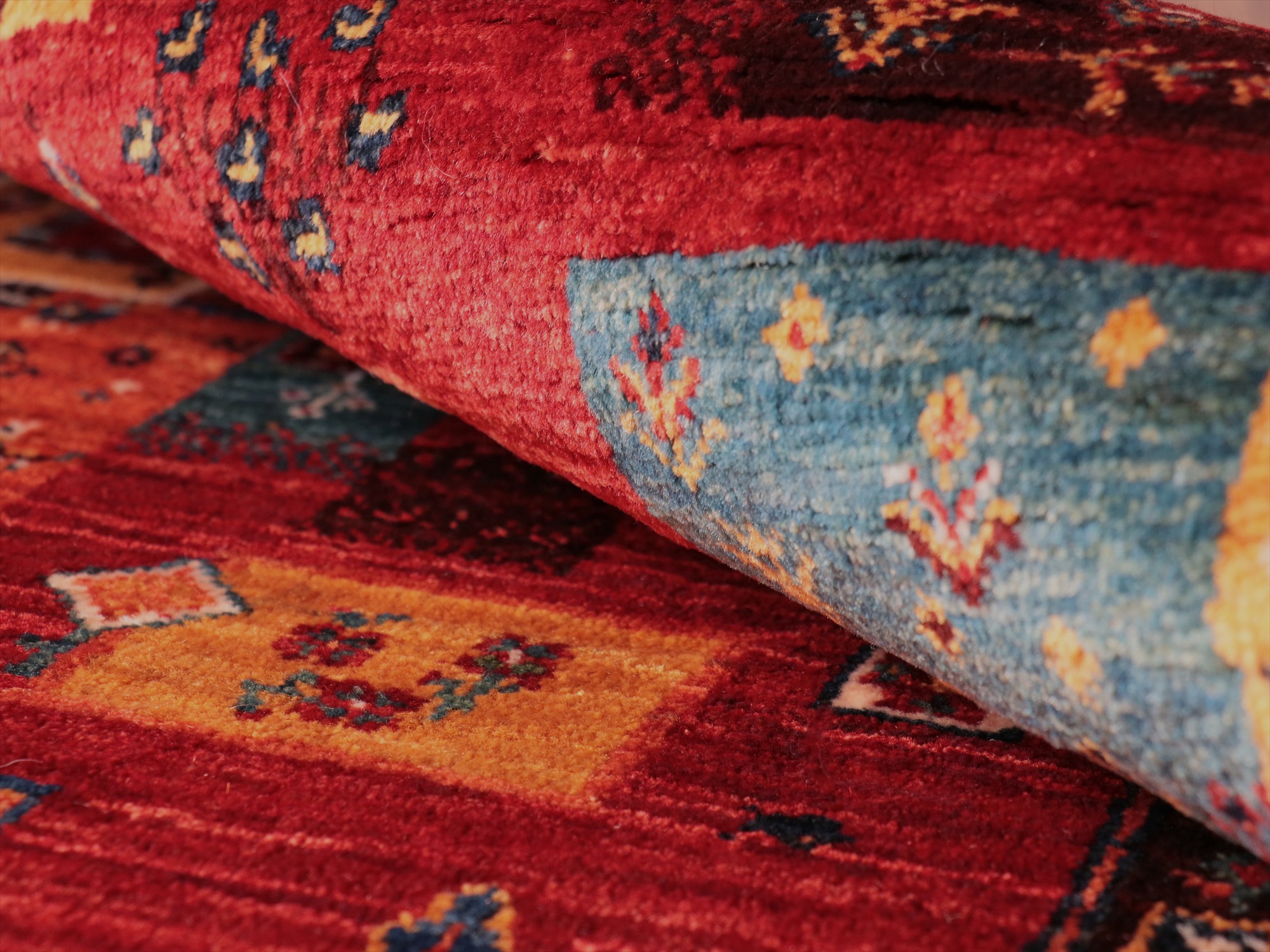 毛足は短く、手触りはやわらかく滑らかです。表面には光沢があります。パイルを含めたギャベの厚みは、1.2-1.3cm程度。