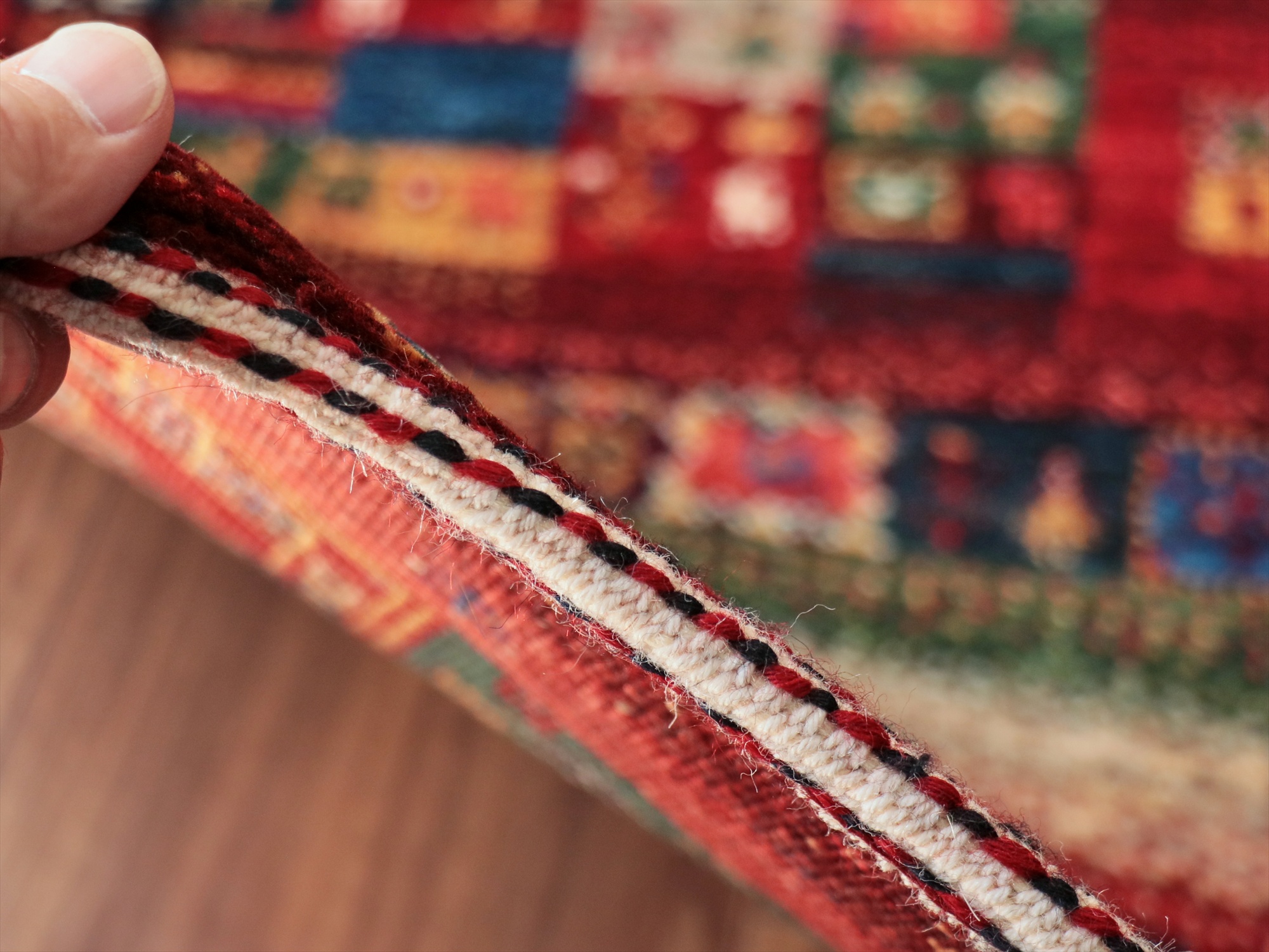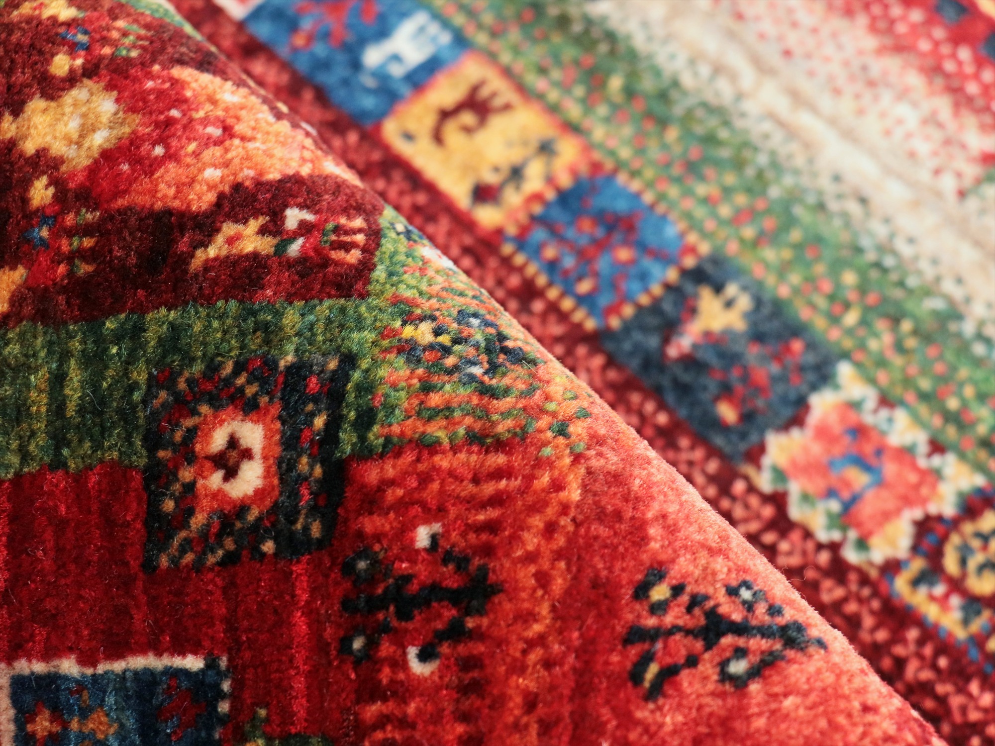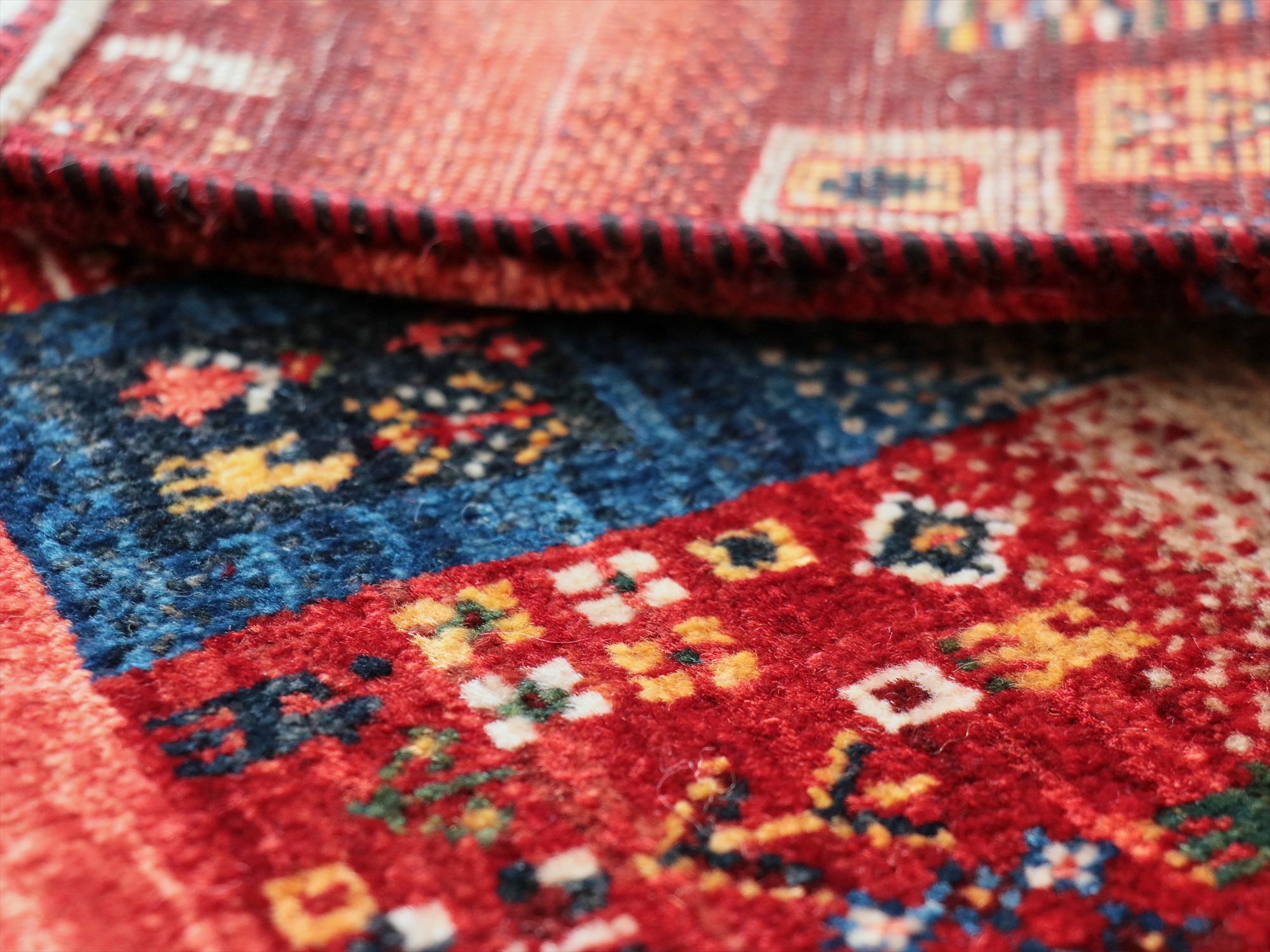 毛足は短く、手触りはやわらかく滑らかです。表面には光沢があります。パイルを含めたギャベの厚みは、1.2-1.3cm程度。