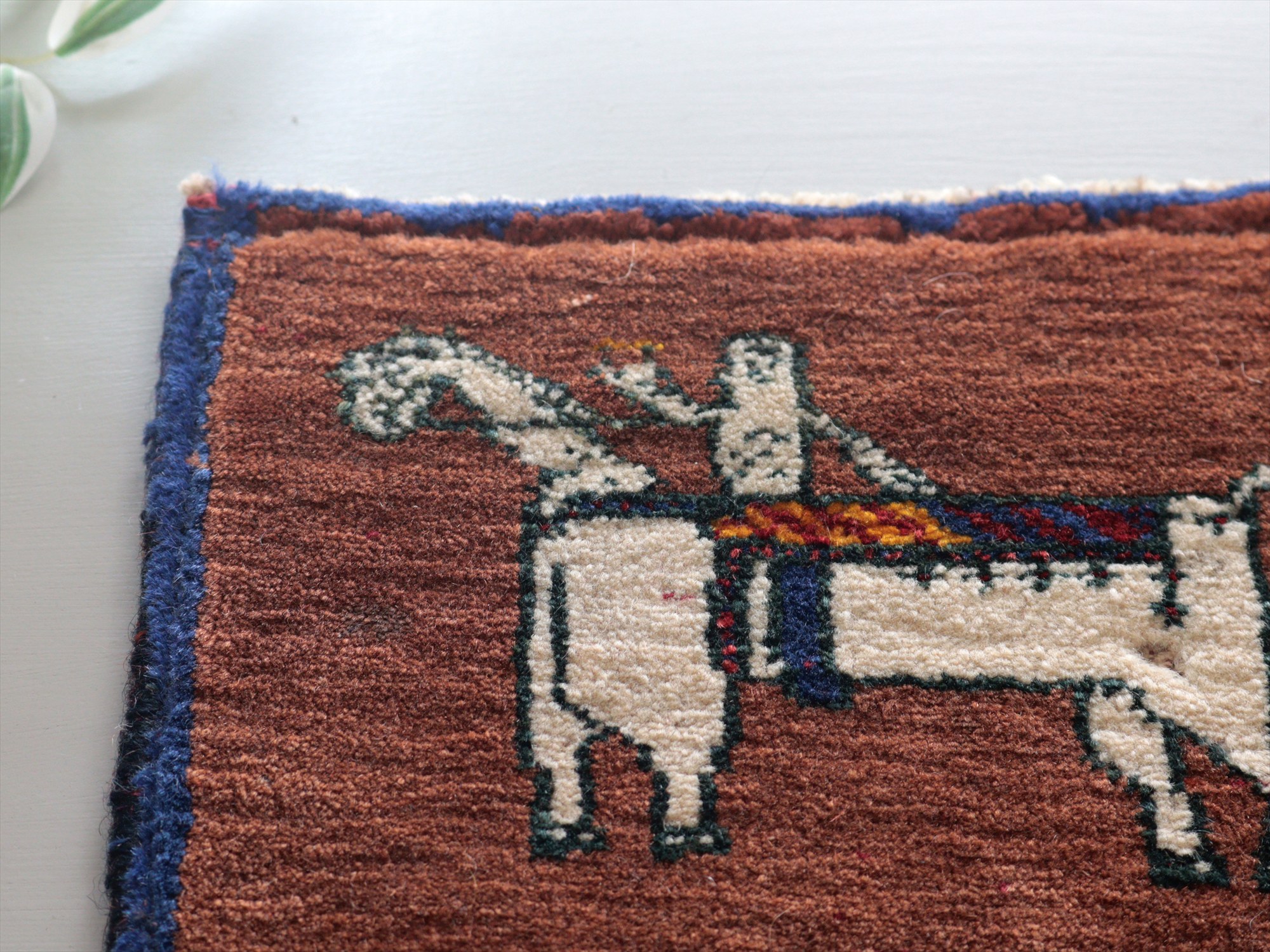 - ギャッベ カシュカイ族の手織りラグ 21x27cm 白馬にのる人/ブラウン・ミニカーペット 【OUTLET】