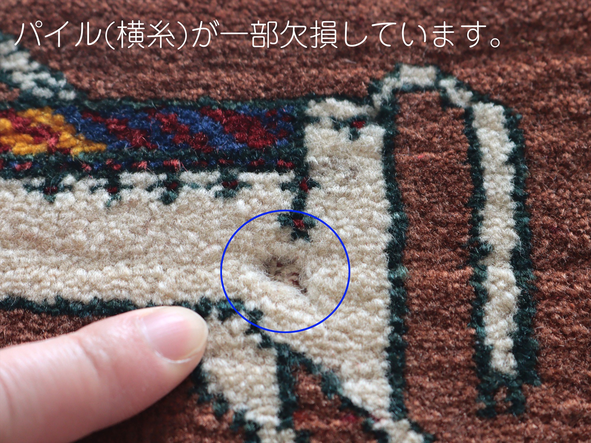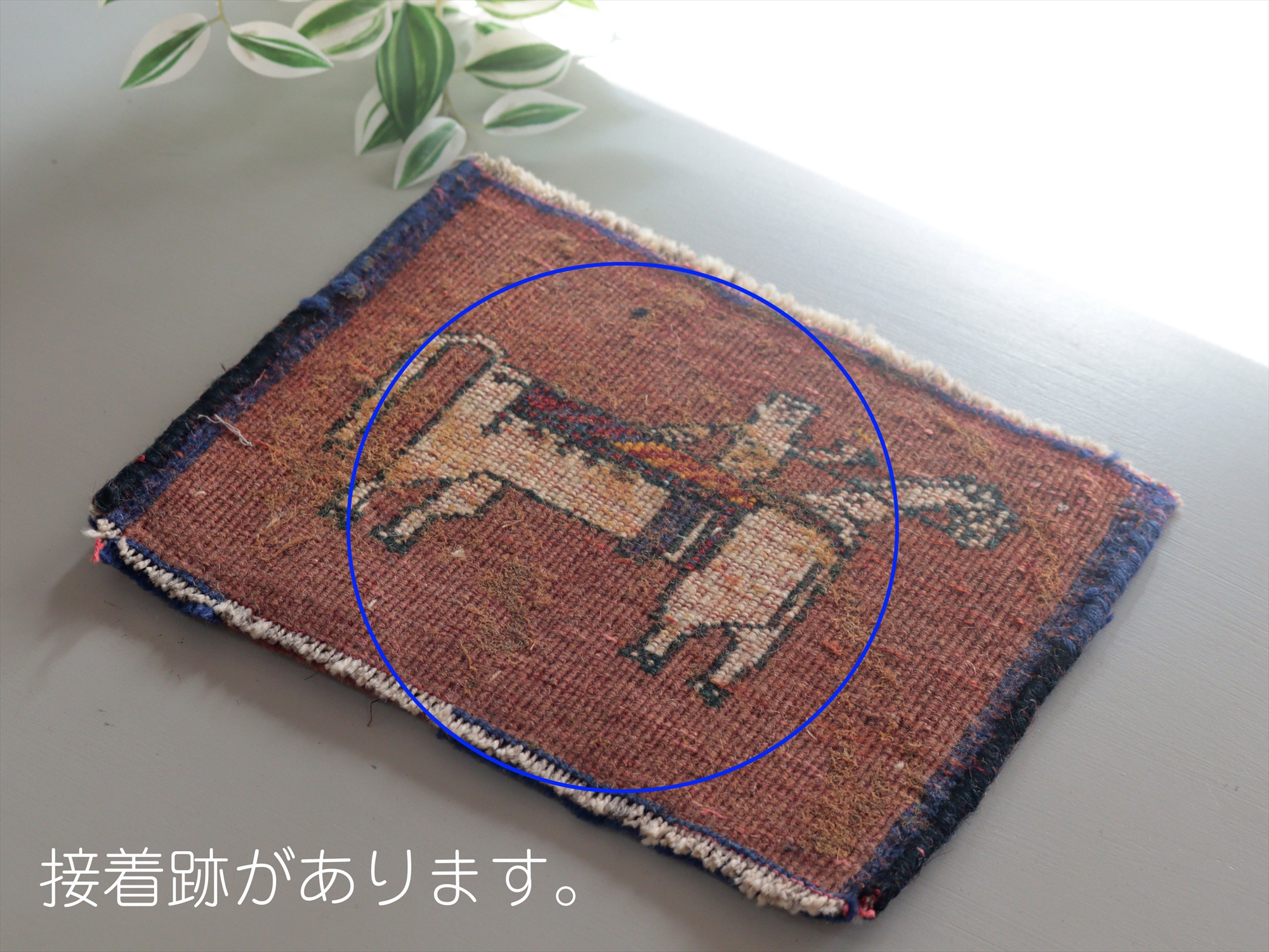 目の細かい織りでパイルは短め、織り地にはハリがあります。パイルに削れてしまっている箇所があります。また、裏面に接着跡が残っています(写真をご参照ください)。