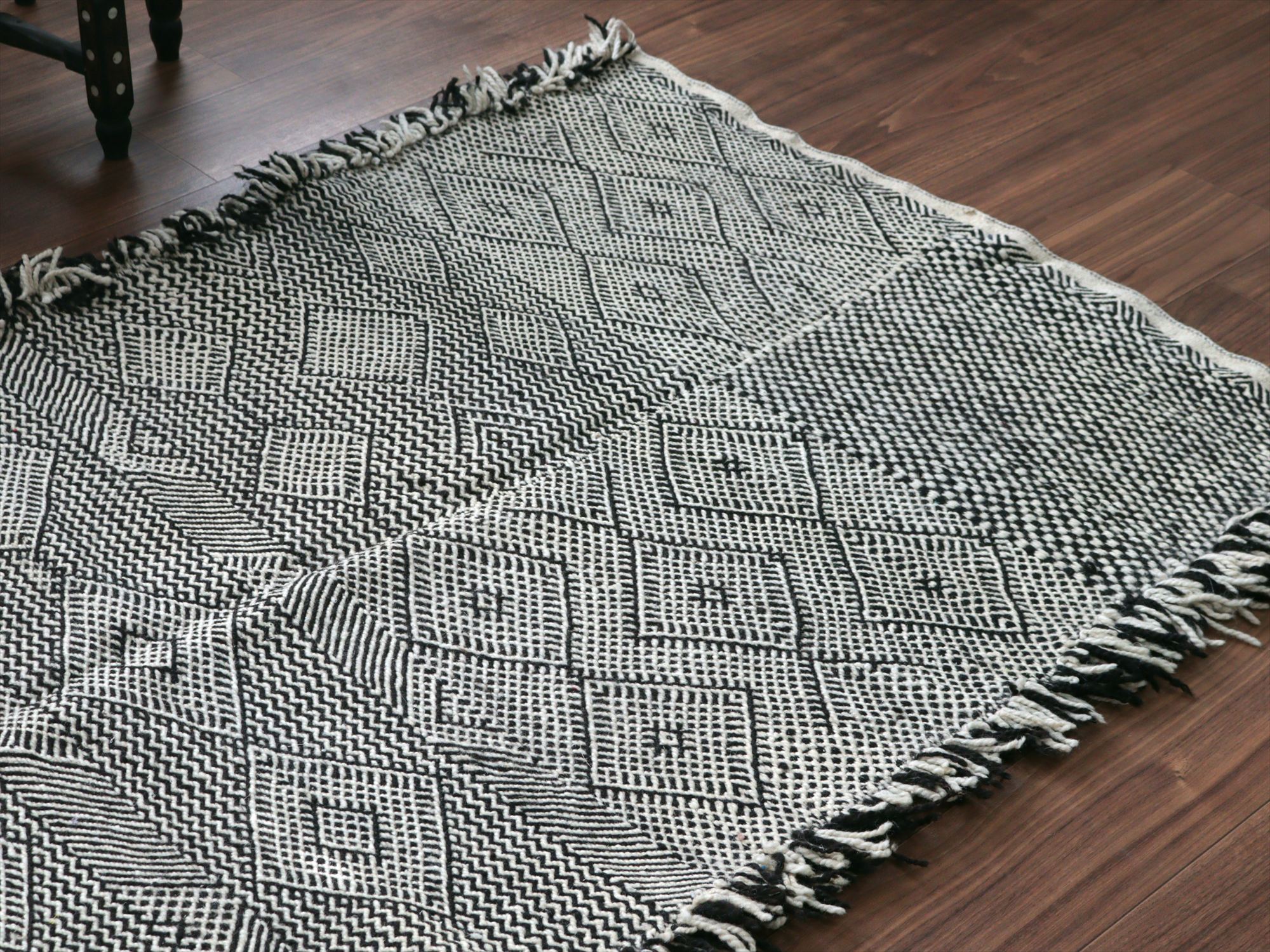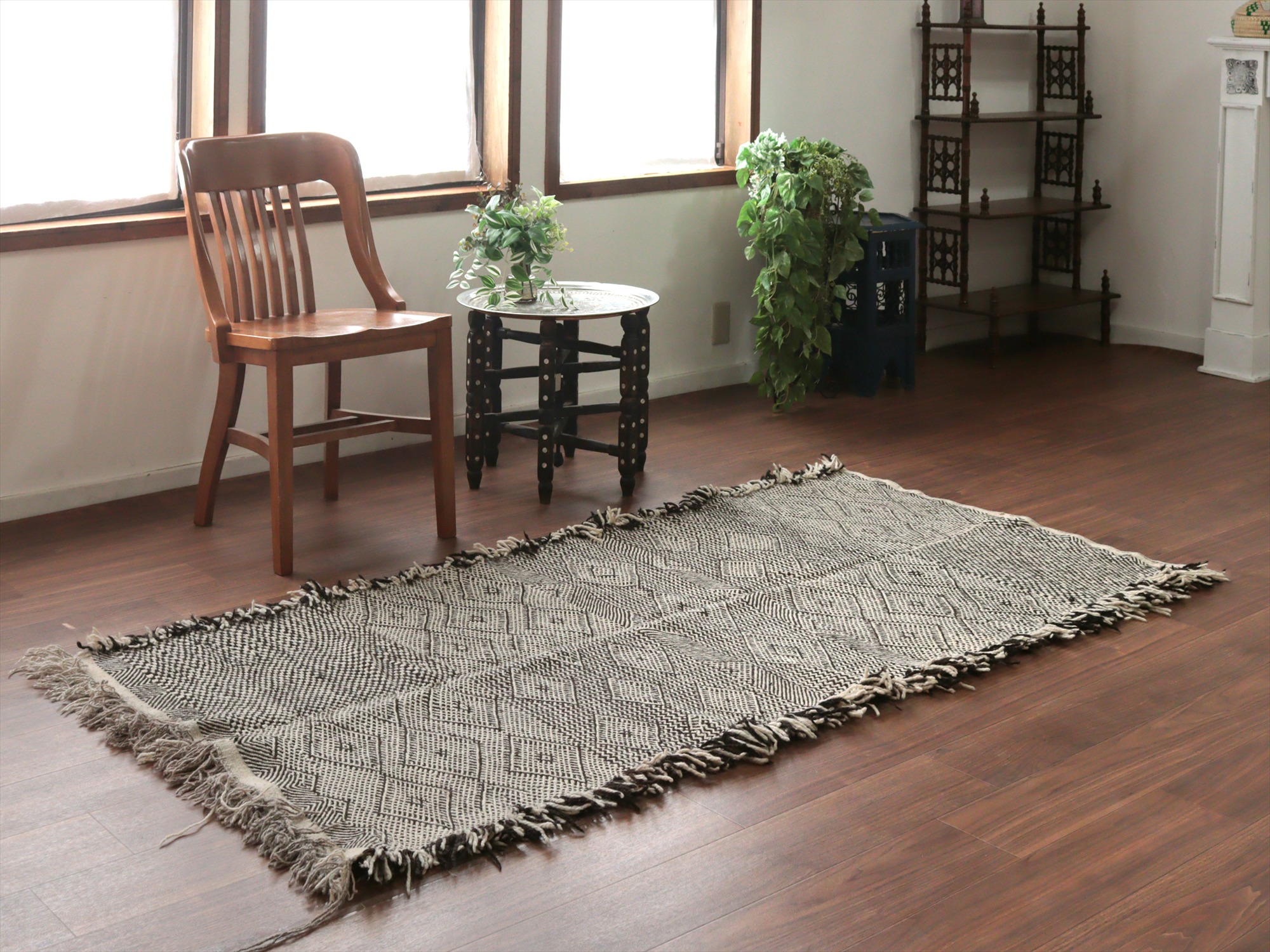 モダンテイストのモノトーンラグです。アイボリーとブラックというシンプルな色使いながらも、デザインが切り替わりながら織られていて、主張しすぎずも程よい存在感を出しています。