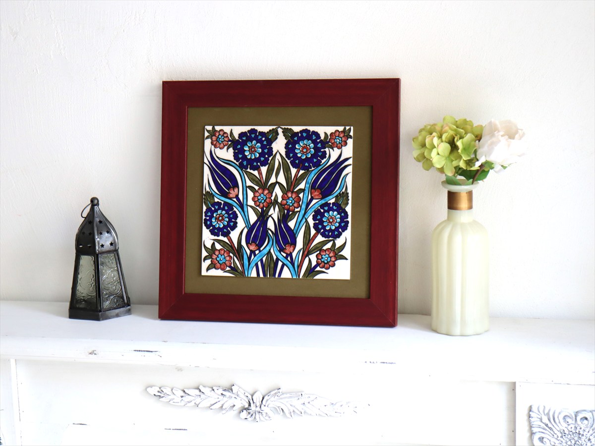トルコ陶器 手書きタイル 1枚額 H32×W32×D1.5cm チューリップ&カーネーション Turkish Hand Paint Tile