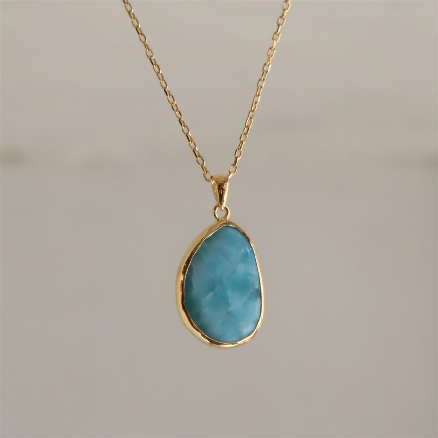 ブルーとホワイトの波模様は、カリブ海の宝石とも呼ばれ、人気の高いストーンのひとつです。こちらのペンダントは、2cm以上もある大粒の良質なラリマーをセレクトしました。