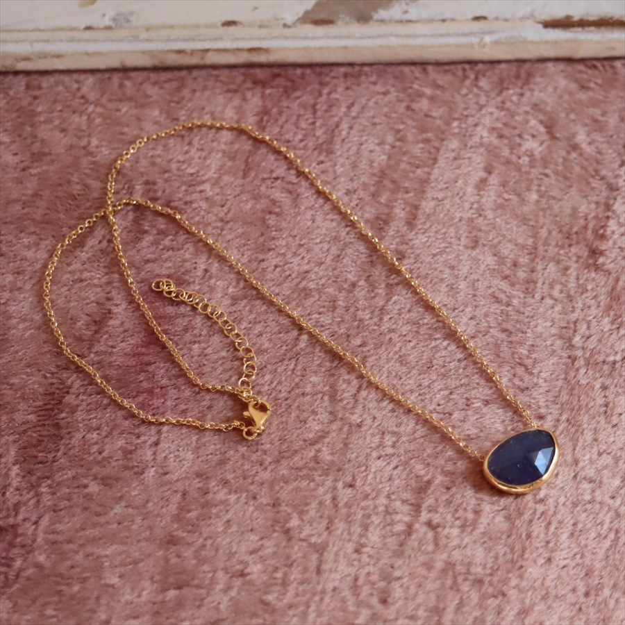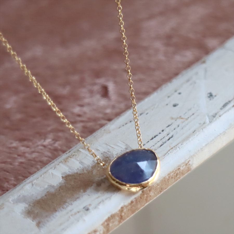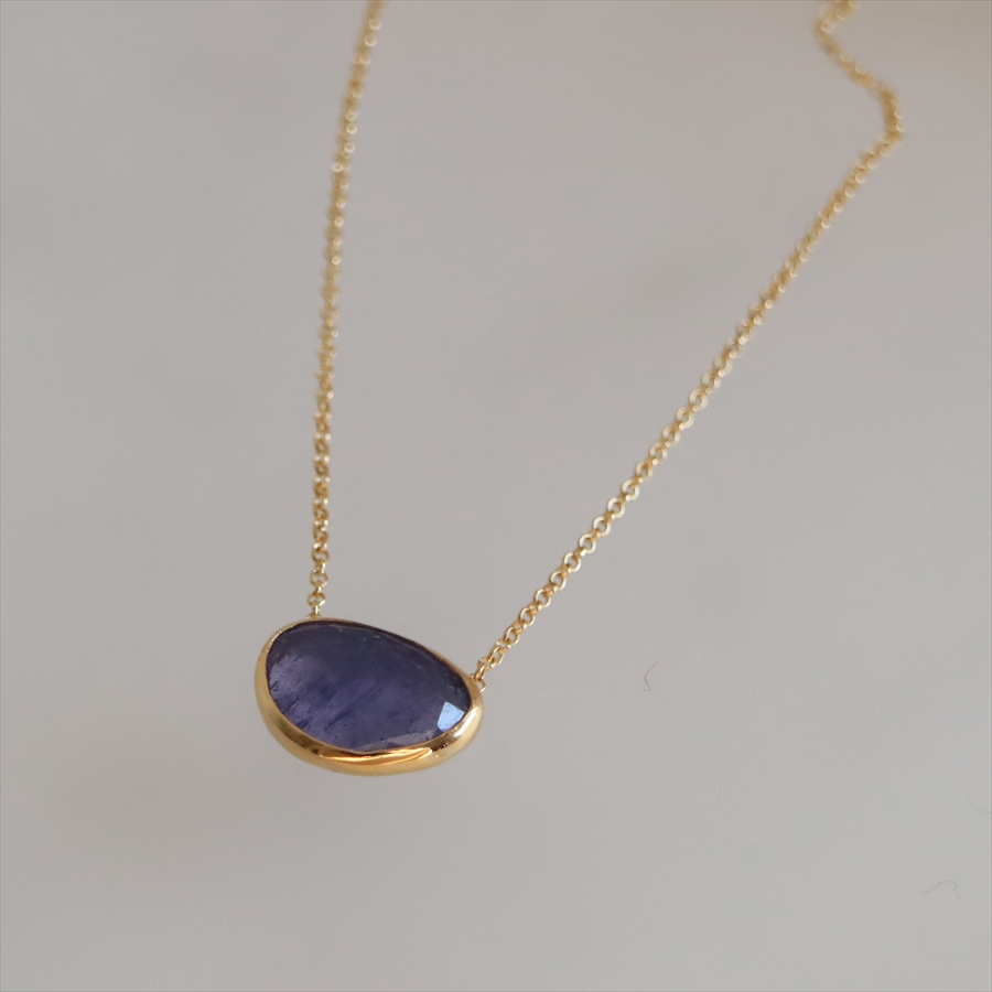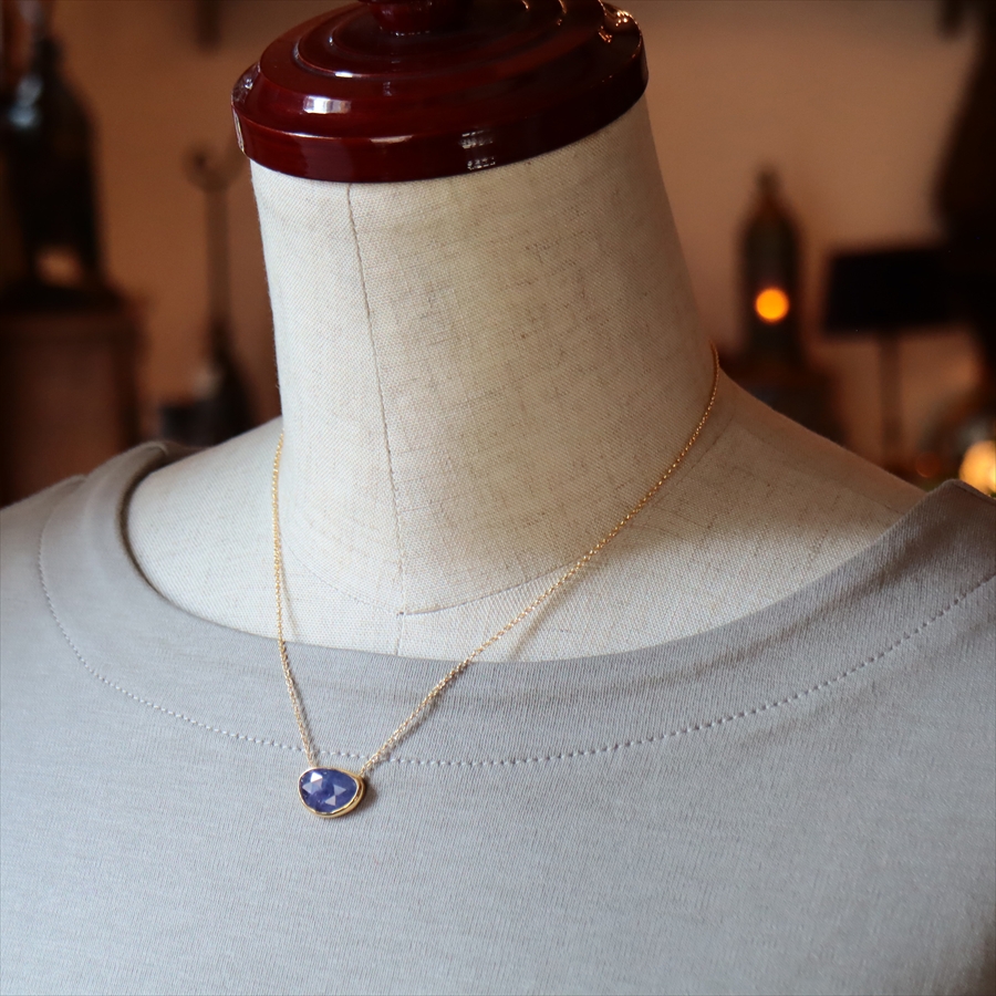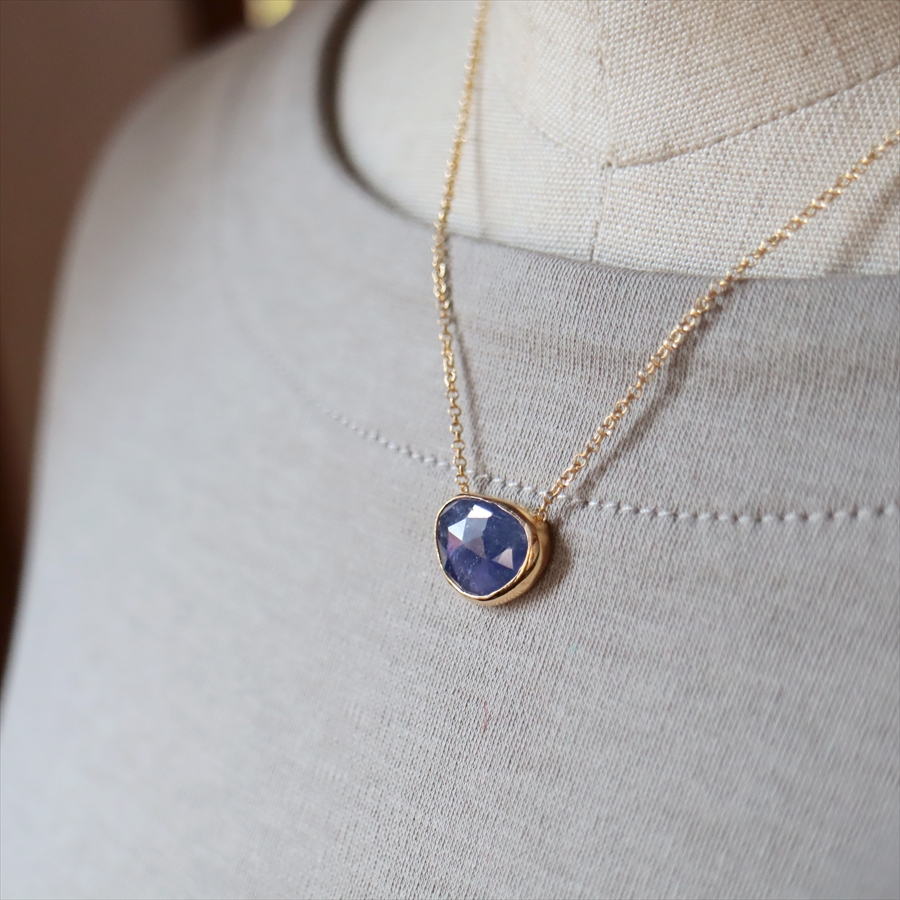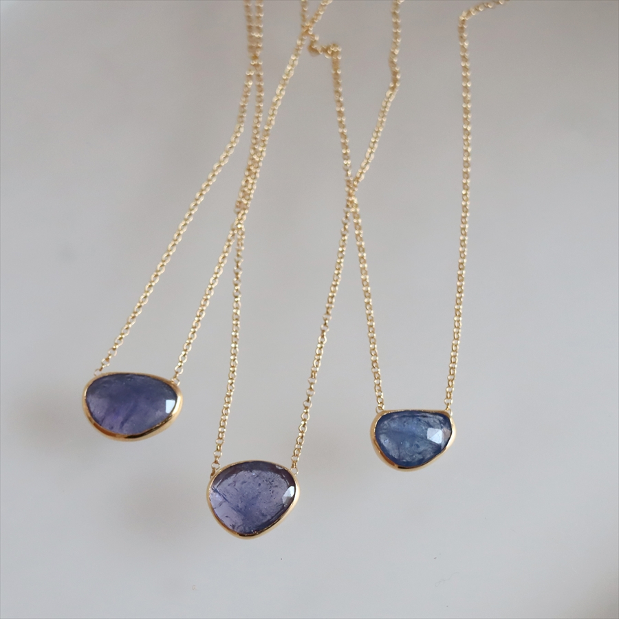 深いブルーからバイオレットまで様々な色をあわせ持つタンザナイトのネックレスです。蛍光灯の下では、きらっとネオンのように光って見えることも。ランダムにカットされた石がハンドメイドらしい温かみを感じられる一点もののネックレスです。