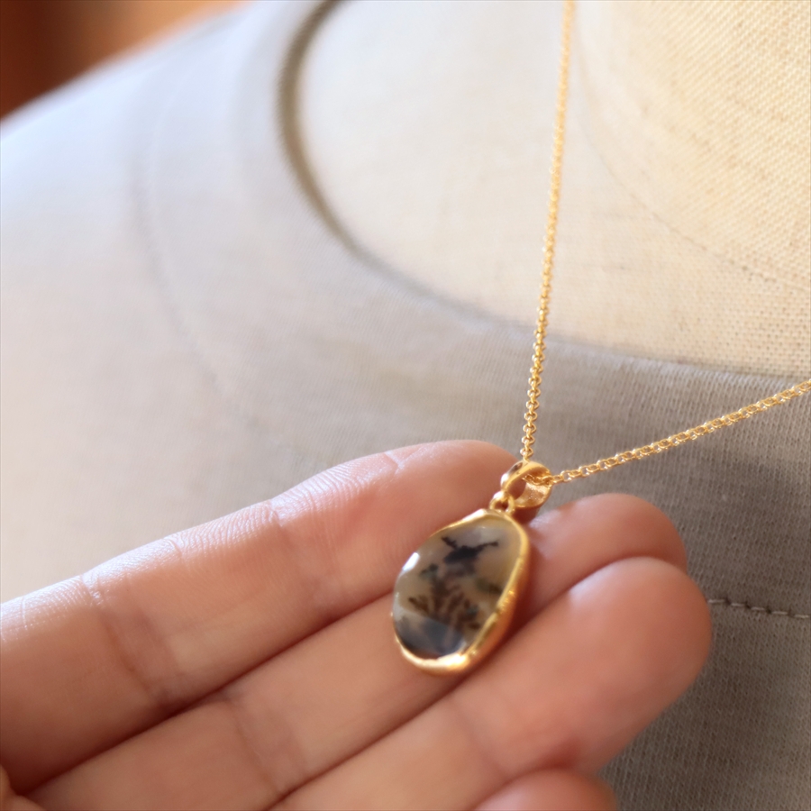まるで樹木のシルエットのよう!でもこれは自然が創り出した鉱物の結晶が、枝のように広がったものなのだそうです。霧の中にたたずむ森や、冬枯れの枝先のようにも見えるその姿は、眺めるたびに想像をかき立てる幻想的な美しさを秘めています。同じものはふたつとない、地球からの贈り物です。自然が描いた小さな風景を、そっと身にまとってみてくださいね。