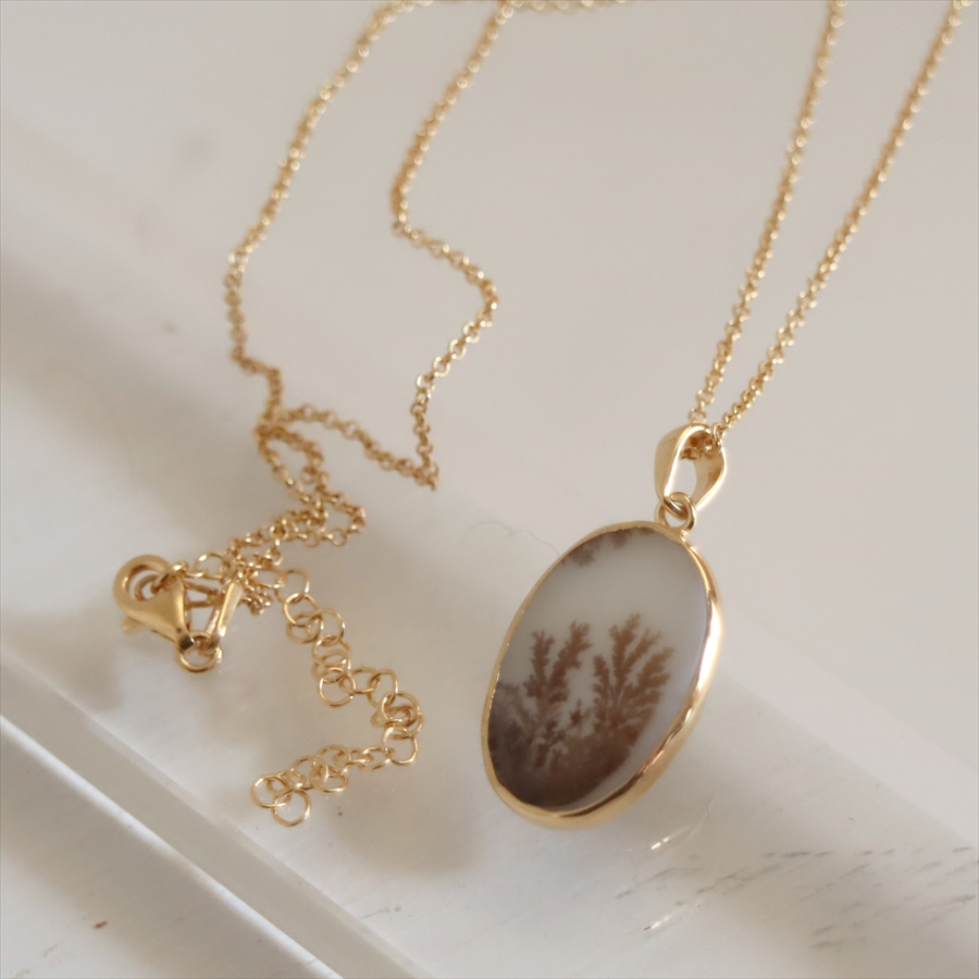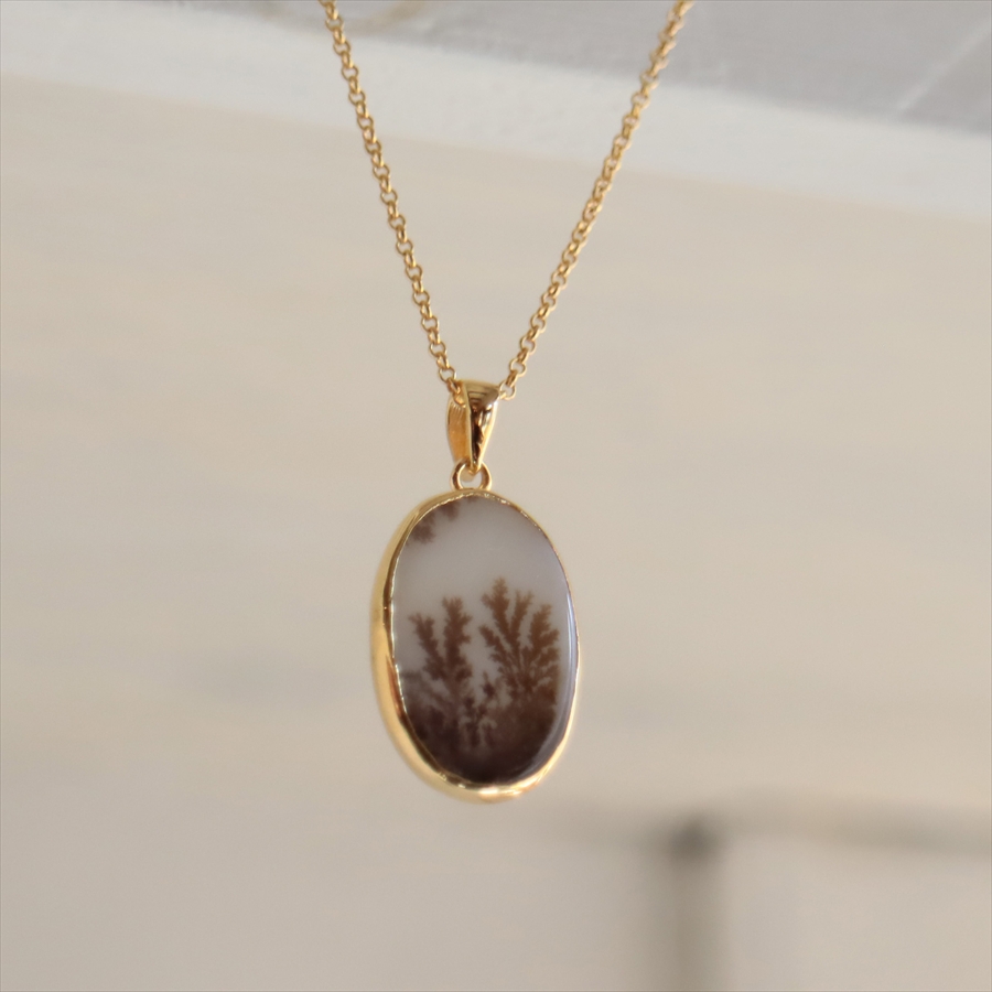 まるで樹木のシルエットのよう!でもこれは自然が創り出した鉱物の結晶が、枝のように広がったものなのだそうです。霧の中にたたずむ森や、冬枯れの枝先のようにも見えるその姿は、眺めるたびに想像をかき立てる幻想的な美しさを秘めています。同じものはふたつとない、地球からの贈り物です。自然が描いた小さな風景を、そっと身にまとってみてくださいね。