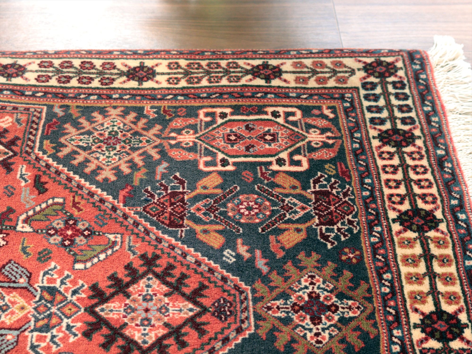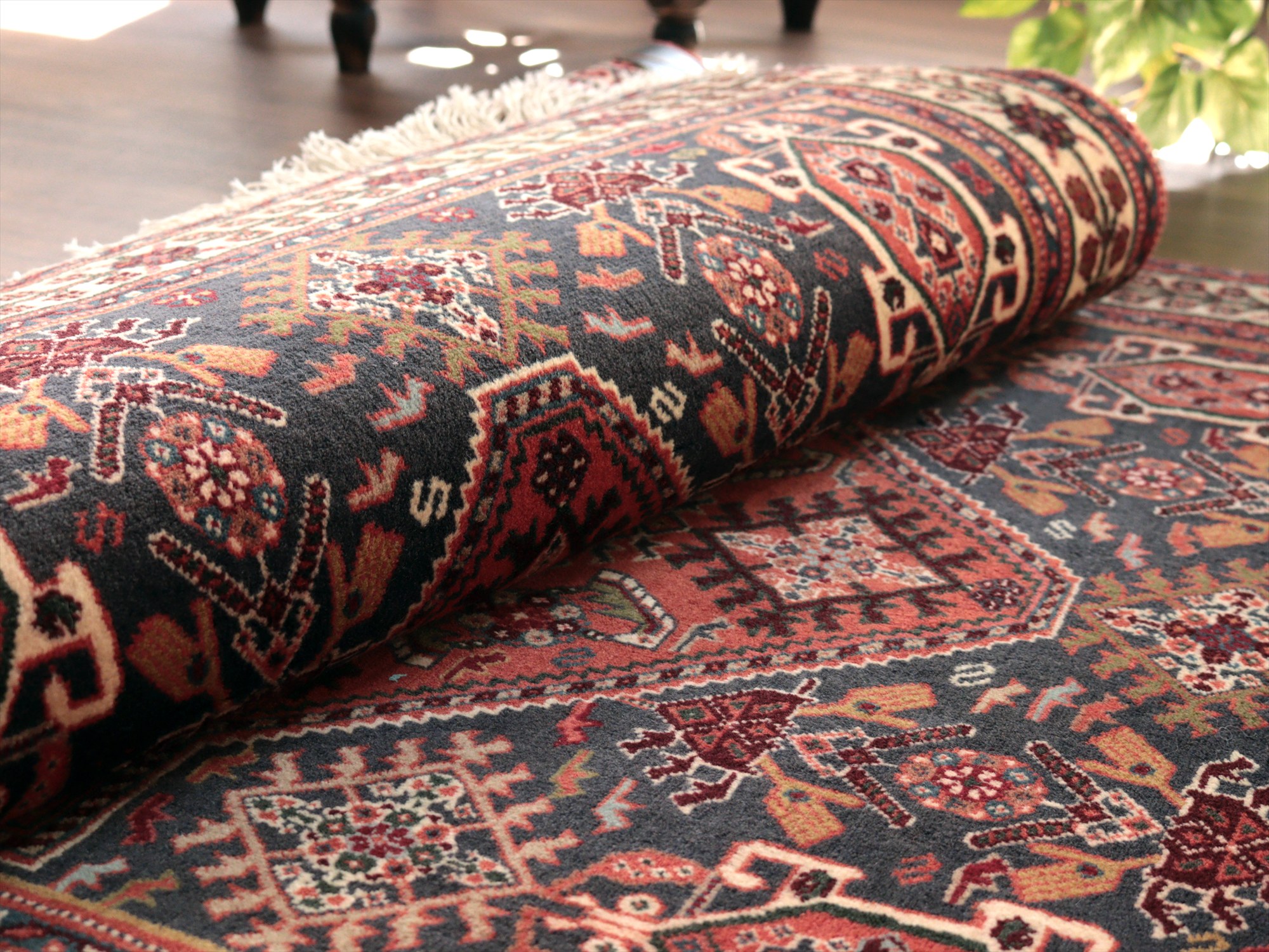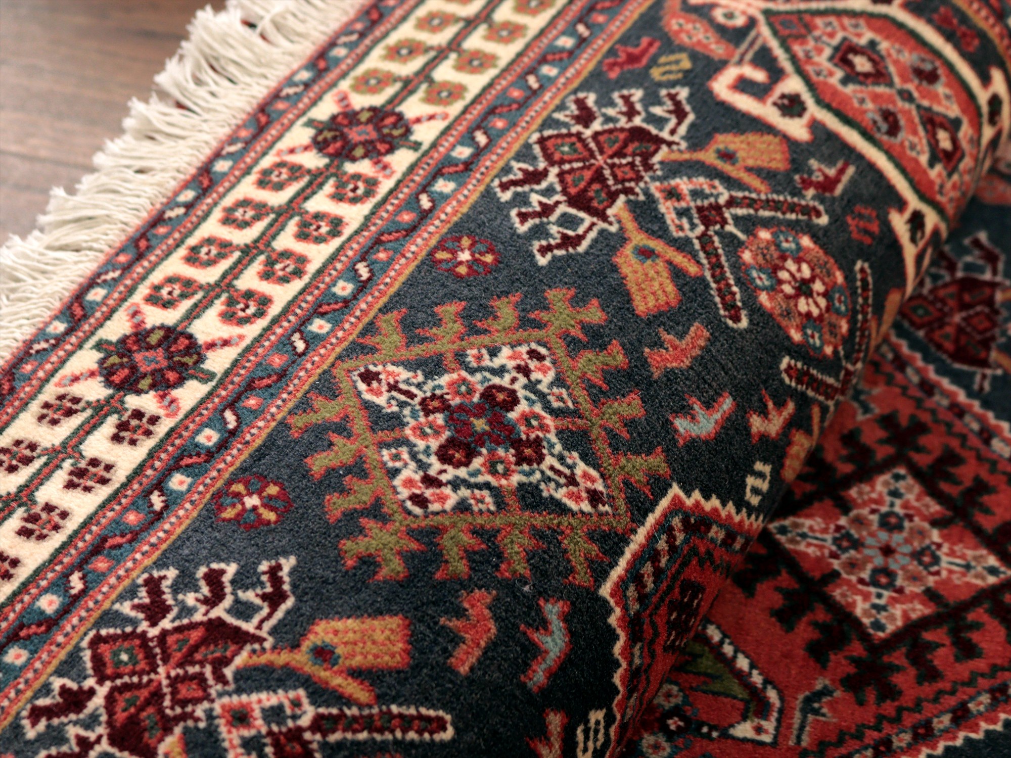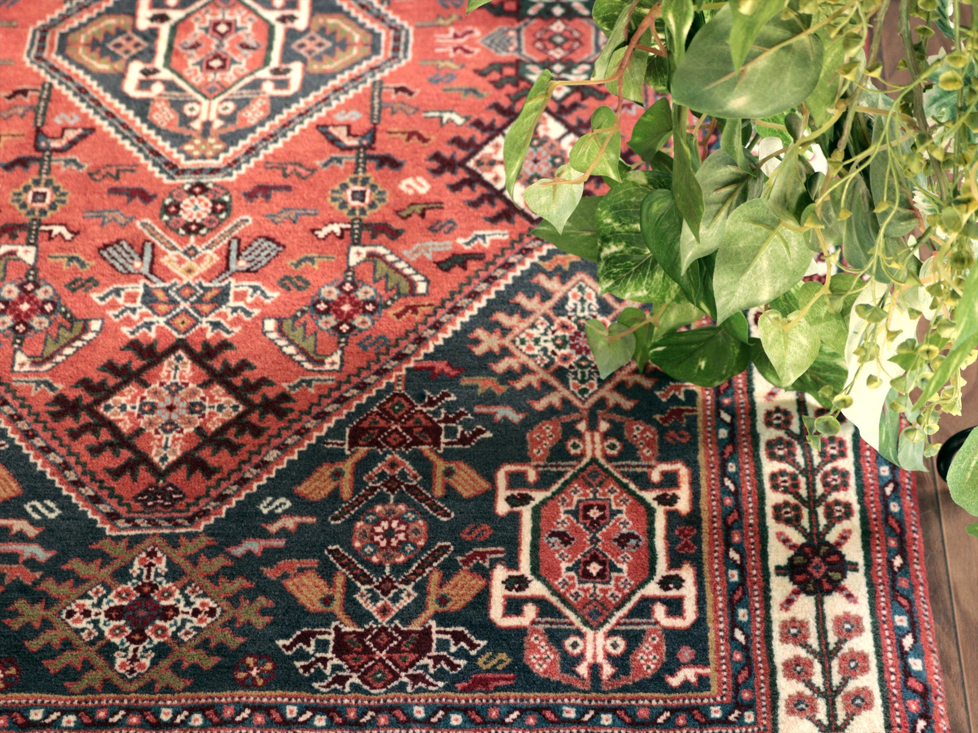 朱色に近いレッドと、グレーがかったネイビーの色使いで中央にメダリオンがおかれたカシュカイ族の手織り絨毯。幾何学模様や小花など、一面にモチーフがしっかりと織り込まれています。存在感を感じられる1枚ですが、発色はやや淡い色合いに抑えられているのでお部屋に程よく馴染みそうです。