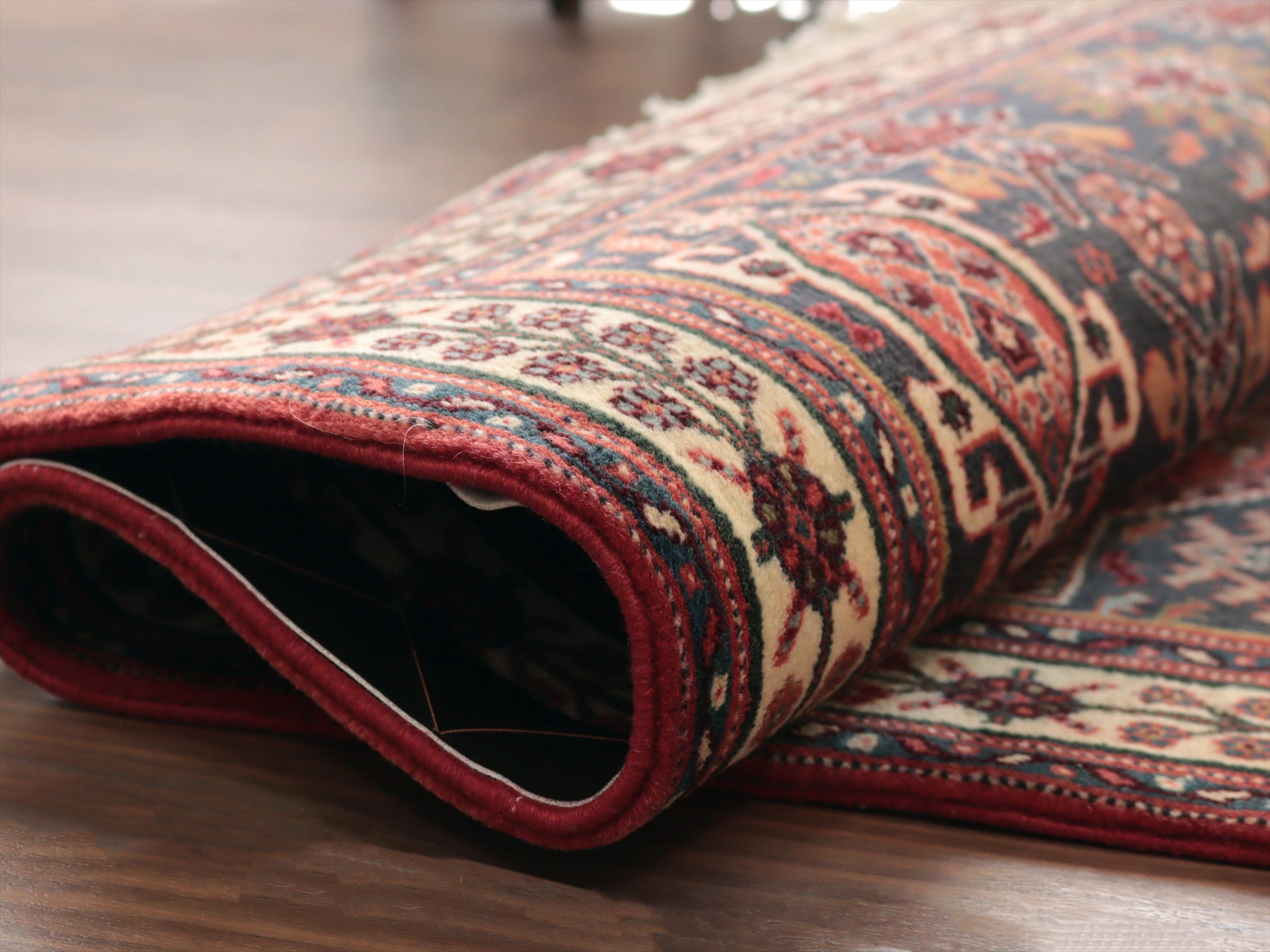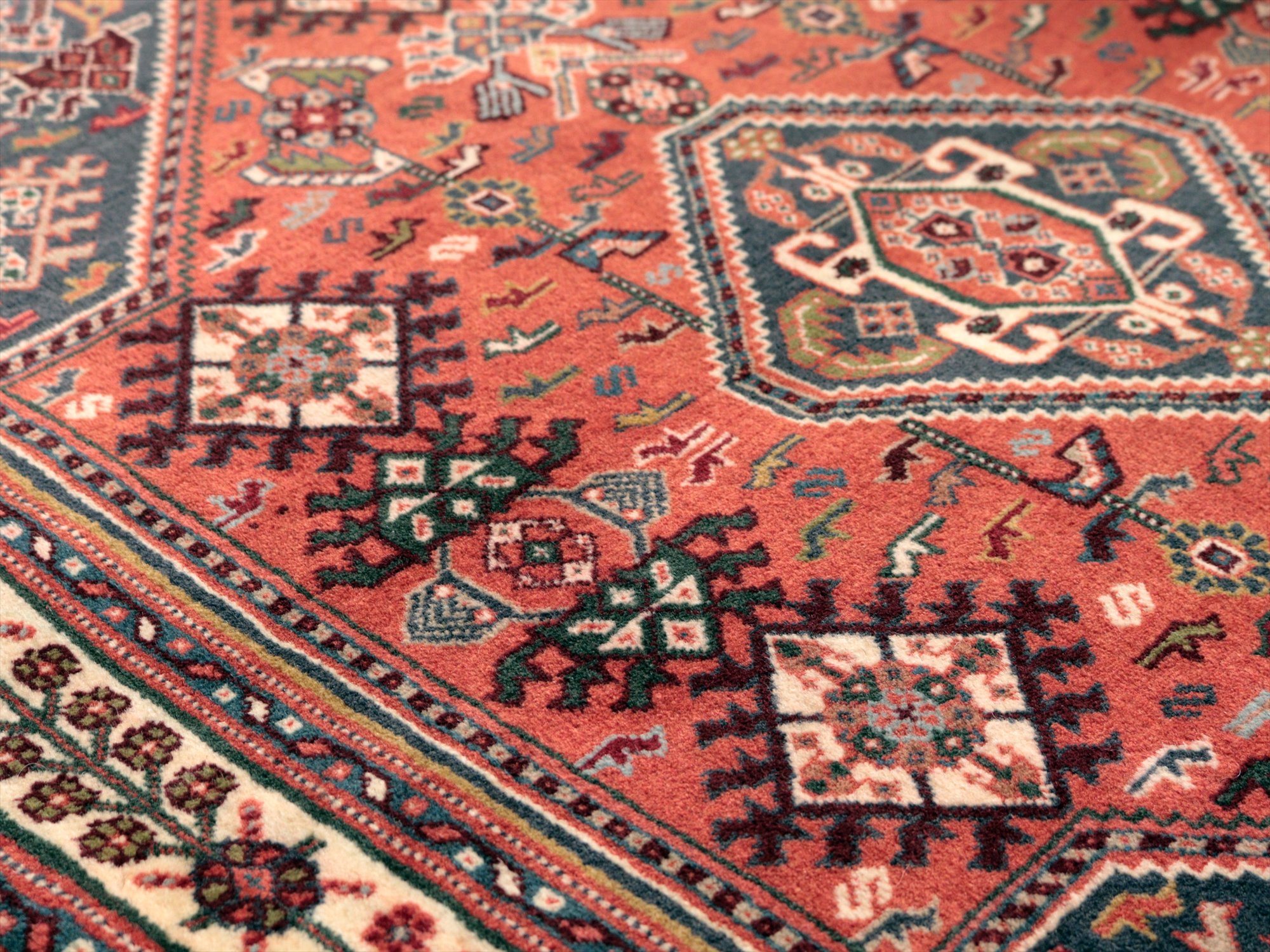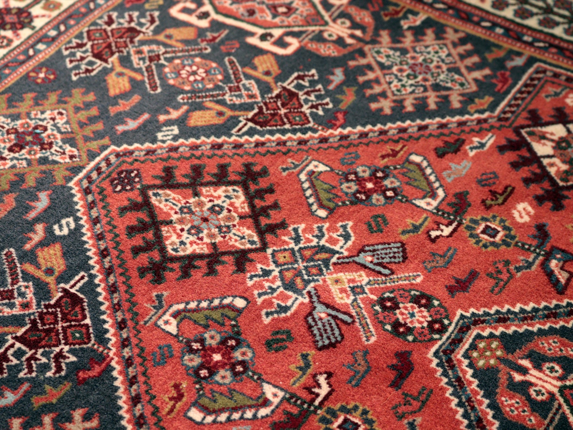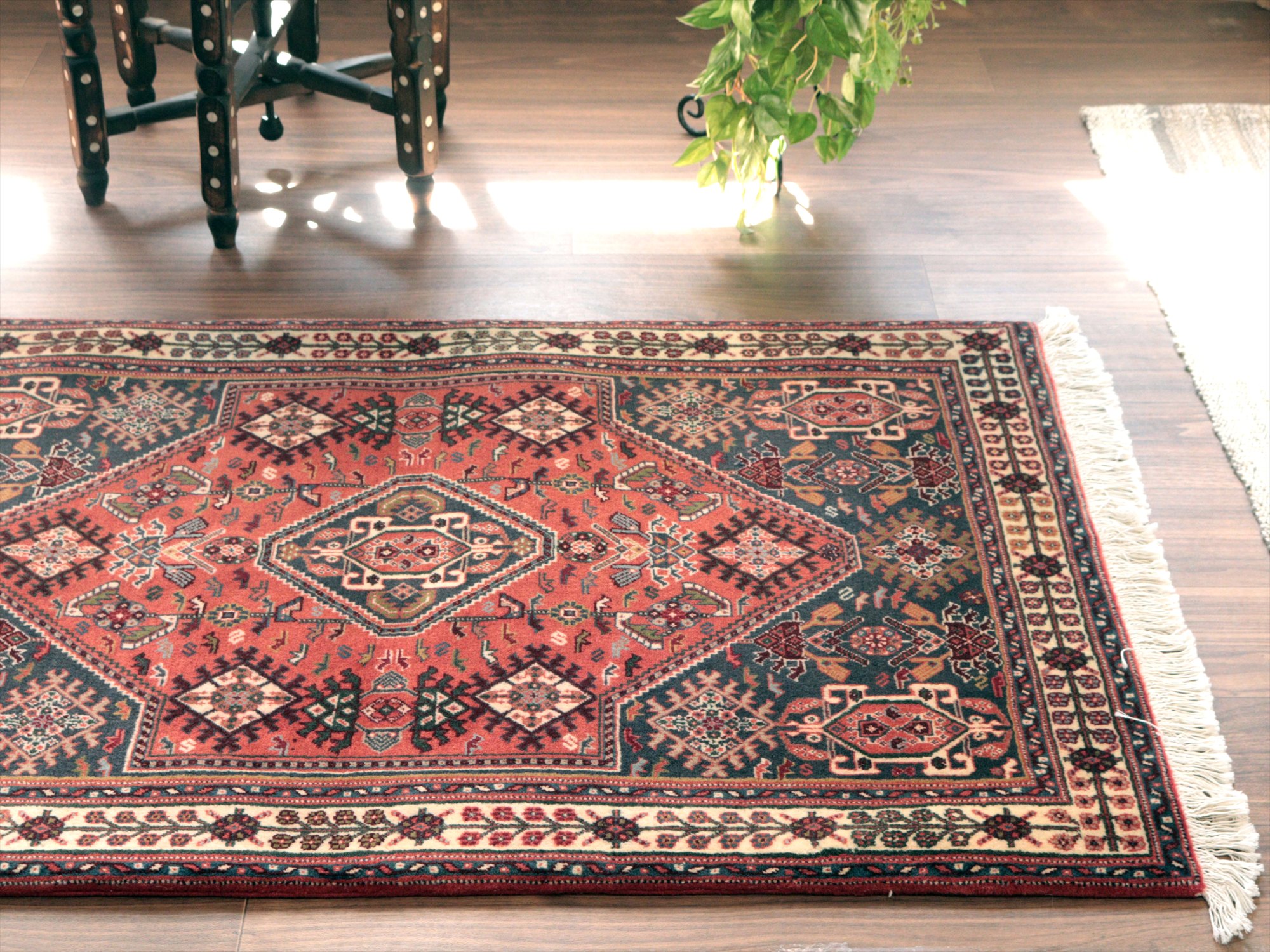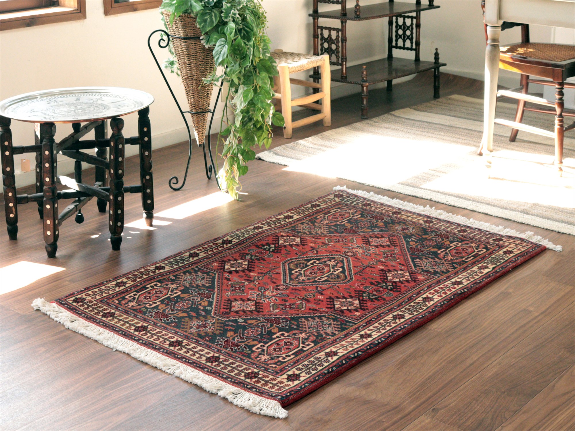 朱色に近いレッドと、グレーがかったネイビーの色使いで中央にメダリオンがおかれたカシュカイ族の手織り絨毯。幾何学模様や小花など、一面にモチーフがしっかりと織り込まれています。存在感を感じられる1枚ですが、発色はやや淡い色合いに抑えられているのでお部屋に程よく馴染みそうです。