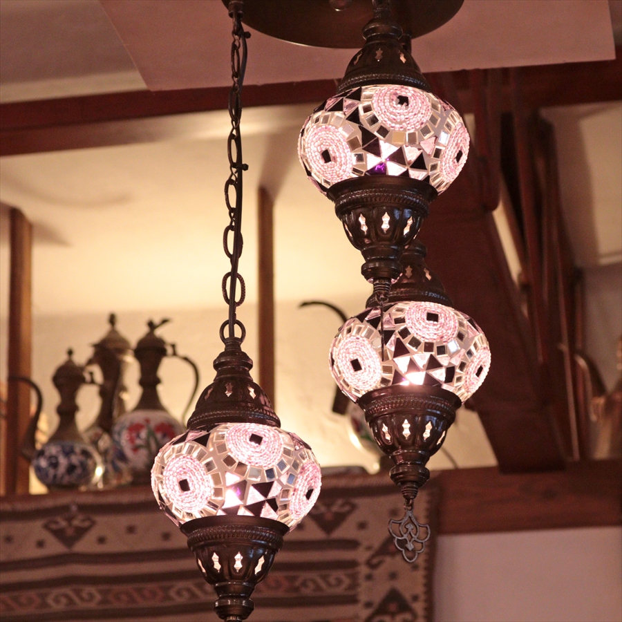 モザイクランプ トルコランプ シャンデリア 3灯 全高60cm 直径27cm パープル 【天井工事必要】