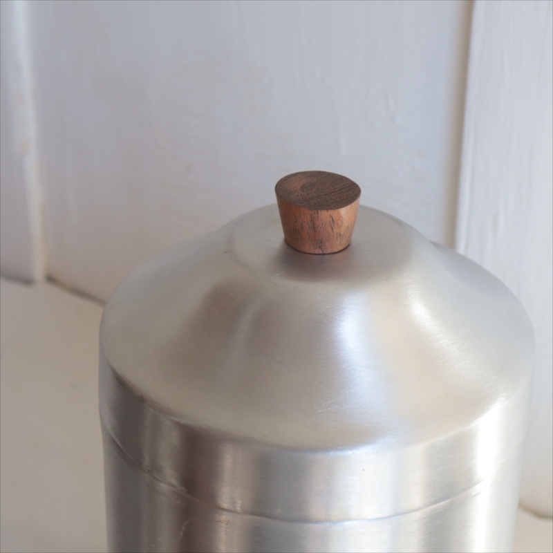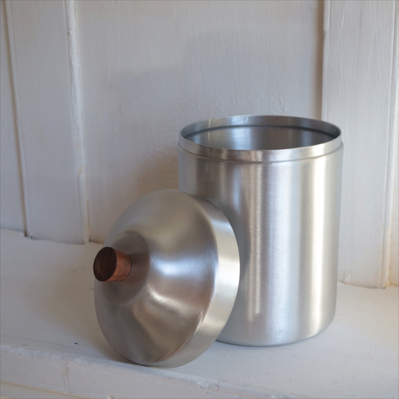 シンプルなアルミキャニスター。持ち手は木製(アカシア材)で、無機質になりすぎず、温かみのある雰囲気です。オリジナルのラベルを貼ったり、文字をペイントしたり、カフェ風のディスプレイにもぴったりです。