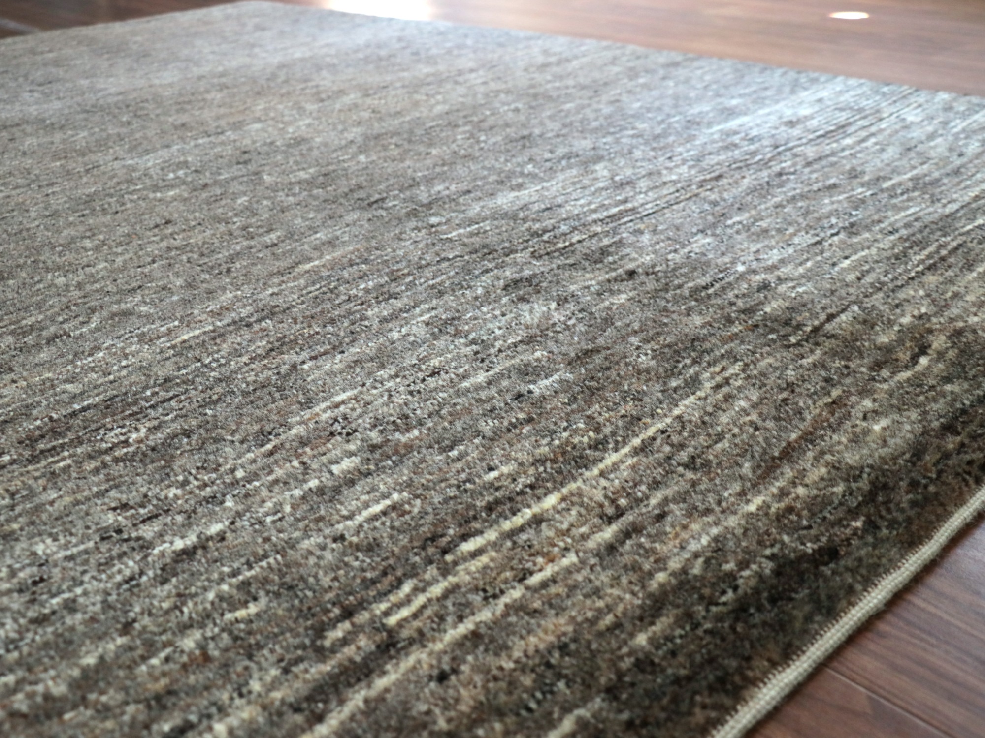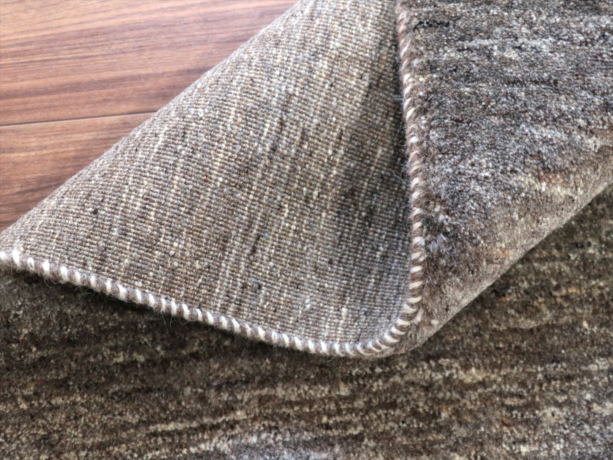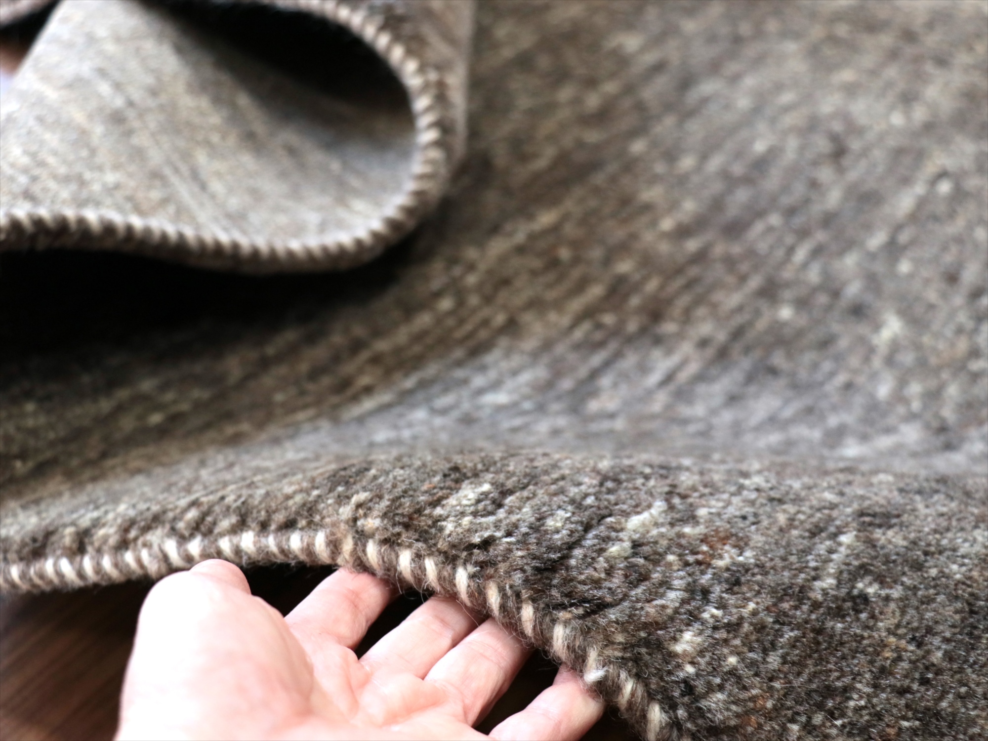 染められていない羊毛を使って織られたシンプルな無地のギャッベ。天然のウールの色合いの自然なグラデーションがよく出ています。遠目からみるとグレーですが、全体にブラウン系の色、濃淡の違うグレー、どころどころに明るめのグレーがストライプ状に重なっていて、クレヨンで塗りつぶしたような雰囲気。
