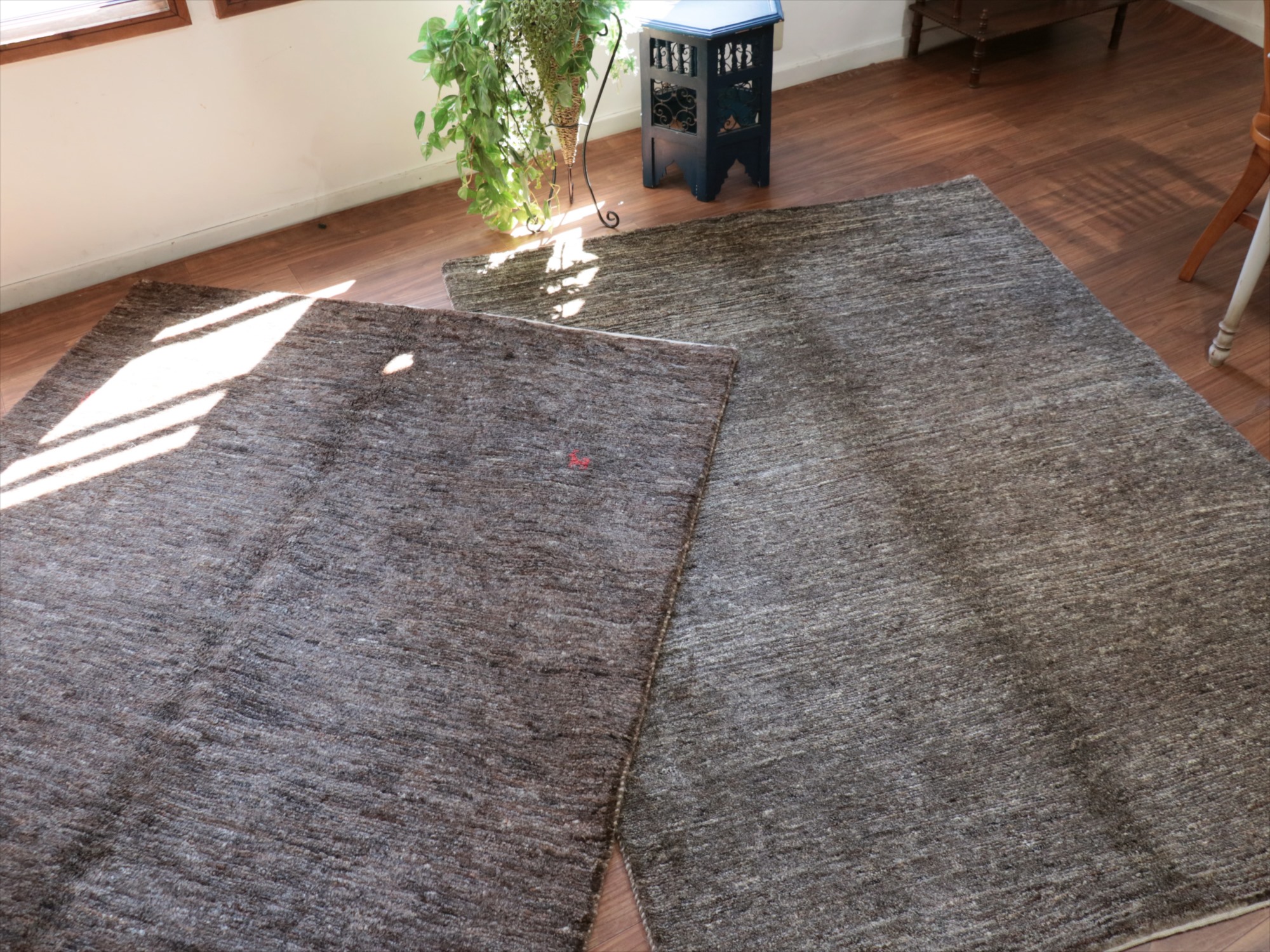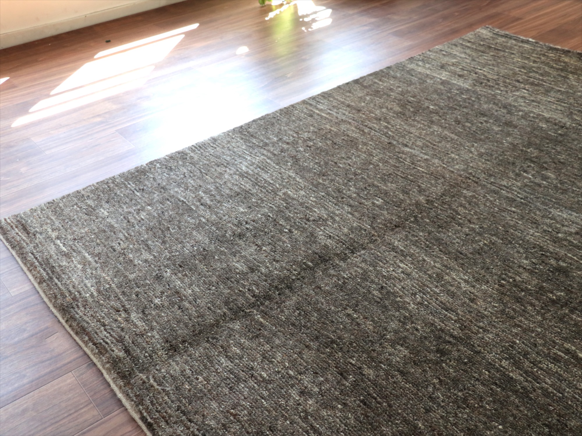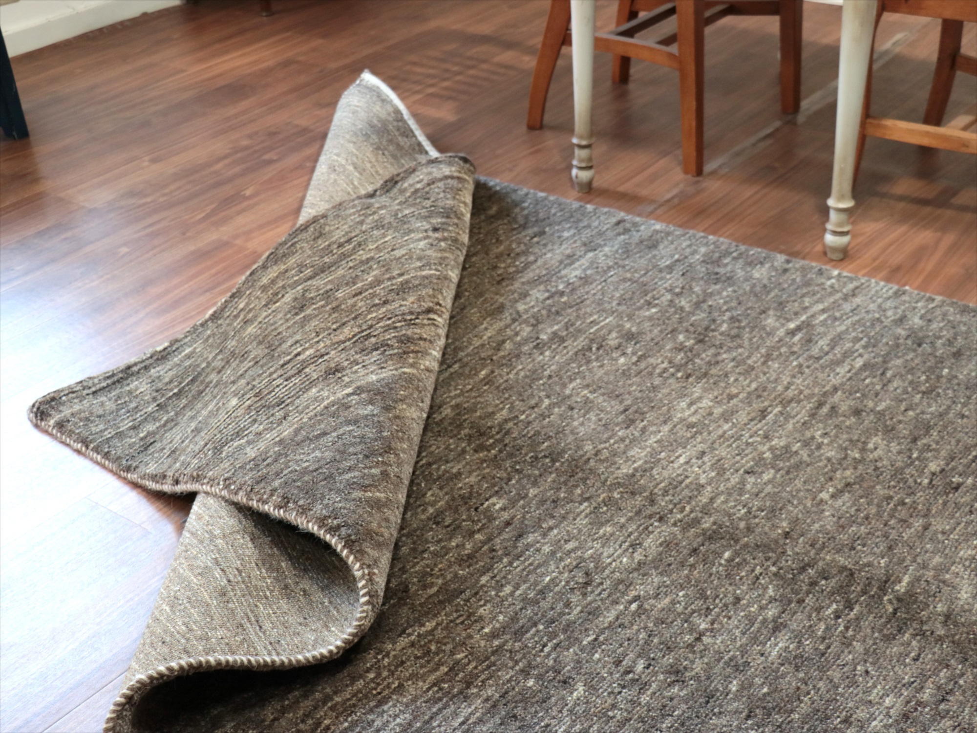 染められていない羊毛を使って織られたシンプルな無地のギャッベ。天然のウールの色合いの自然なグラデーションがよく出ています。遠目からみるとグレーですが、全体にブラウン系の色、濃淡の違うグレー、どころどころに明るめのグレーがストライプ状に重なっていて、クレヨンで塗りつぶしたような雰囲気。