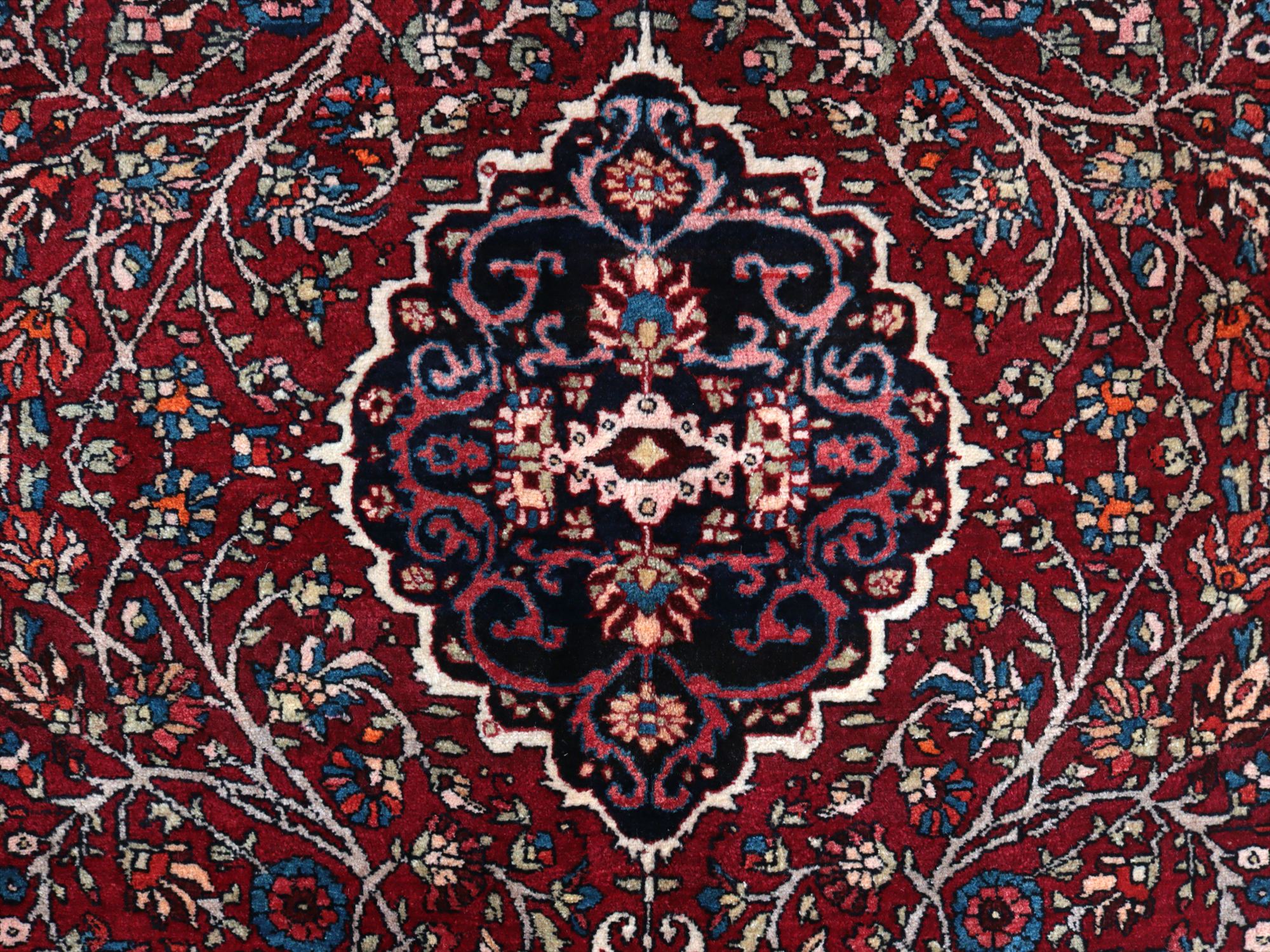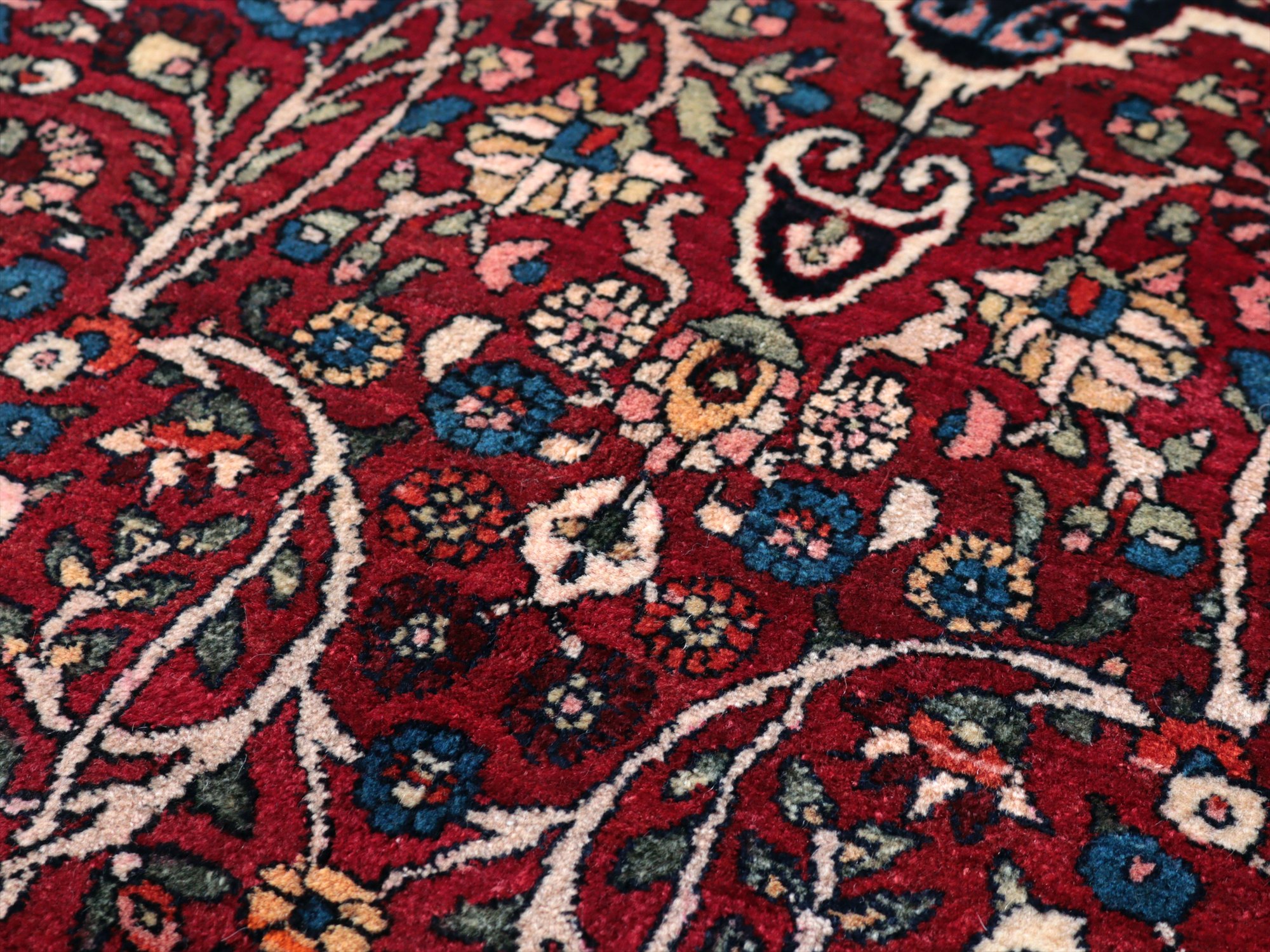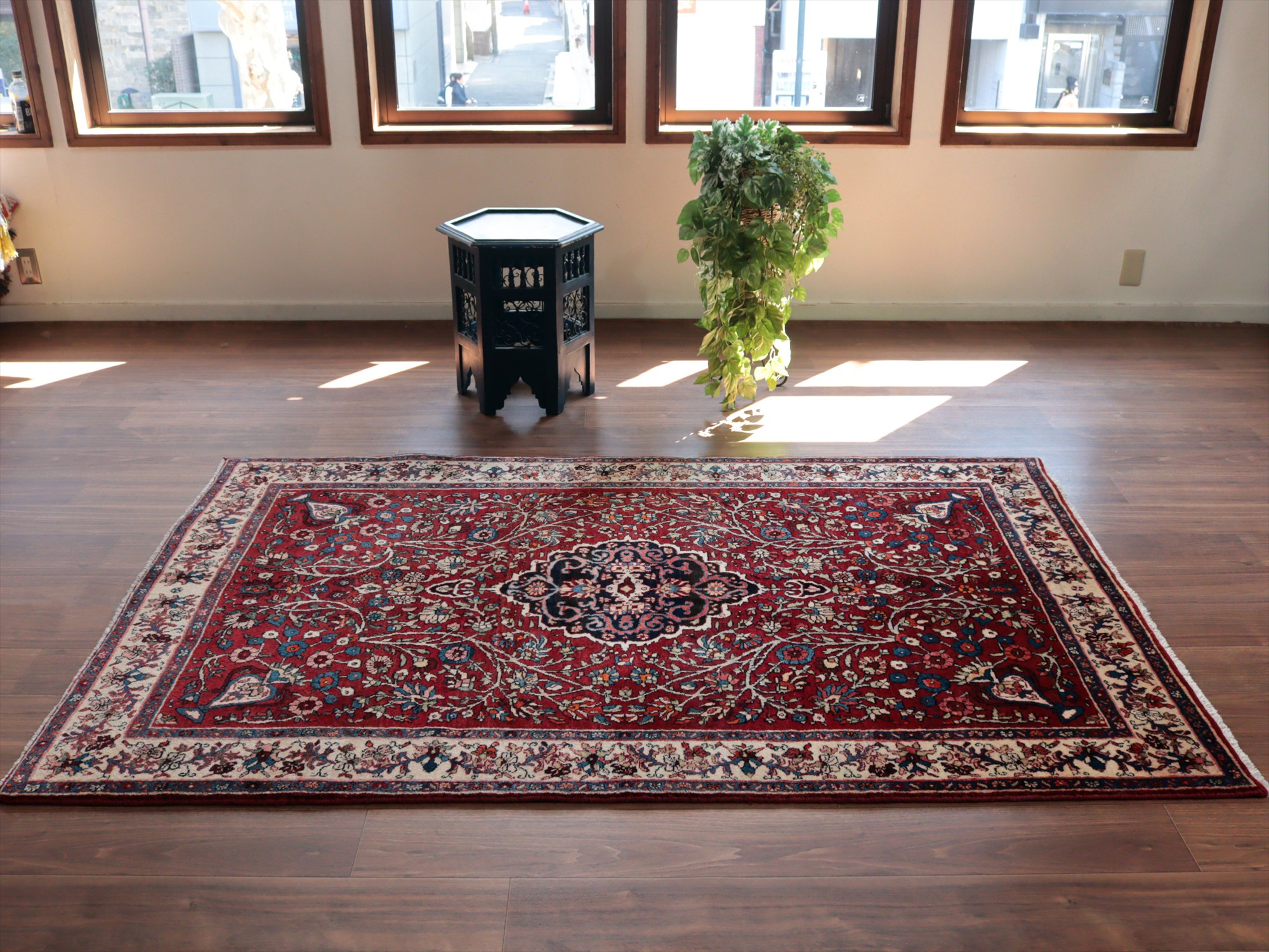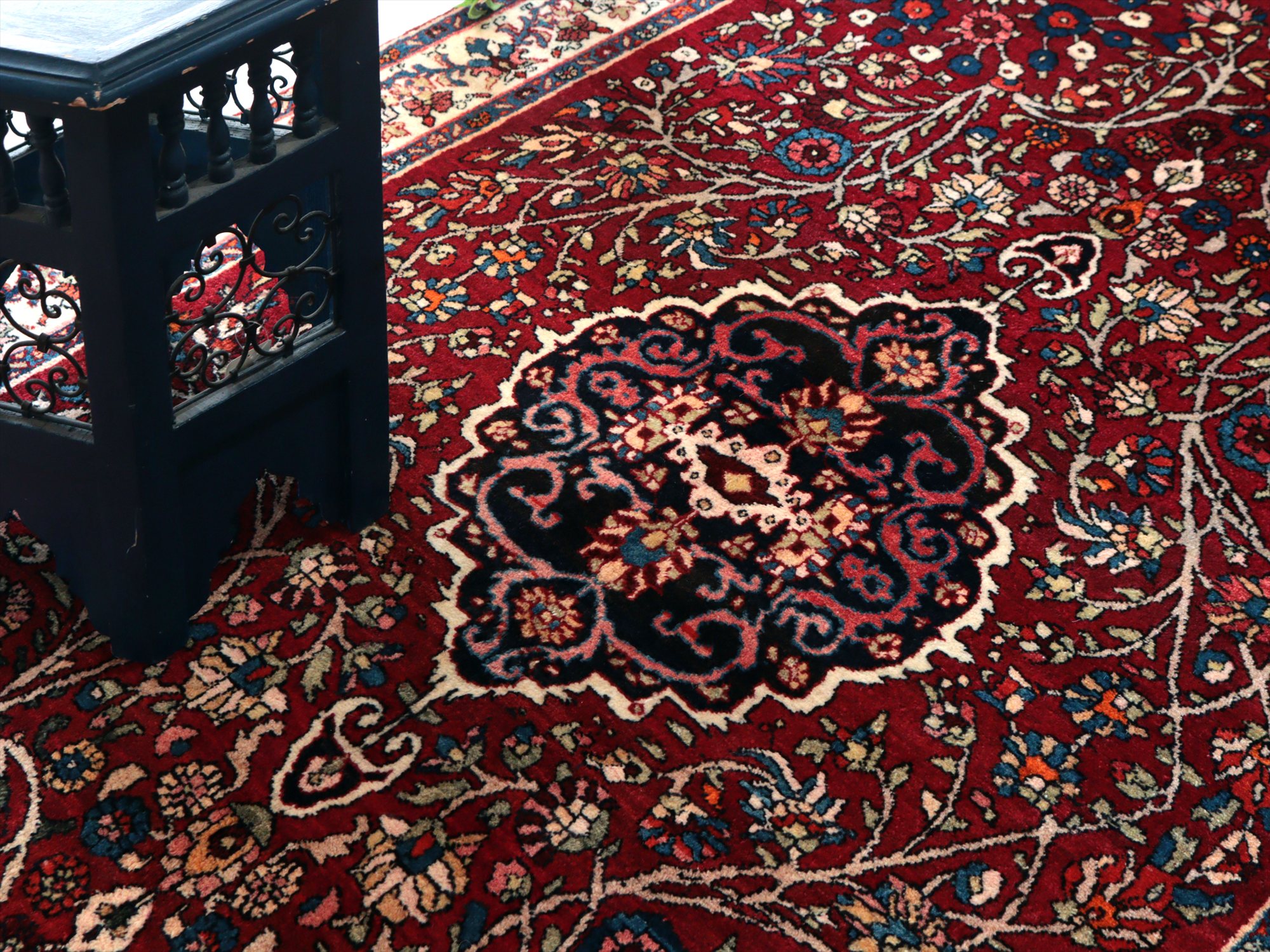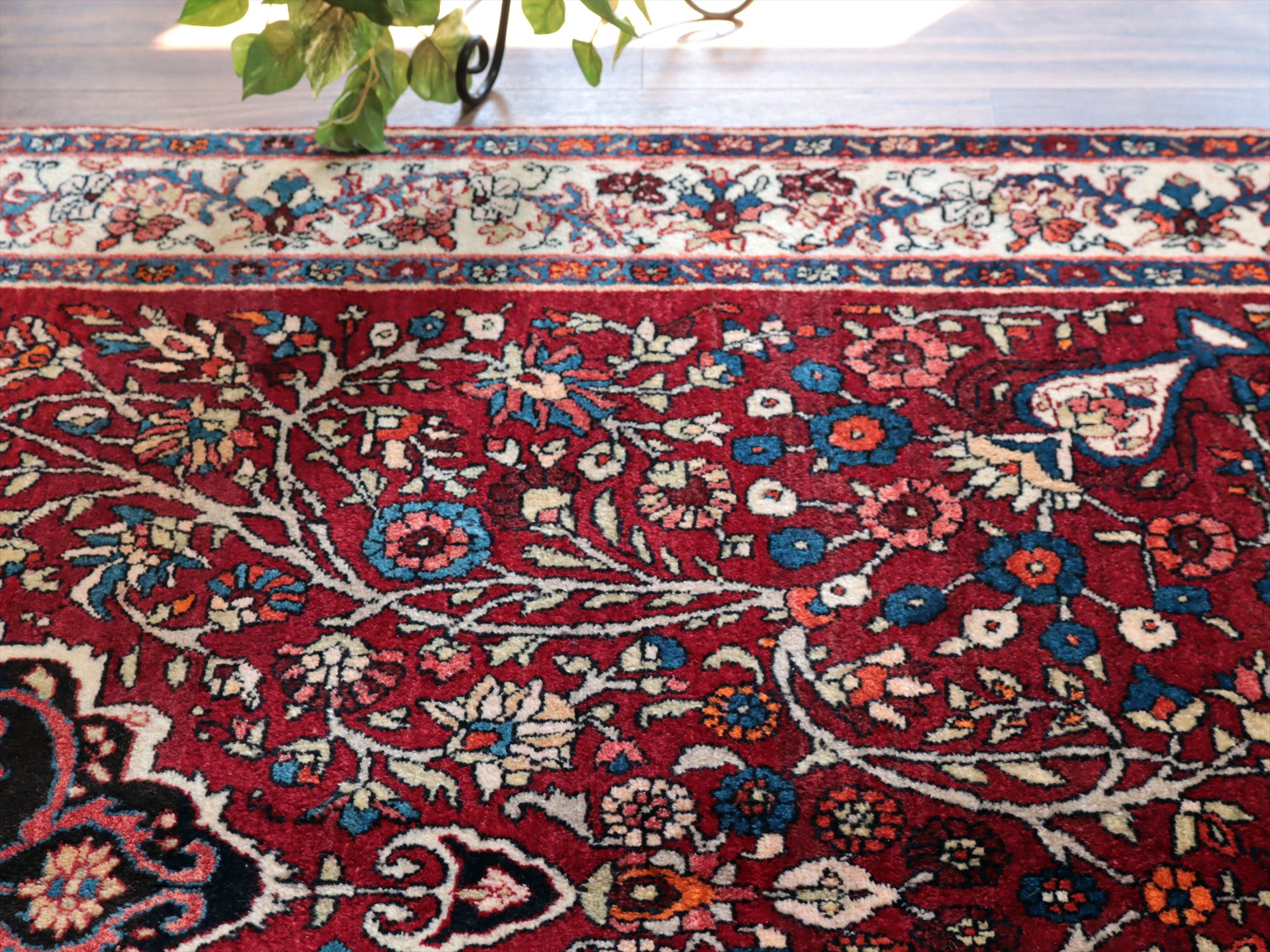 テヘランの南西に位置する都市サーヴェの絨毯。深いボルドーベースに、曲線を用いて、華やかな花のデザインが一面に広がるように織られた優美でエレガントなデザイン。ボーダー(額縁)部分はやさしい色合いのベージュでしめていて、バランスのとれた1枚です。