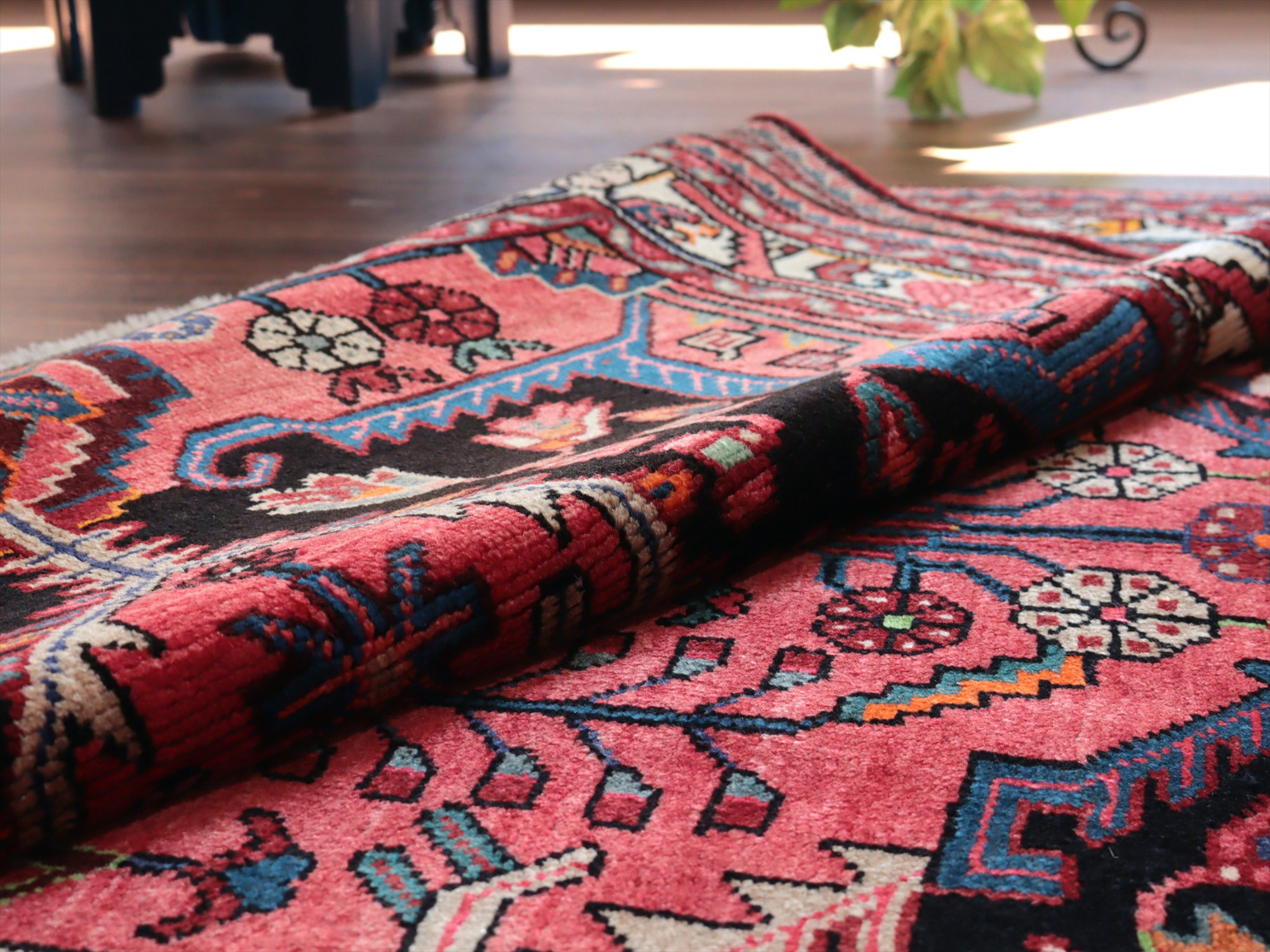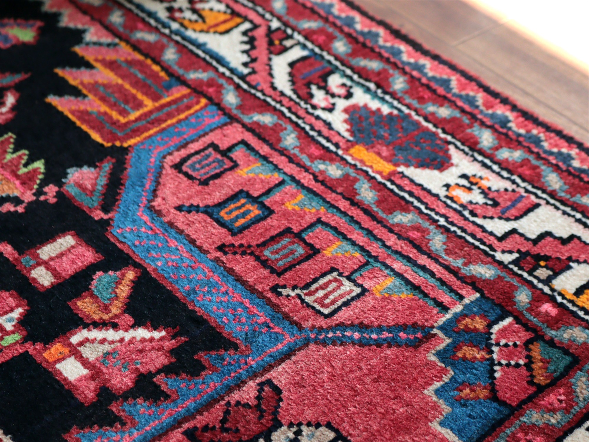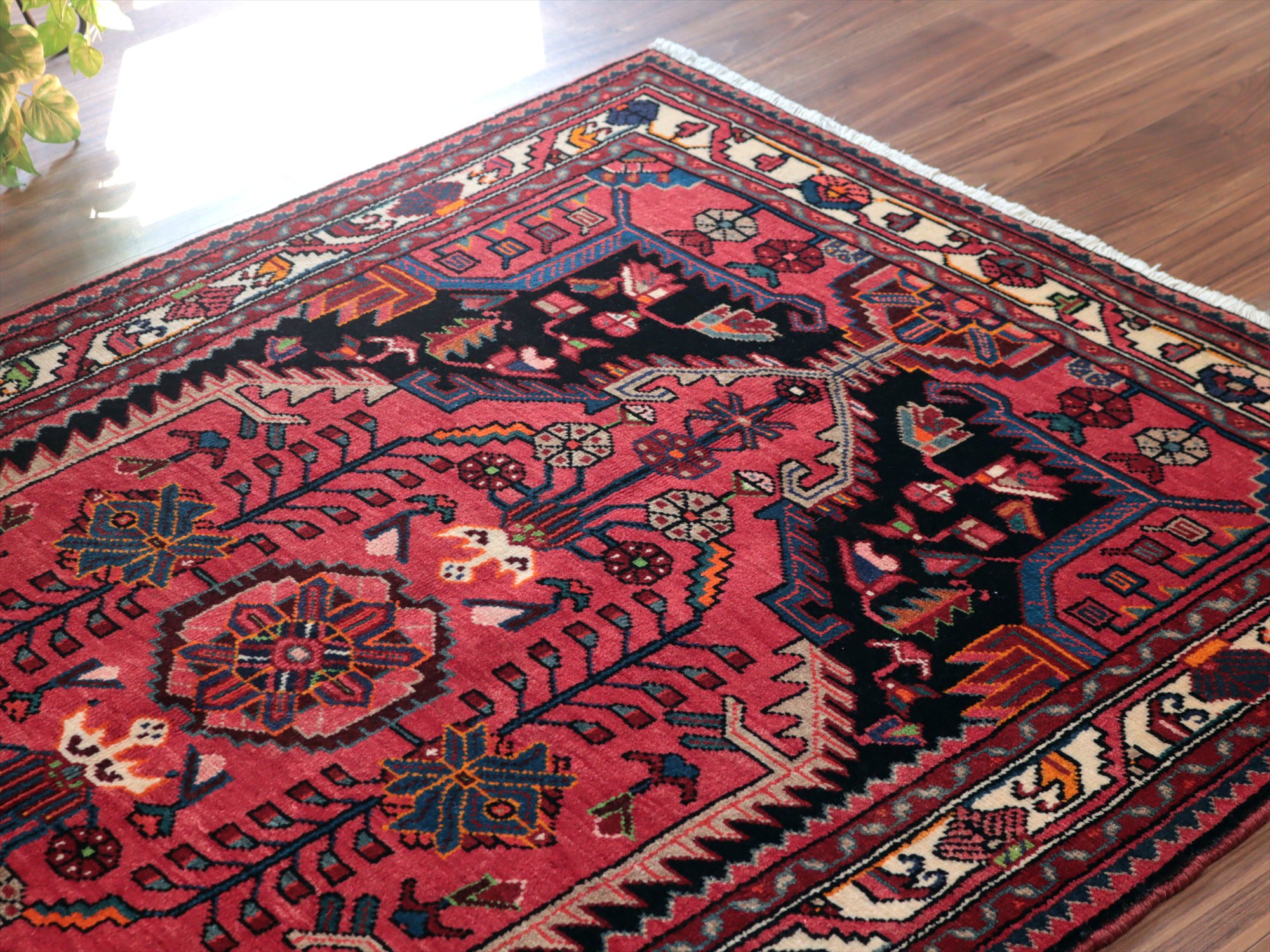 イラン西部ハマダン地方の山岳エリア、トイセルカンという町で織られています。均整の取れたメダリオンを中心とし、草花のモチーフが全面に飾るように織られたデザインが特徴的です。朱色に近いレッドと、深いネイビーを基調とした色使いで、ボーダー部分はベージュでやわらかく締めています。