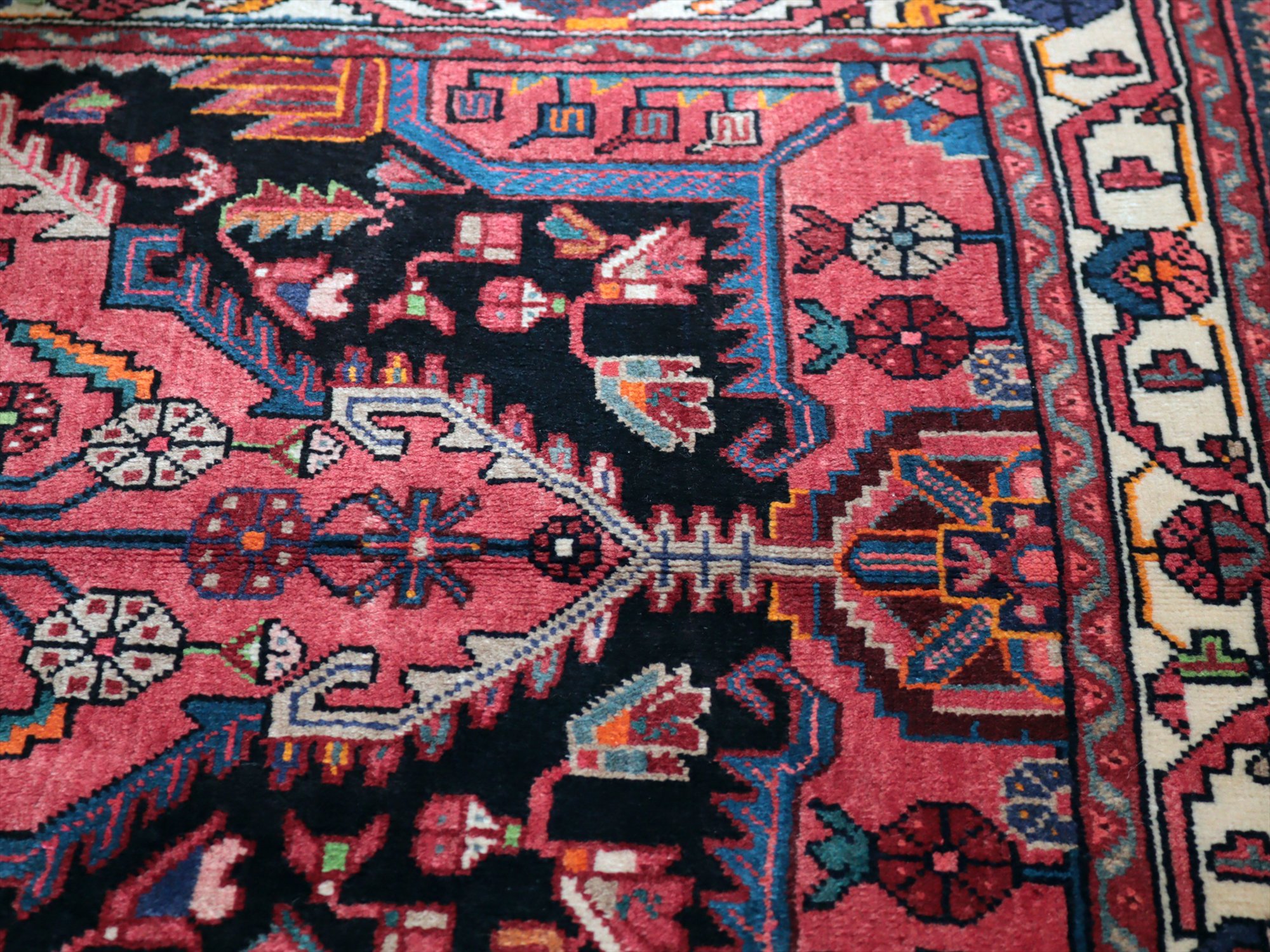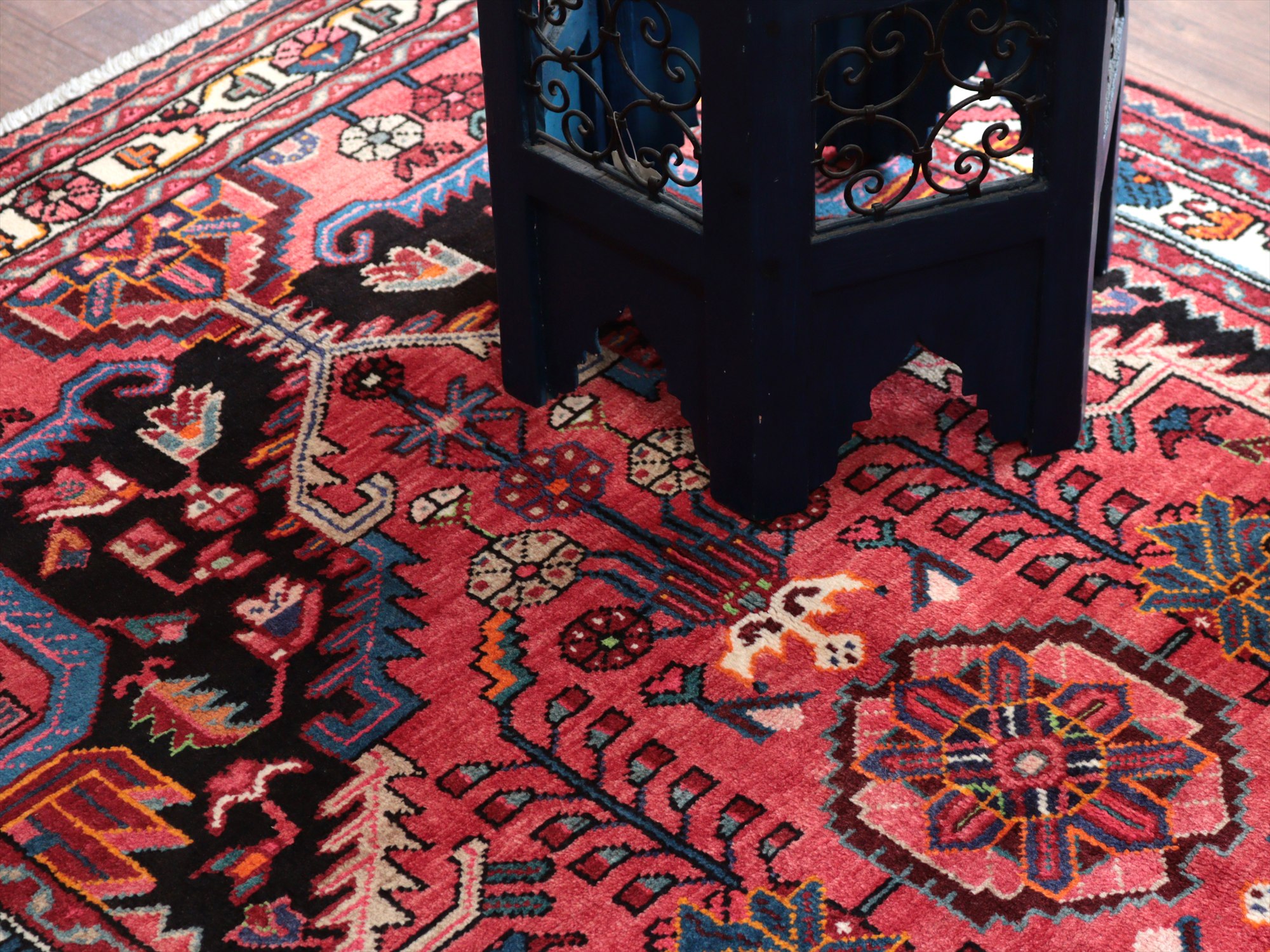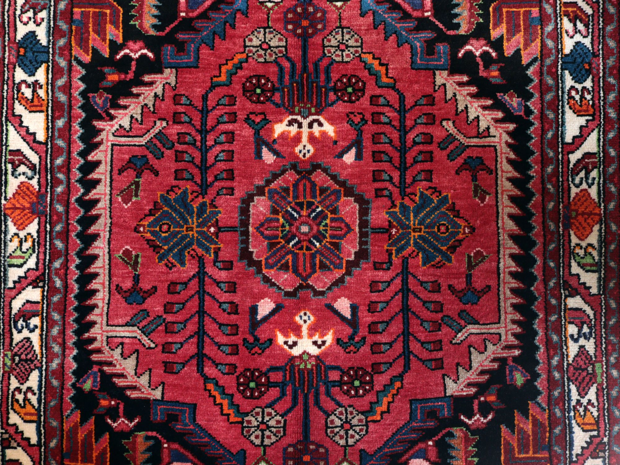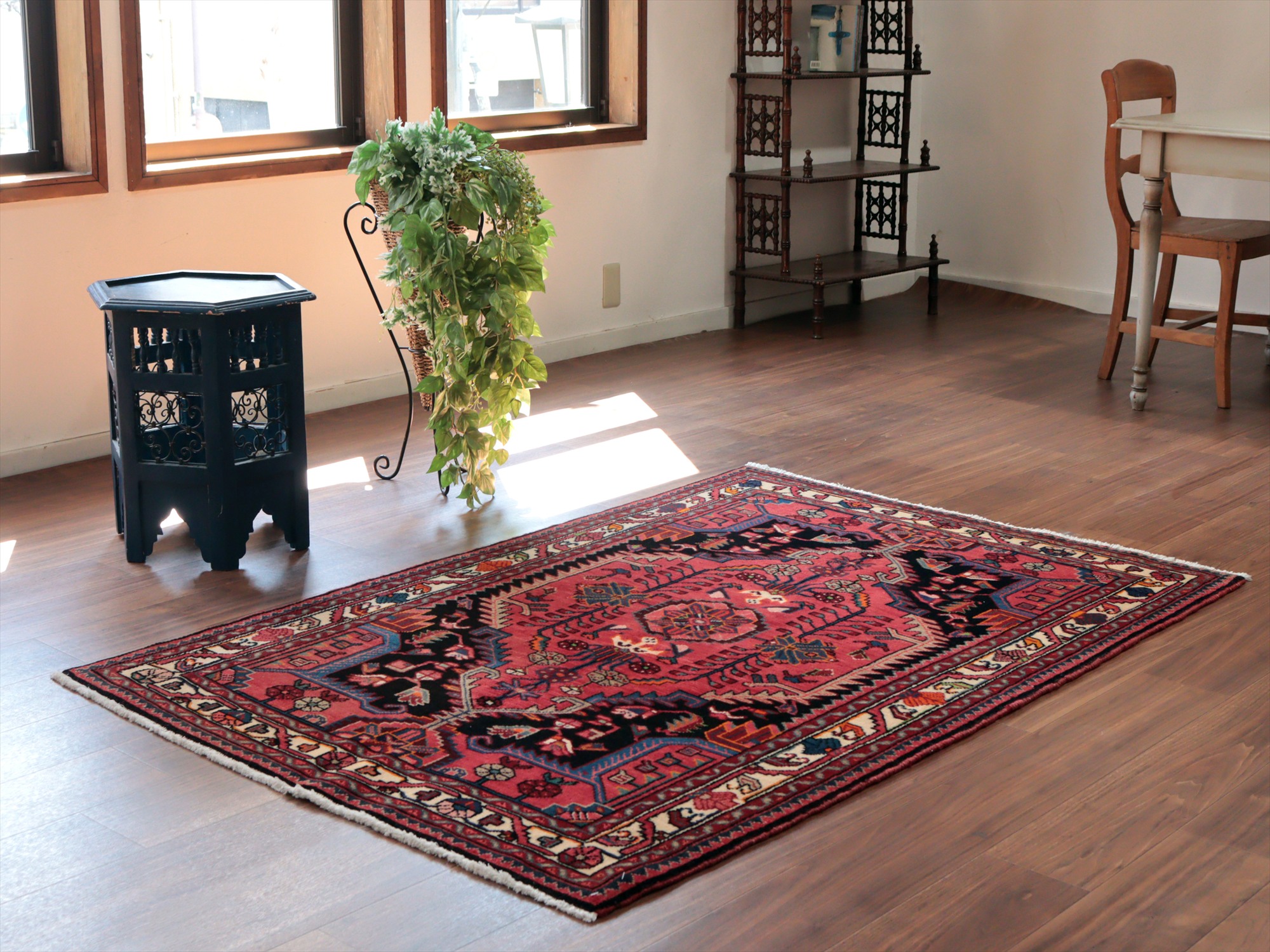 イラン西部ハマダン地方の山岳エリア、トイセルカンという町で織られています。均整の取れたメダリオンを中心とし、草花のモチーフが全面に飾るように織られたデザインが特徴的です。朱色に近いレッドと、深いネイビーを基調とした色使いで、ボーダー部分はベージュでやわらかく締めています。
