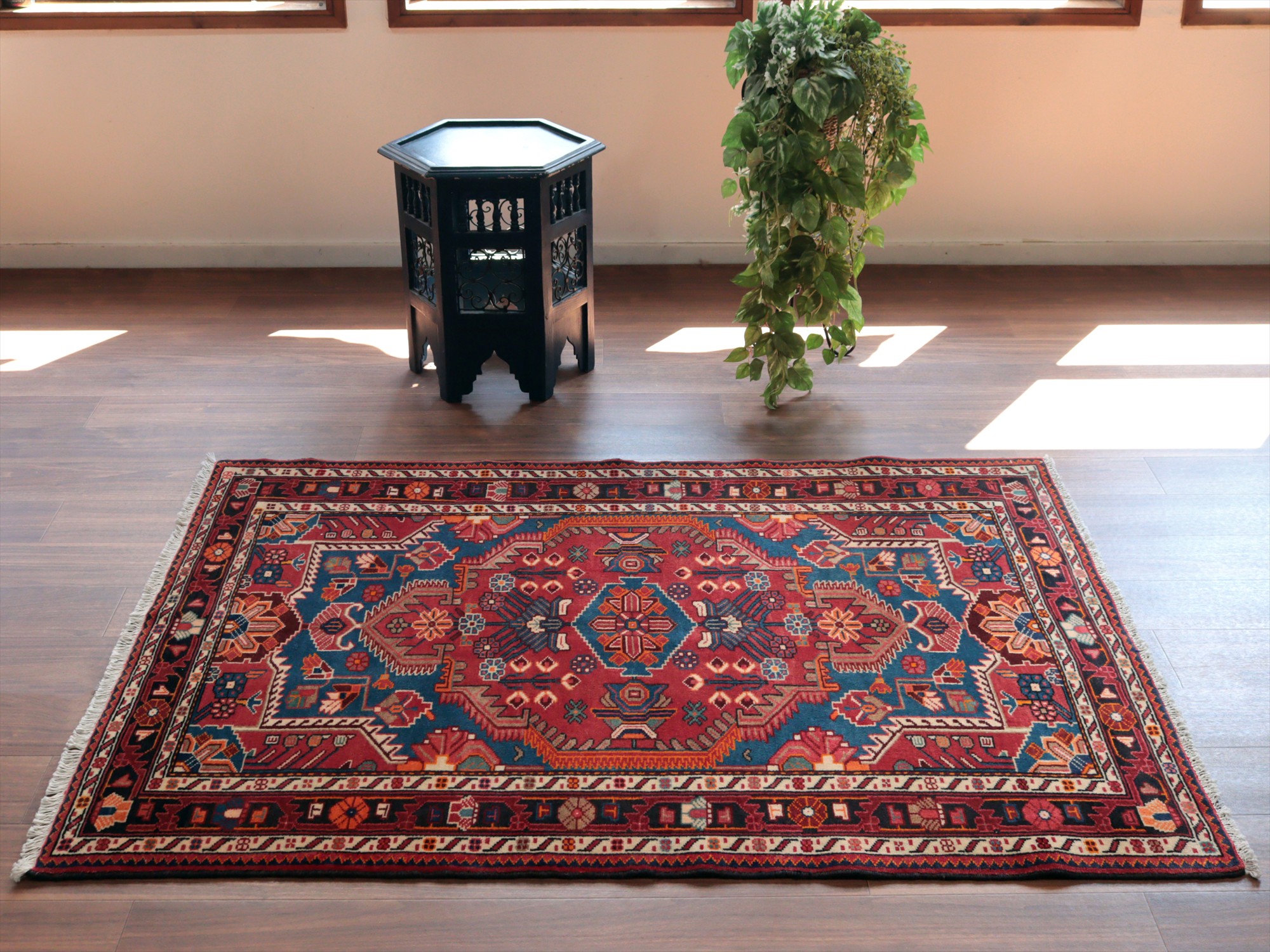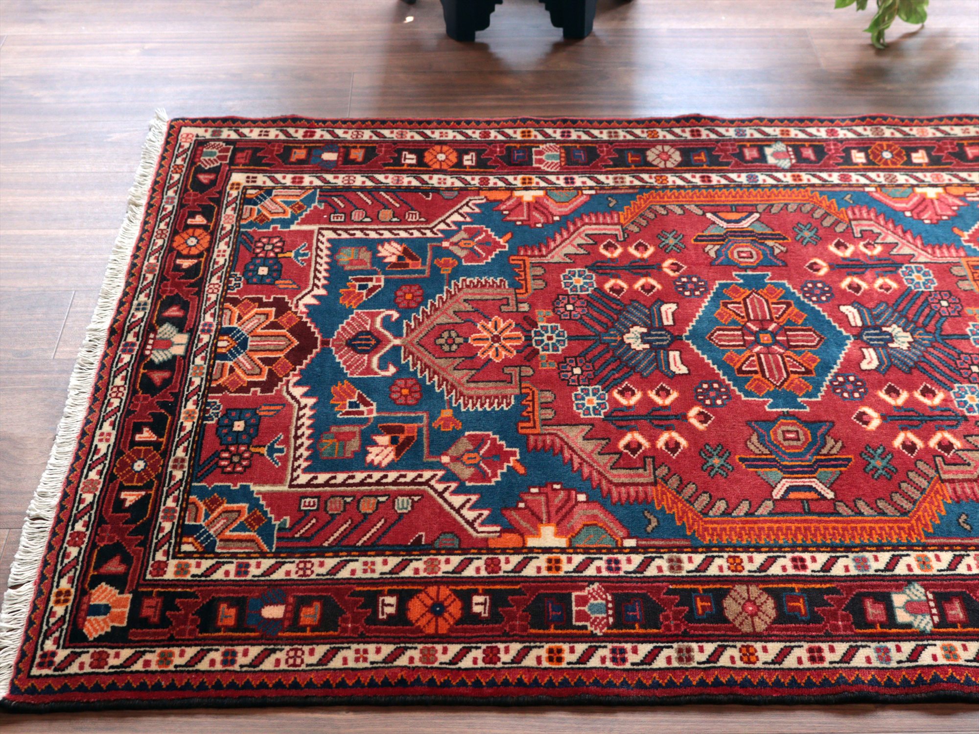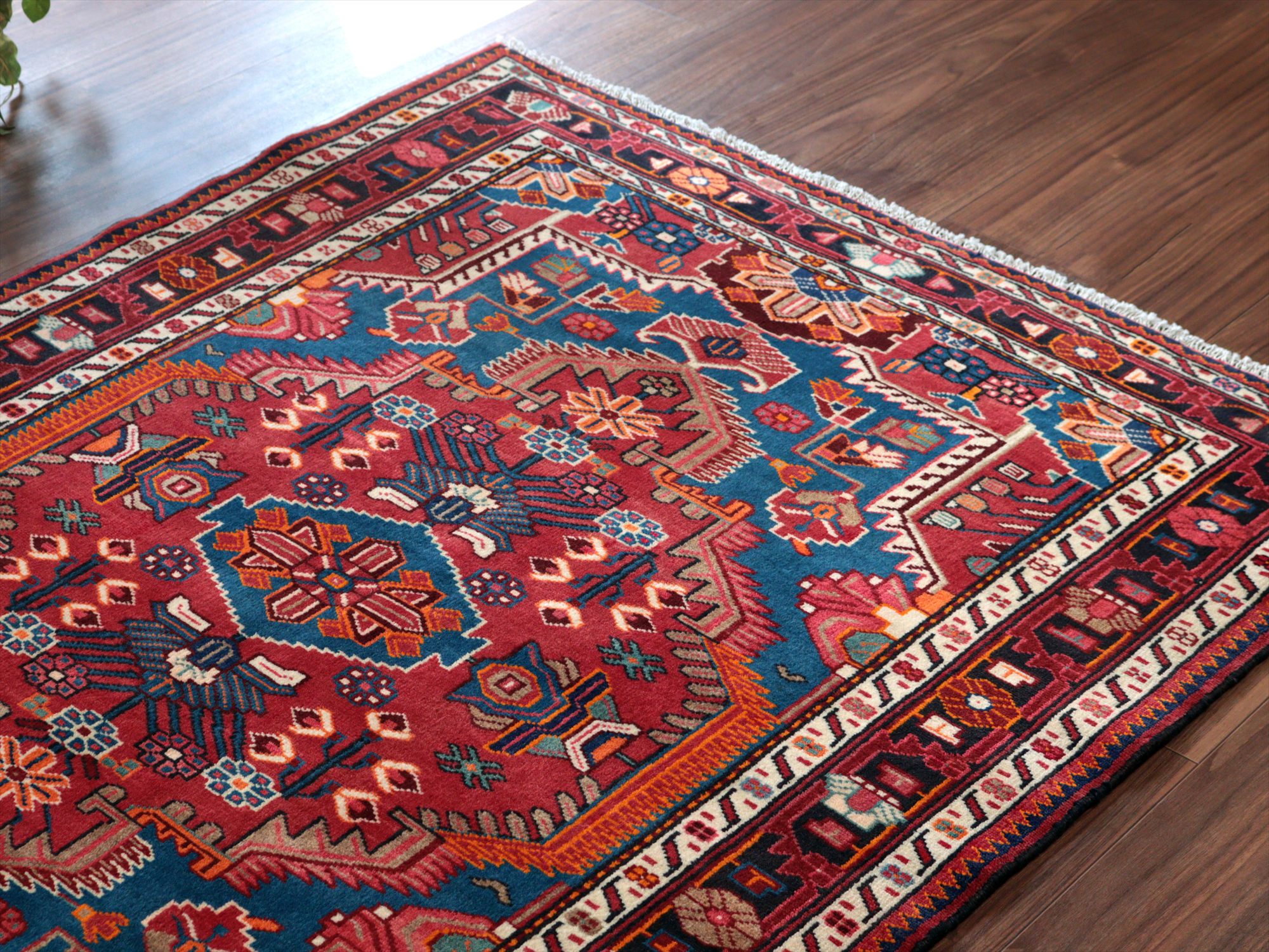 - イランの手織りラグ トイセルカン153×117cm メダリオンと小花 レッド&ブルー