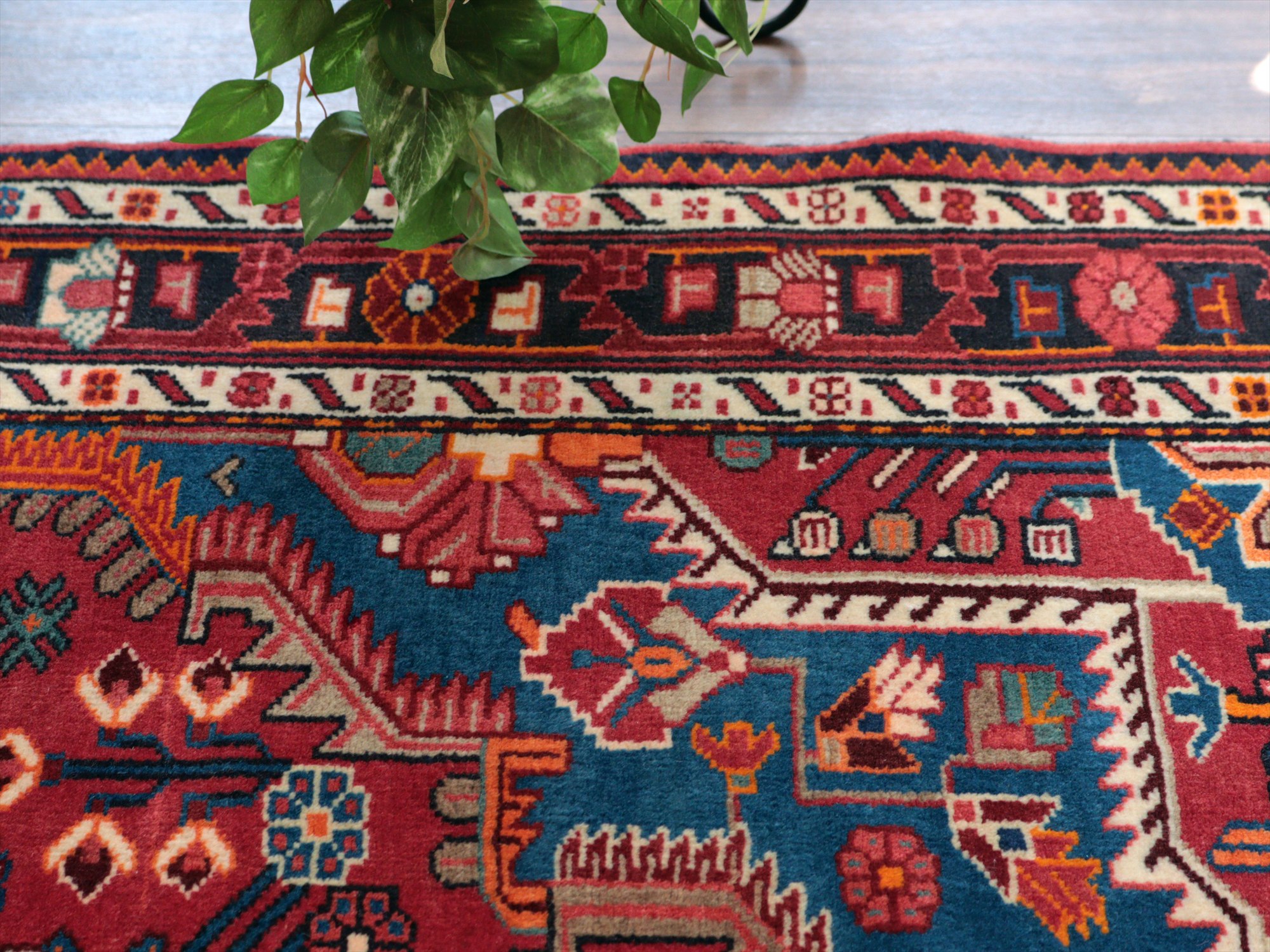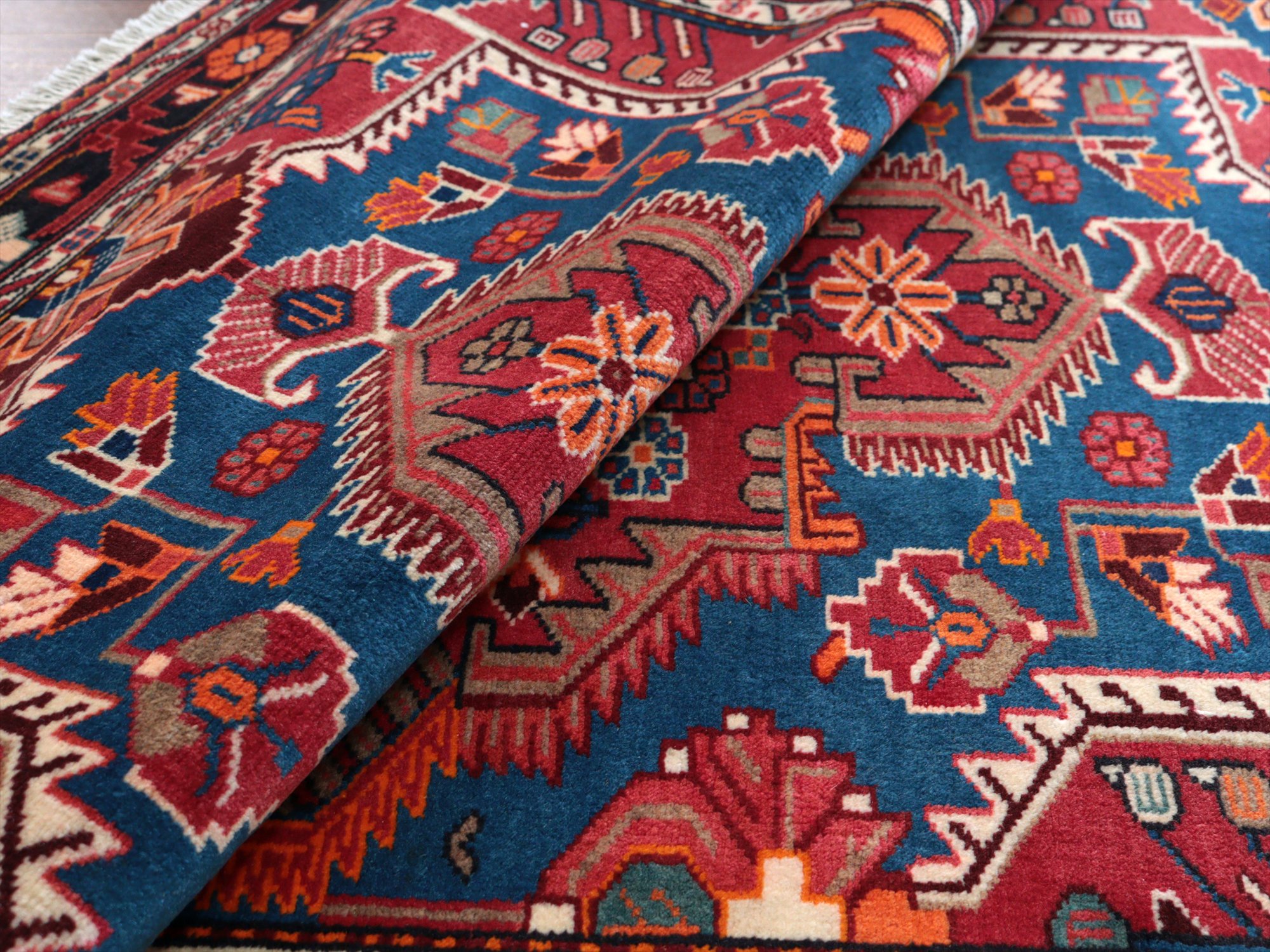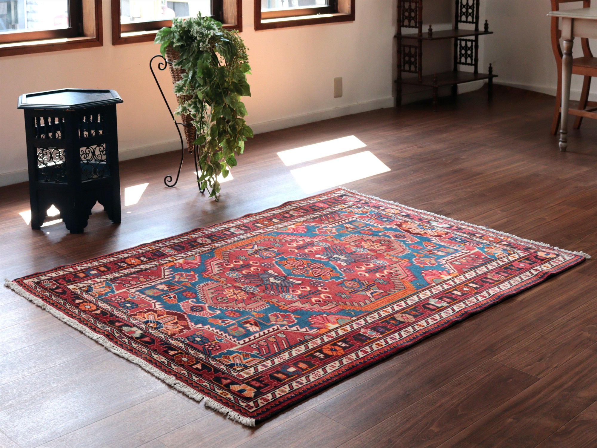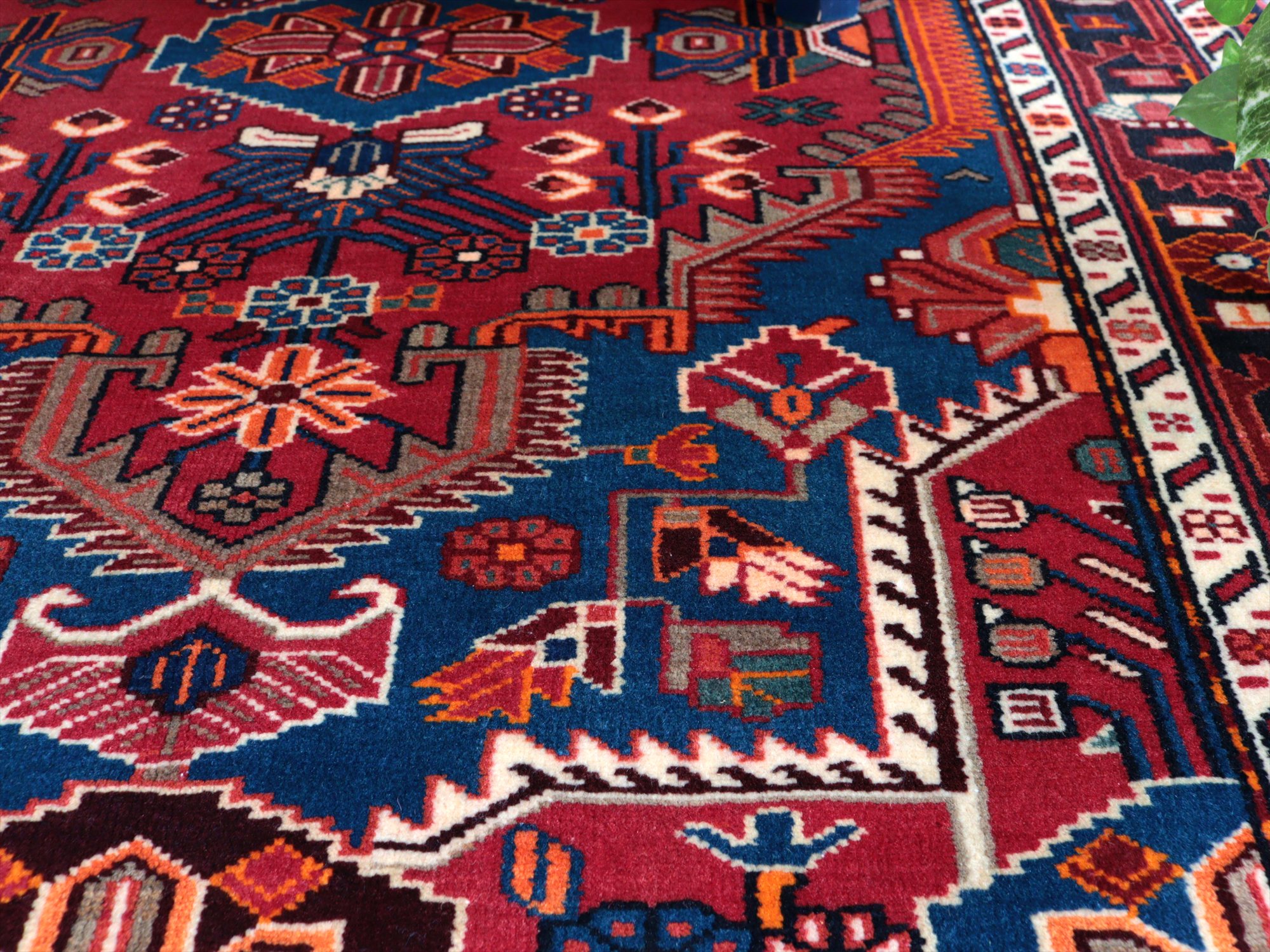 イラン西部ハマダン地方の山岳エリア、トイセルカンという町で織られています。均整の取れたメダリオンを中心とし、草花のモチーフが全面に飾るように織られたデザインが特徴的です。明るいブルーと、レッド、オレンジのコントラストがよく効いていて美しい1枚です。