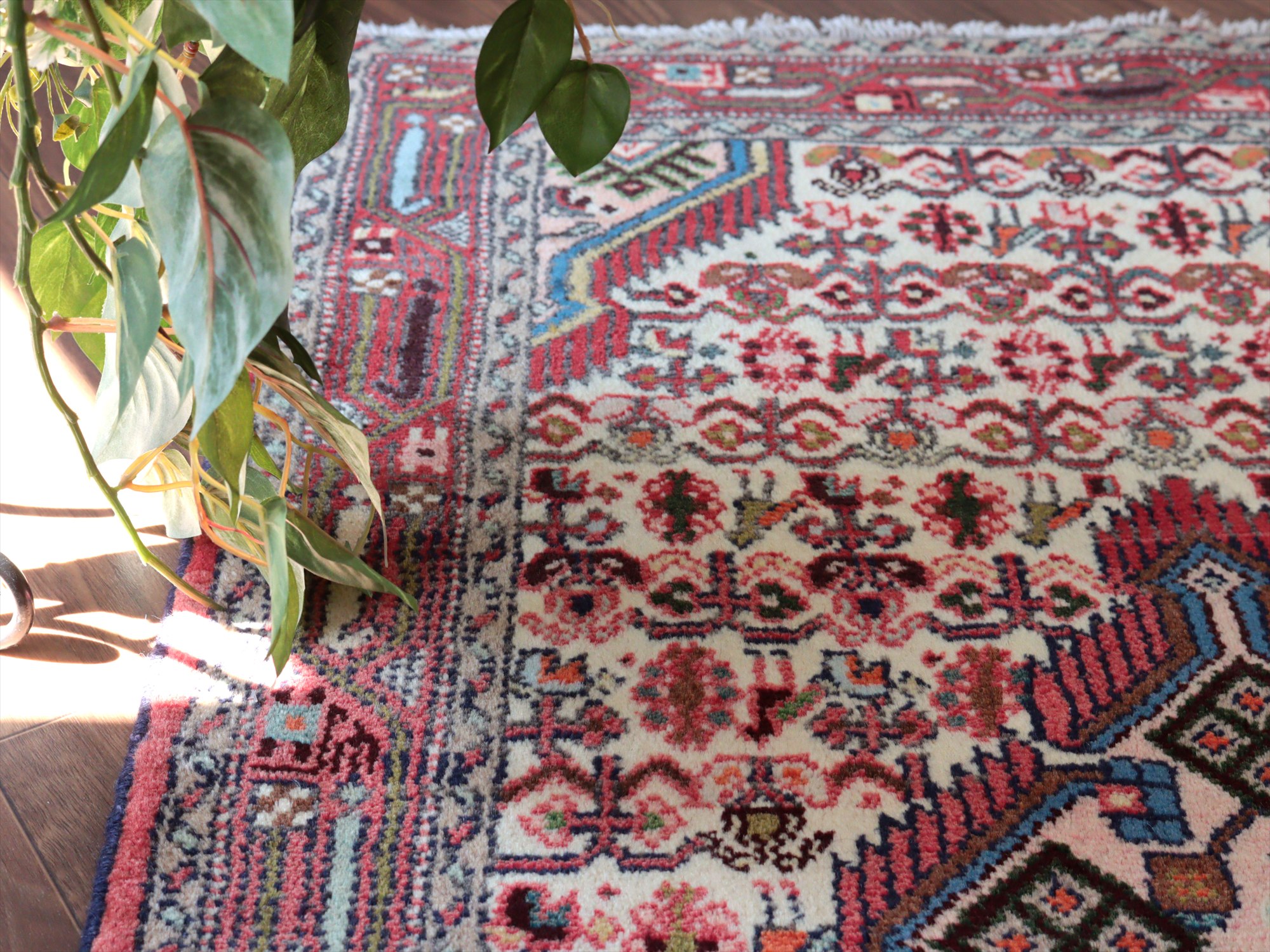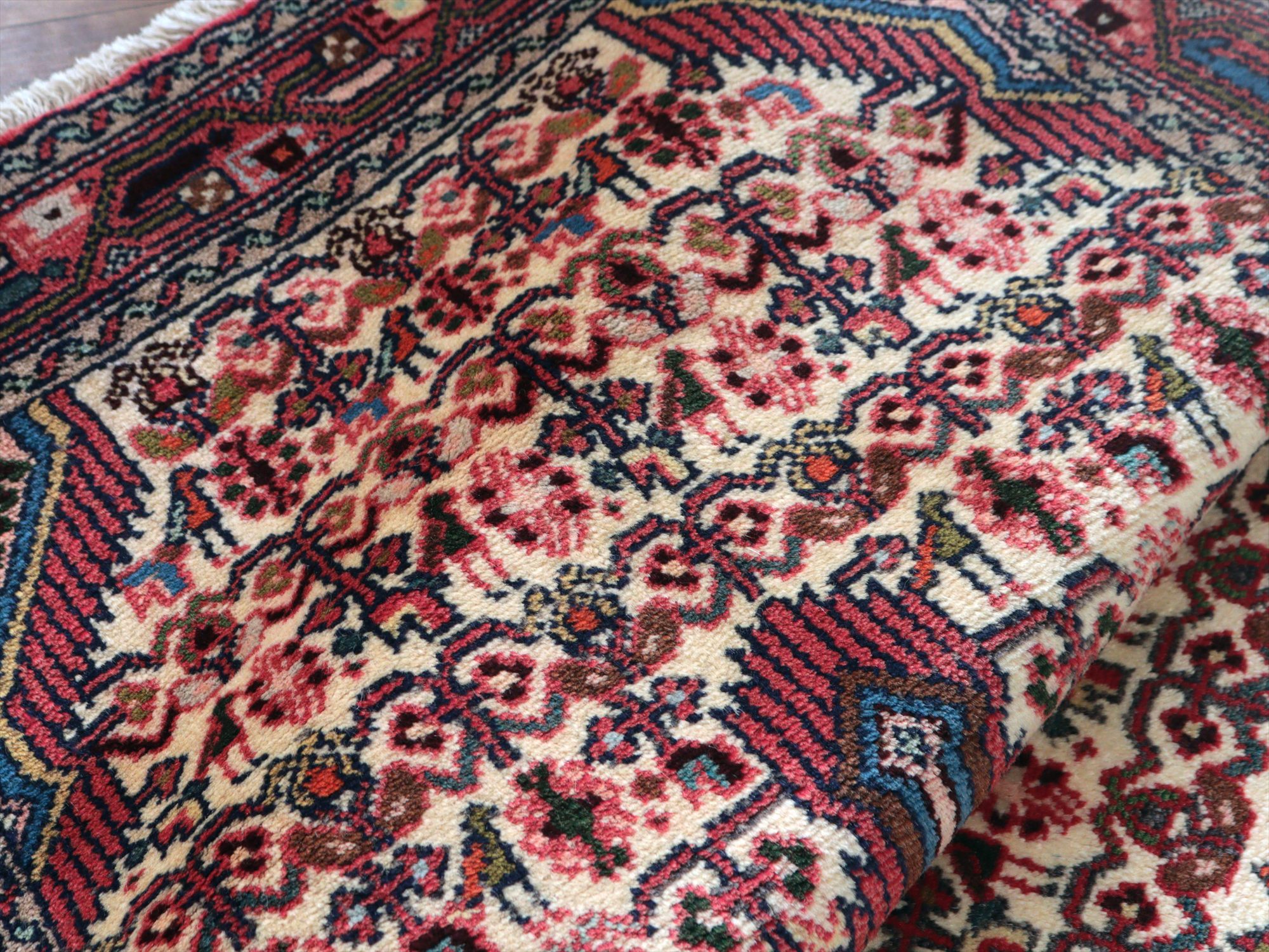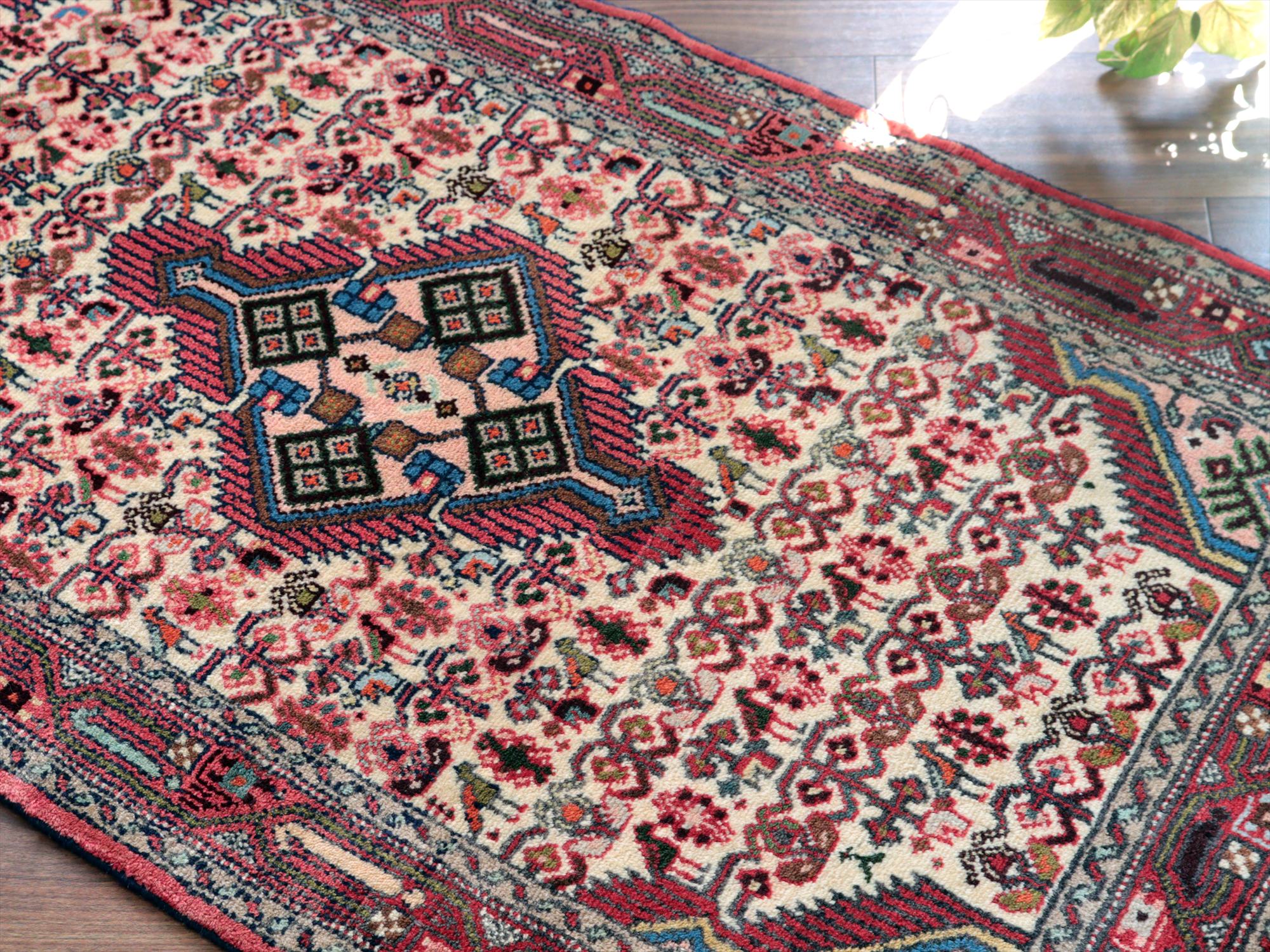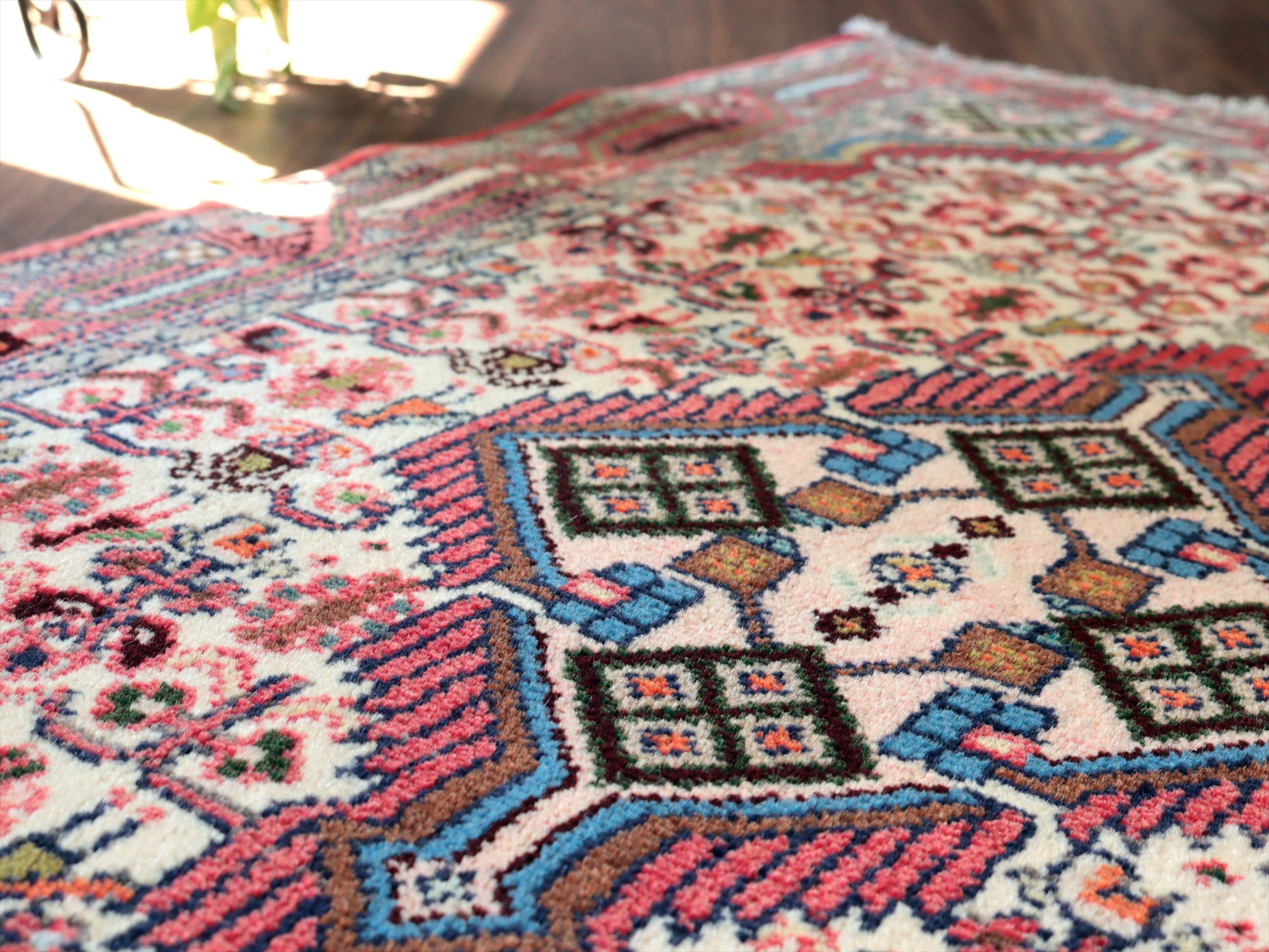 イラン西部、ハマダンの北に位置するナハバンドの絨毯です。ベージュと朱色に近いレッドをメインとした色使いで構成されています。中央には特徴的なメダリオン、そのまわりには鳥や小花が全面を飾るように織られています。