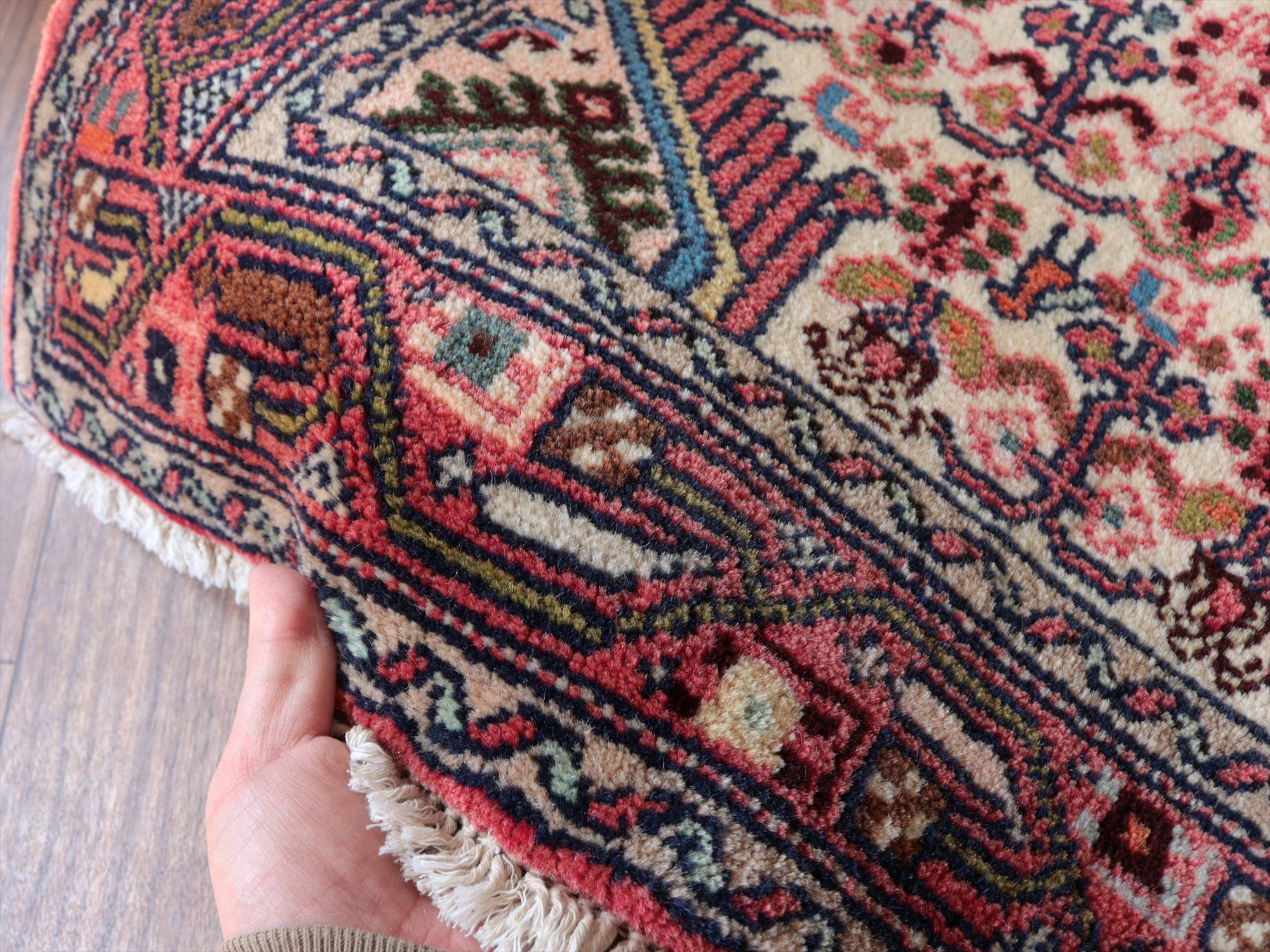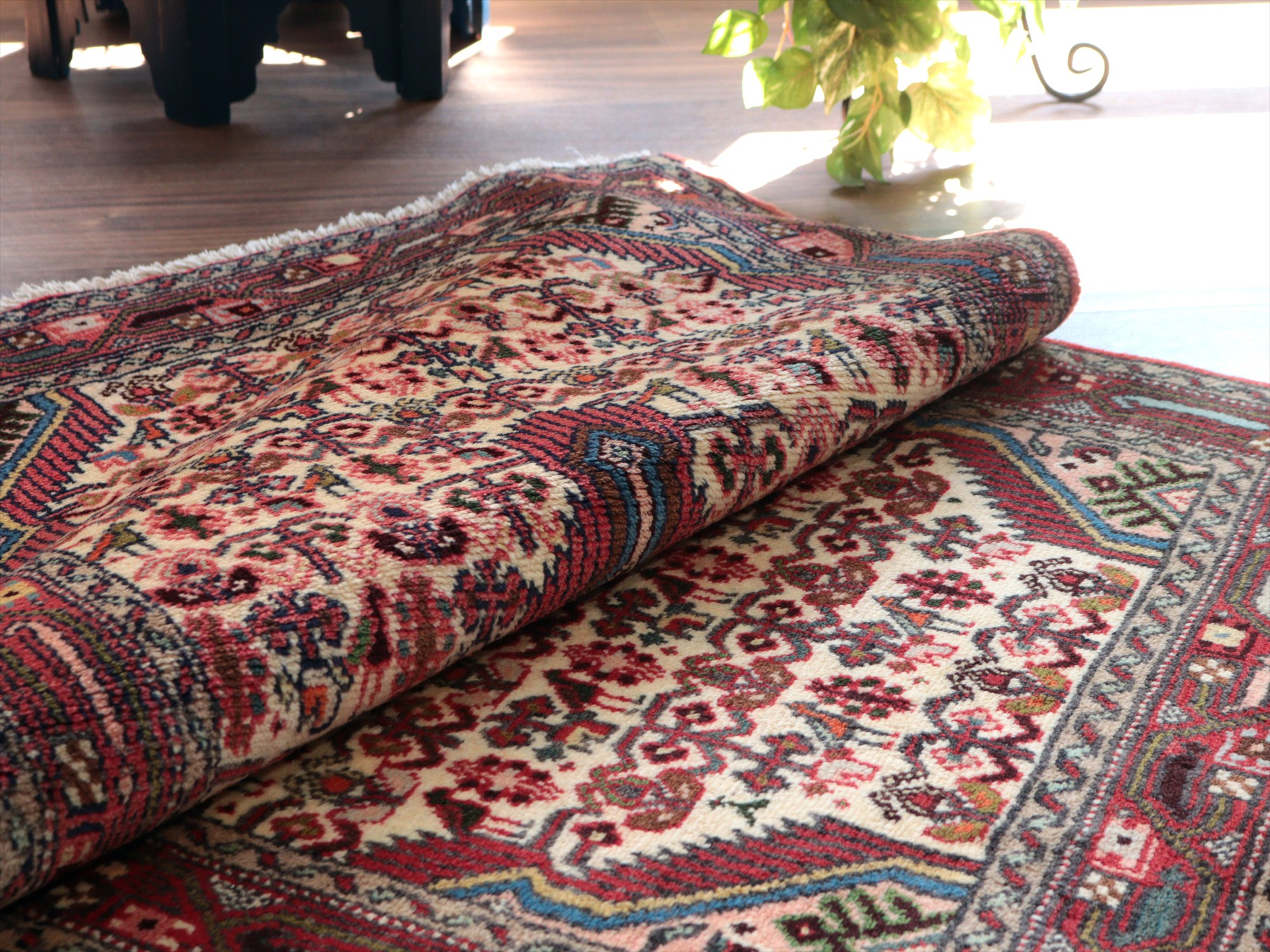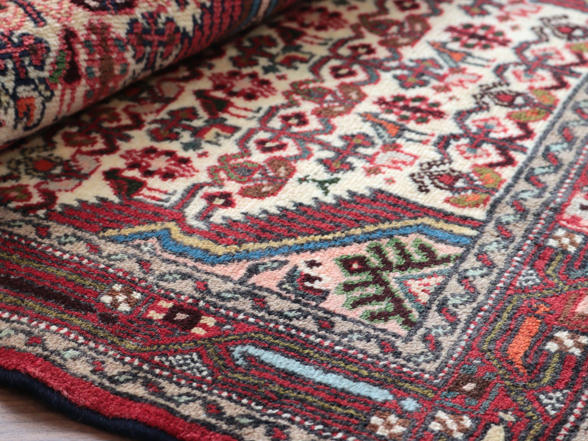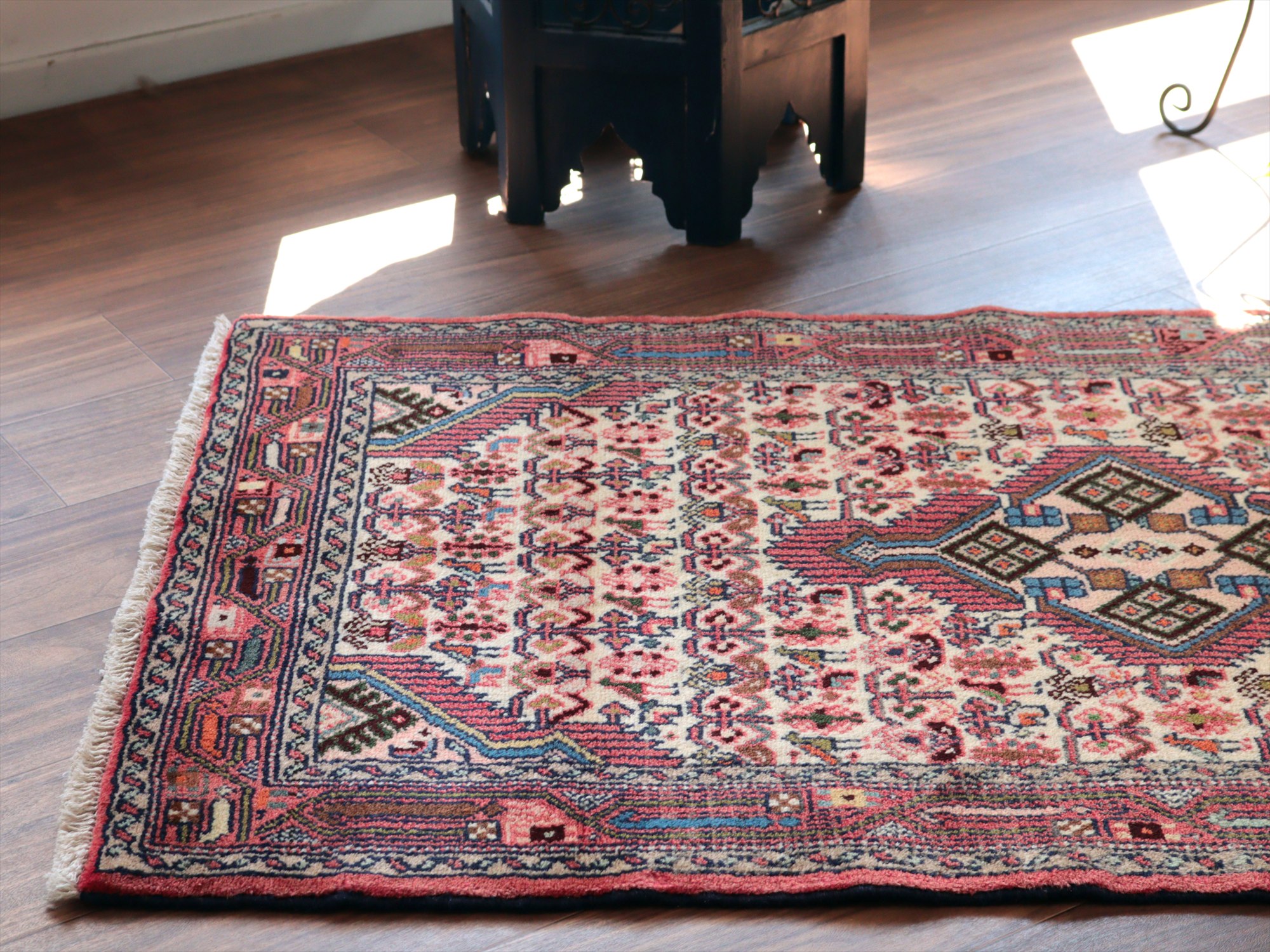 イラン西部、ハマダンの北に位置するナハバンドの絨毯です。ベージュと朱色に近いレッドをメインとした色使いで構成されています。中央には特徴的なメダリオン、そのまわりには鳥や小花が全面を飾るように織られています。