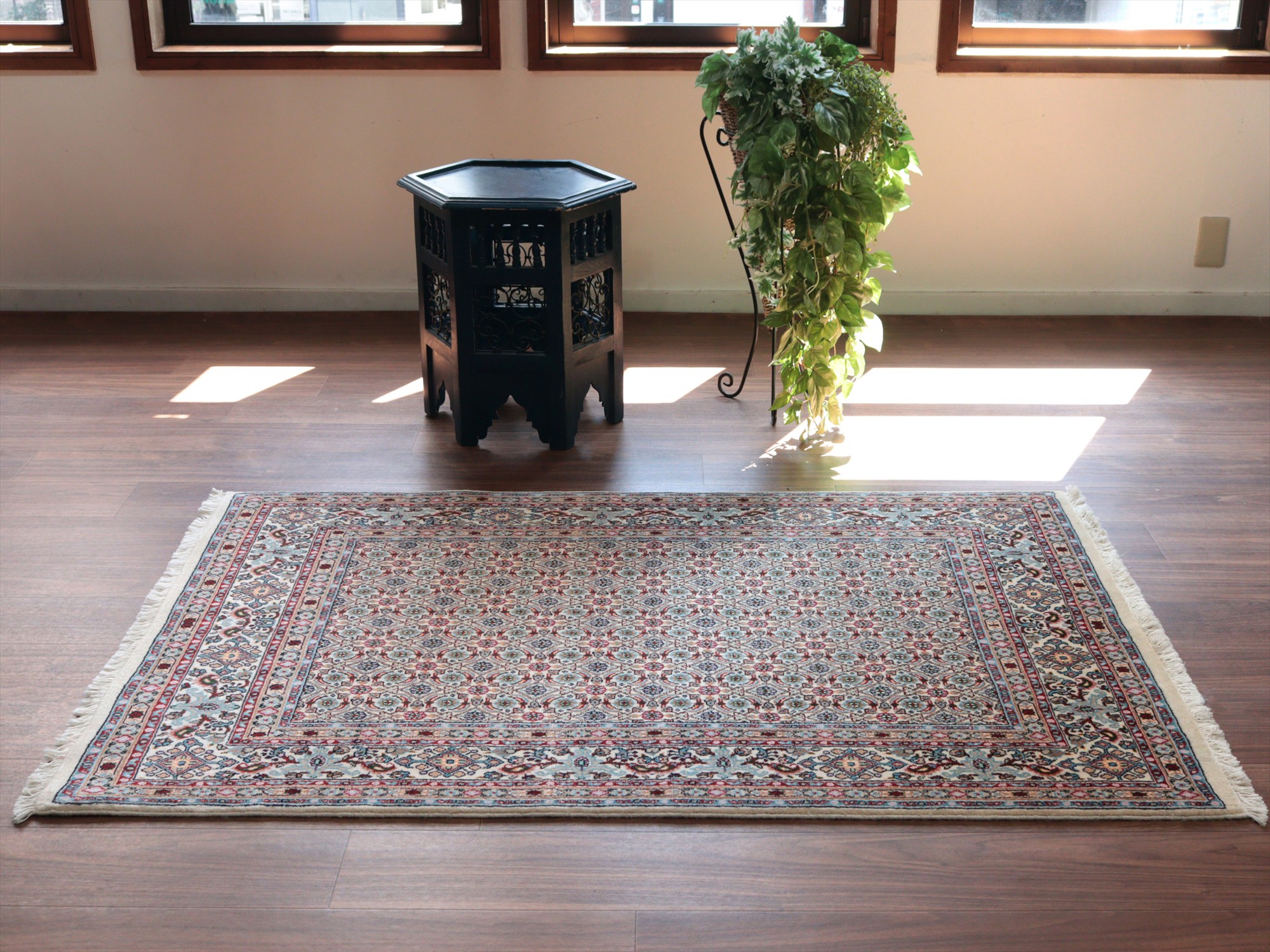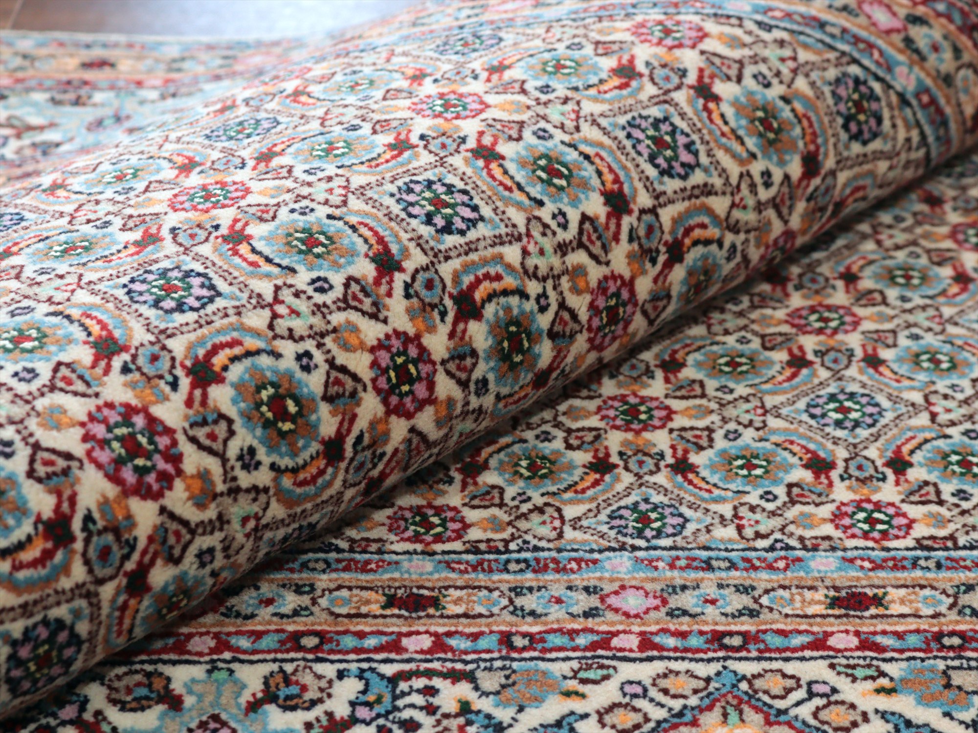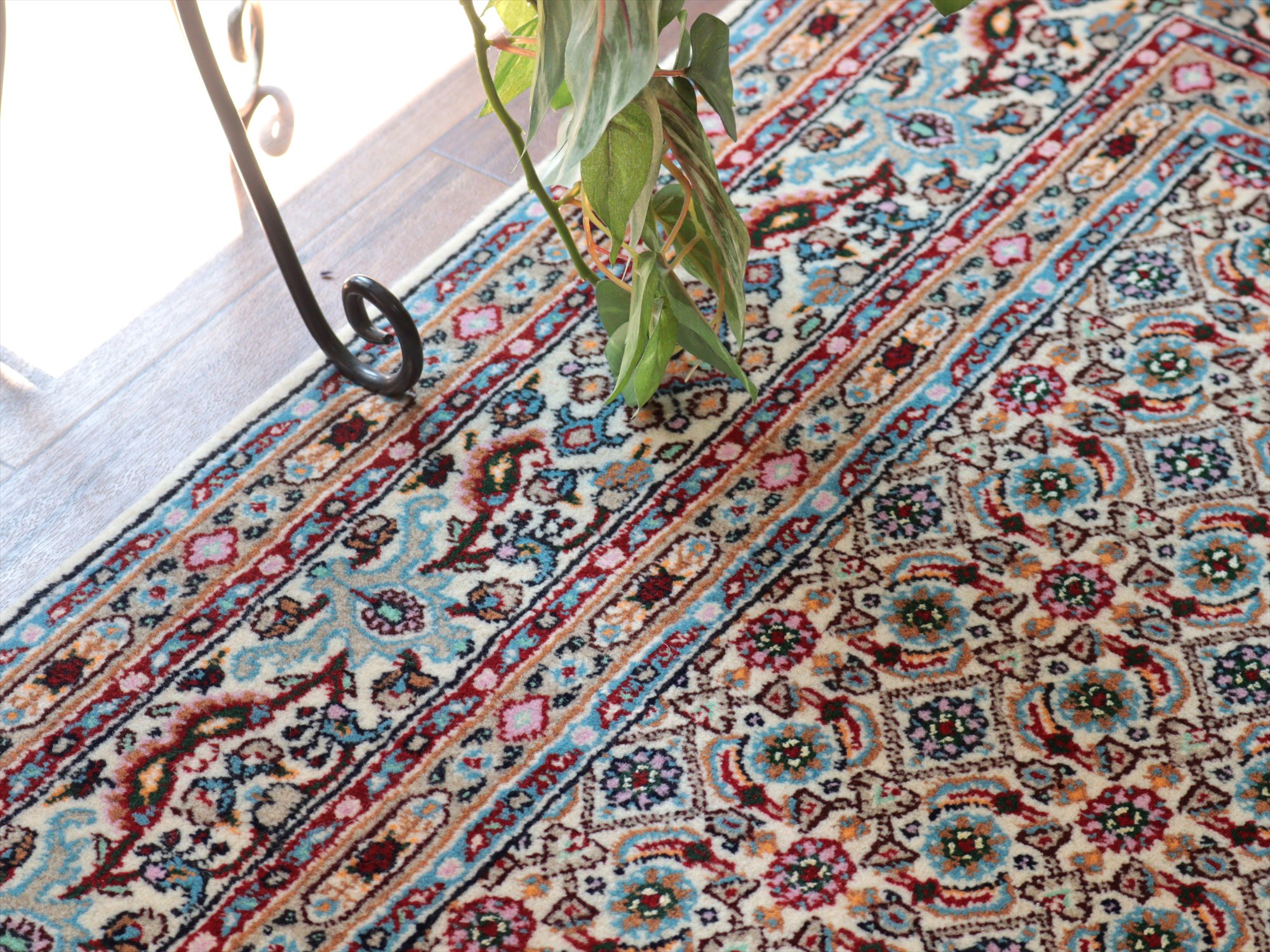 アイボリーをベースに、主にグリーンの色糸を使い細かな小花文様が織り込まれたムード産の手織り絨毯。イラン東部からアフガニスタンにも一般に見られるヘラート文様で、小さな花びらの形はマヒ(魚)と表現されることもあります。