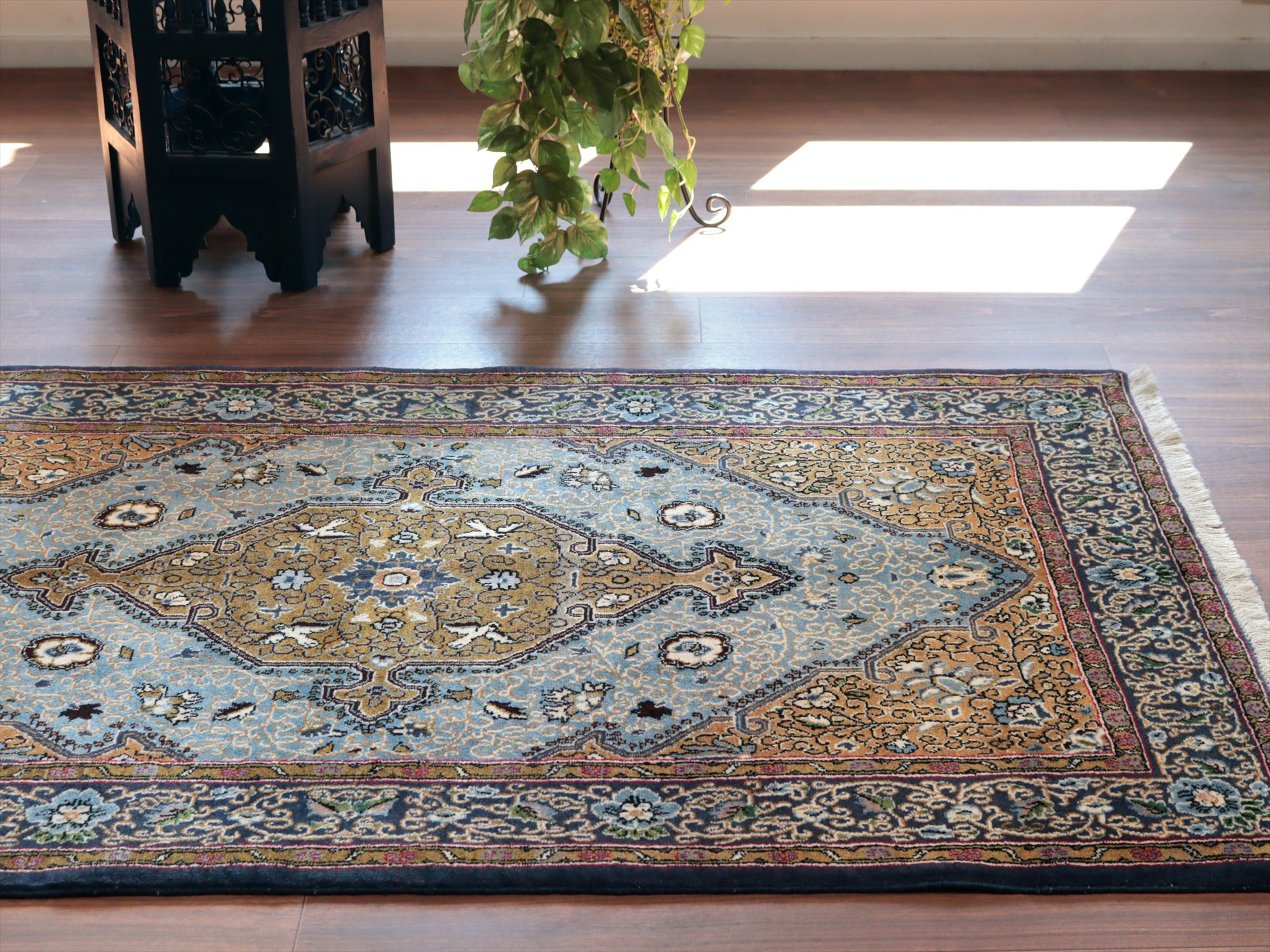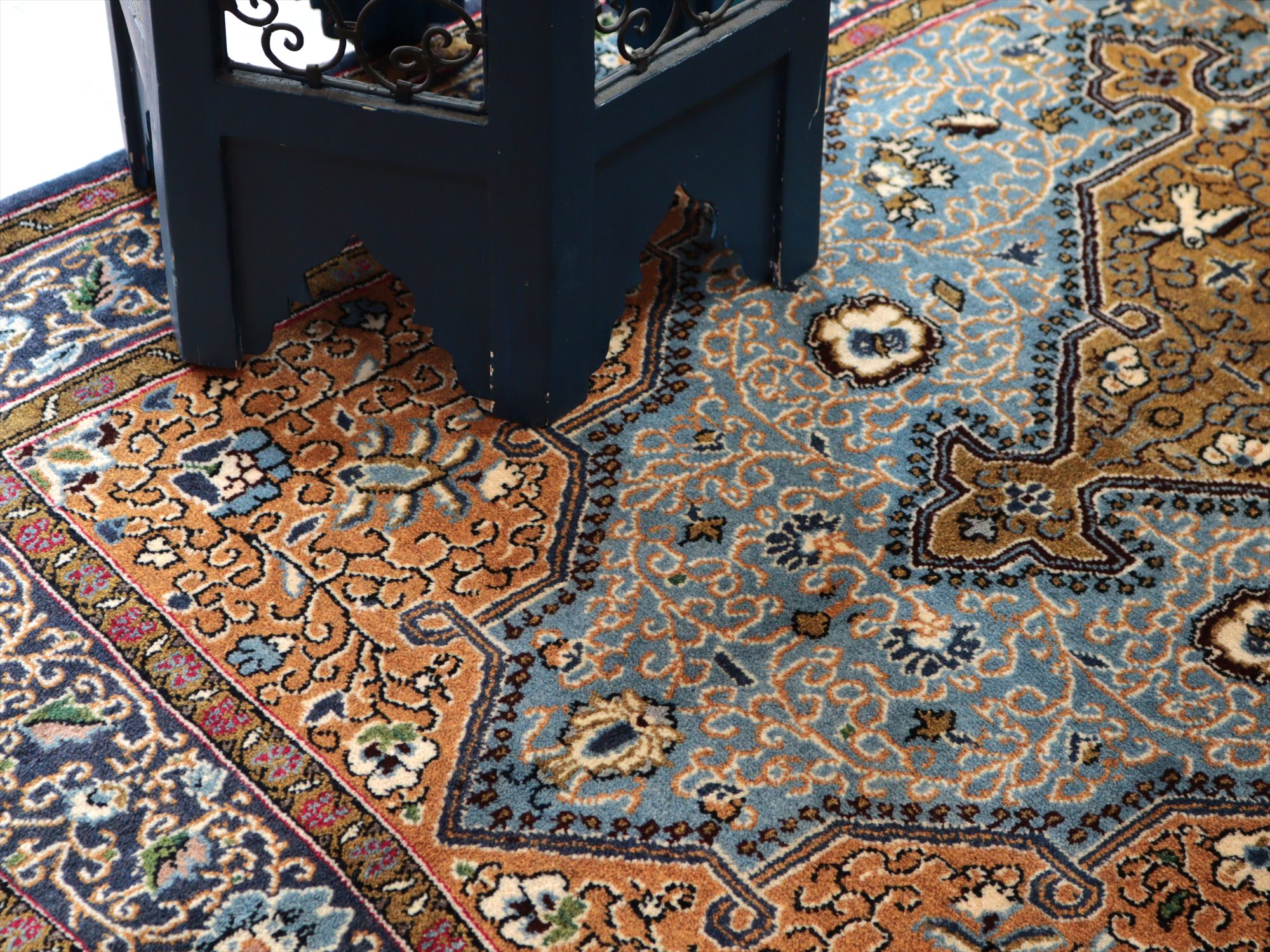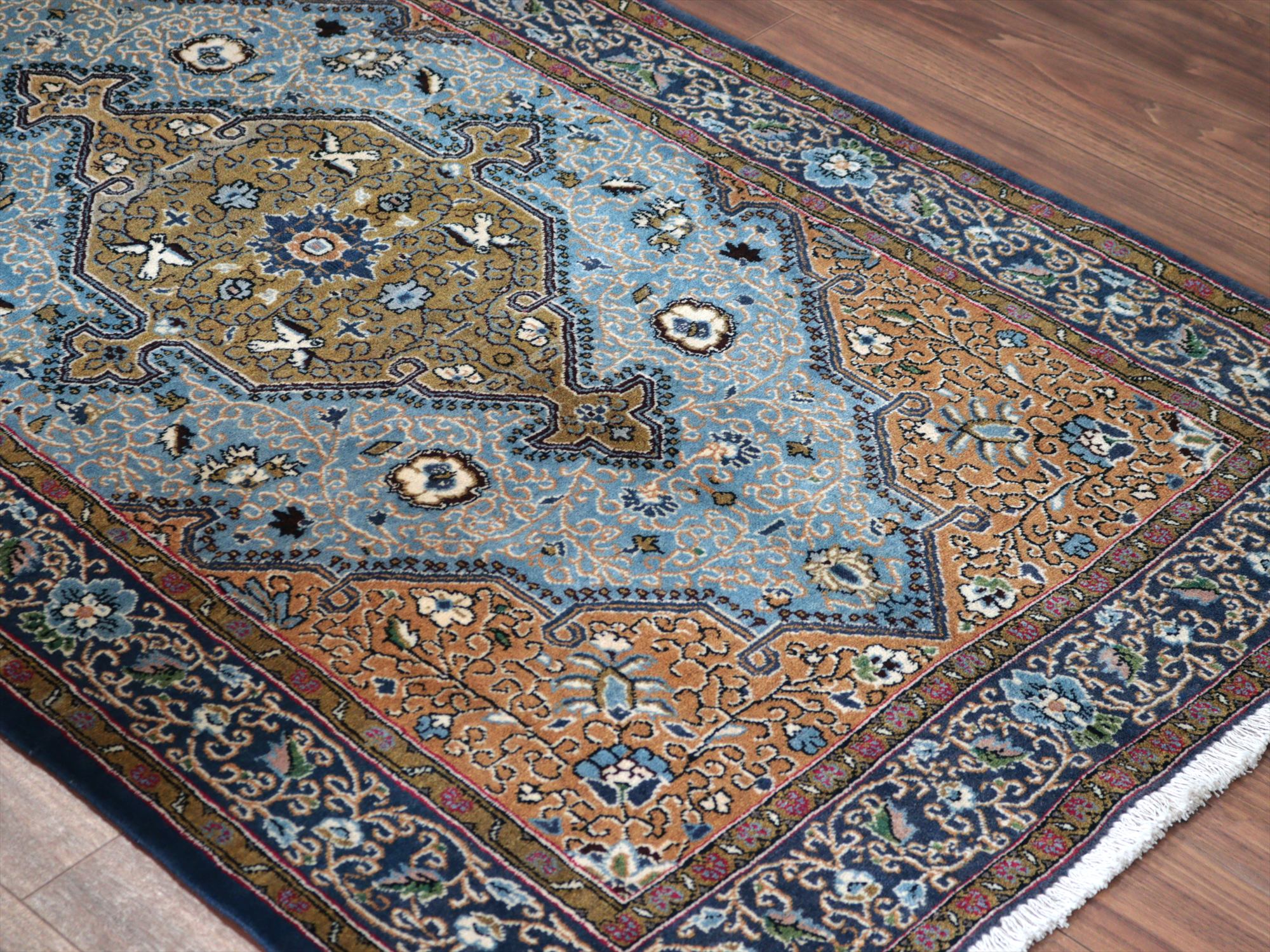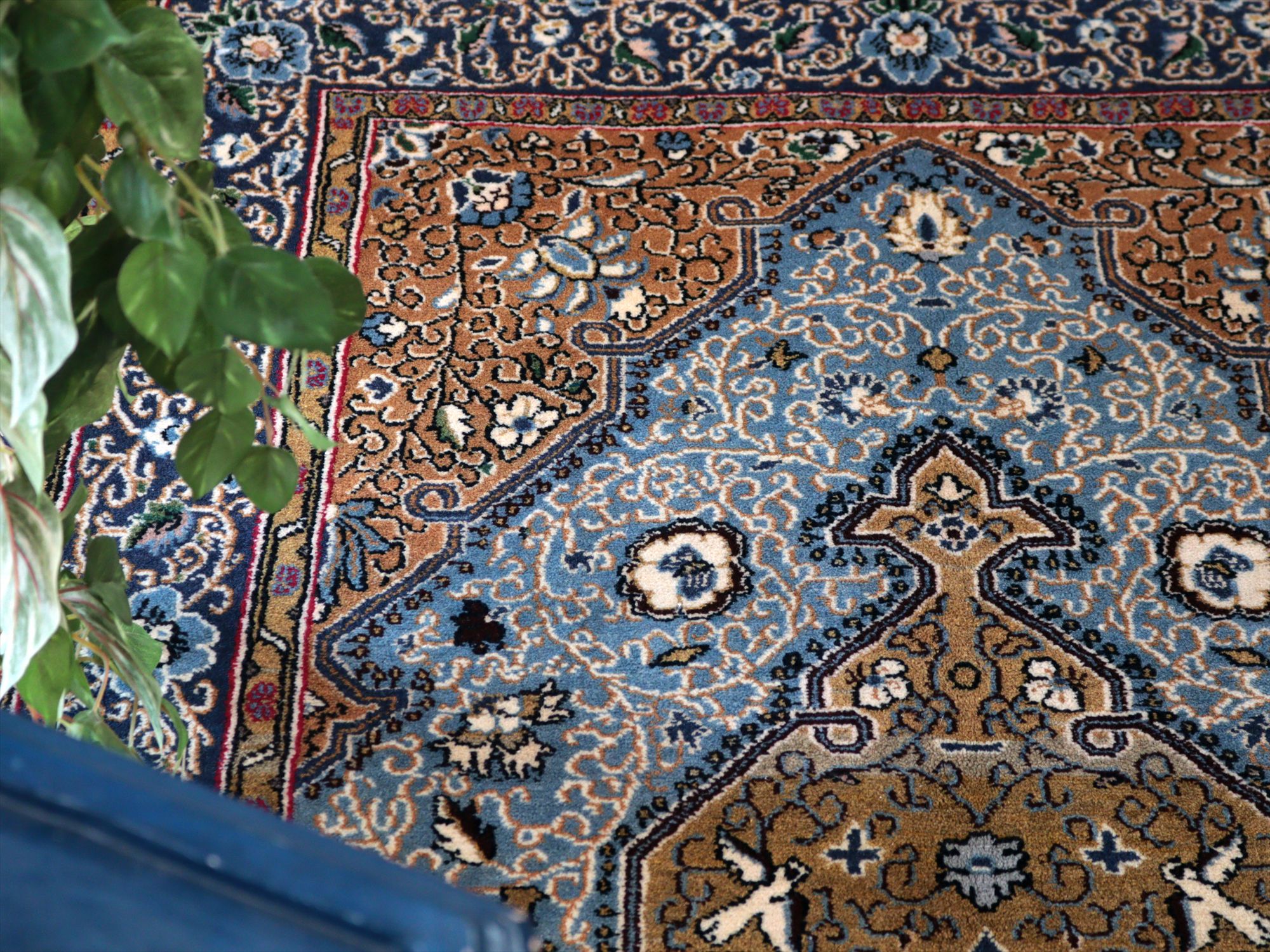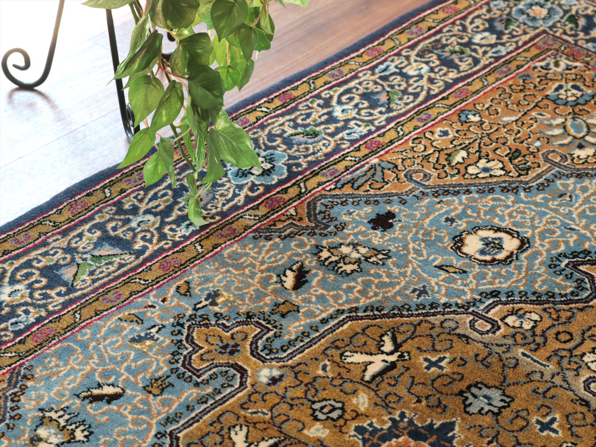 イランのクム近郊の都市シャヘレザーの絨毯。緑がかったブラウンと、ブルー、ネイビーをメインとした色使いで全体が構成された1枚。中央のメダリオンを中心に、一面に花模様が織り込まれた上品なデザイン。