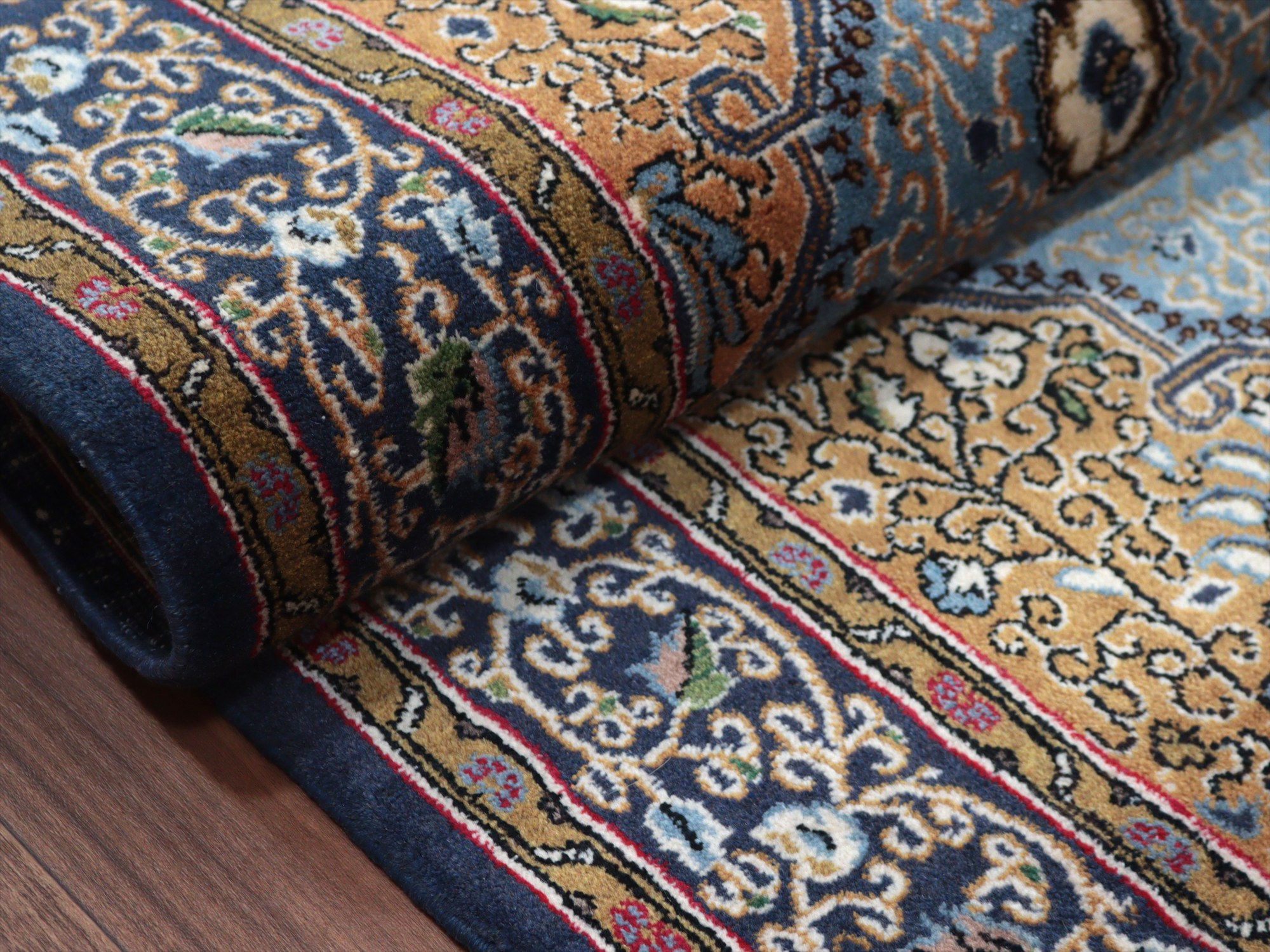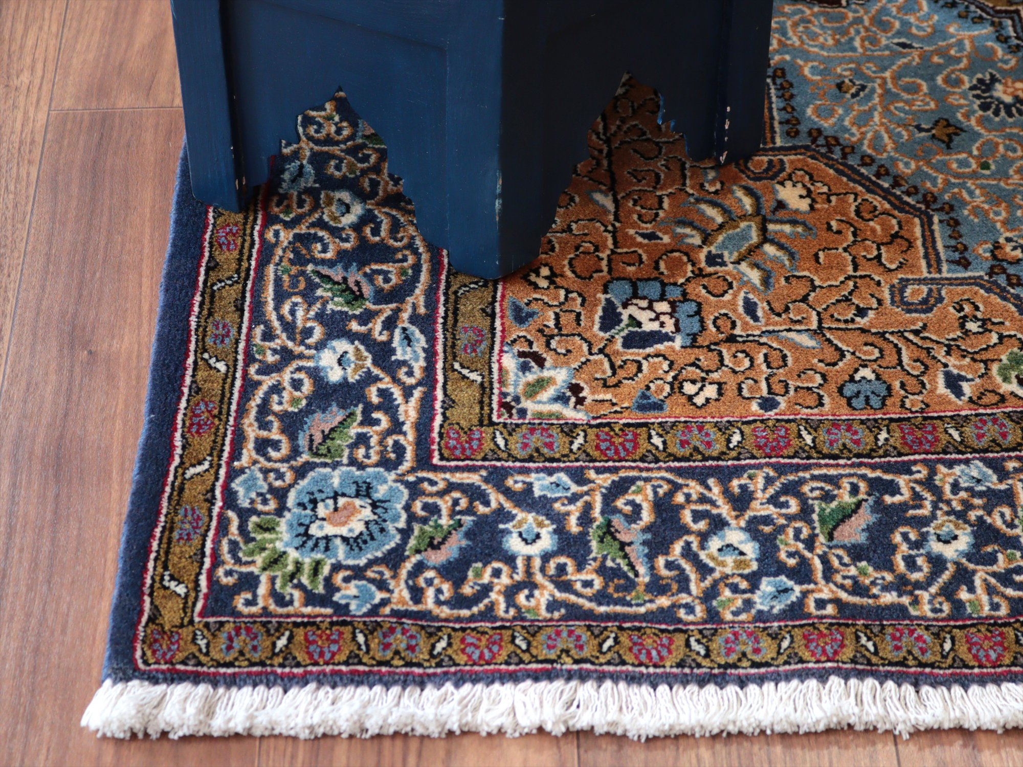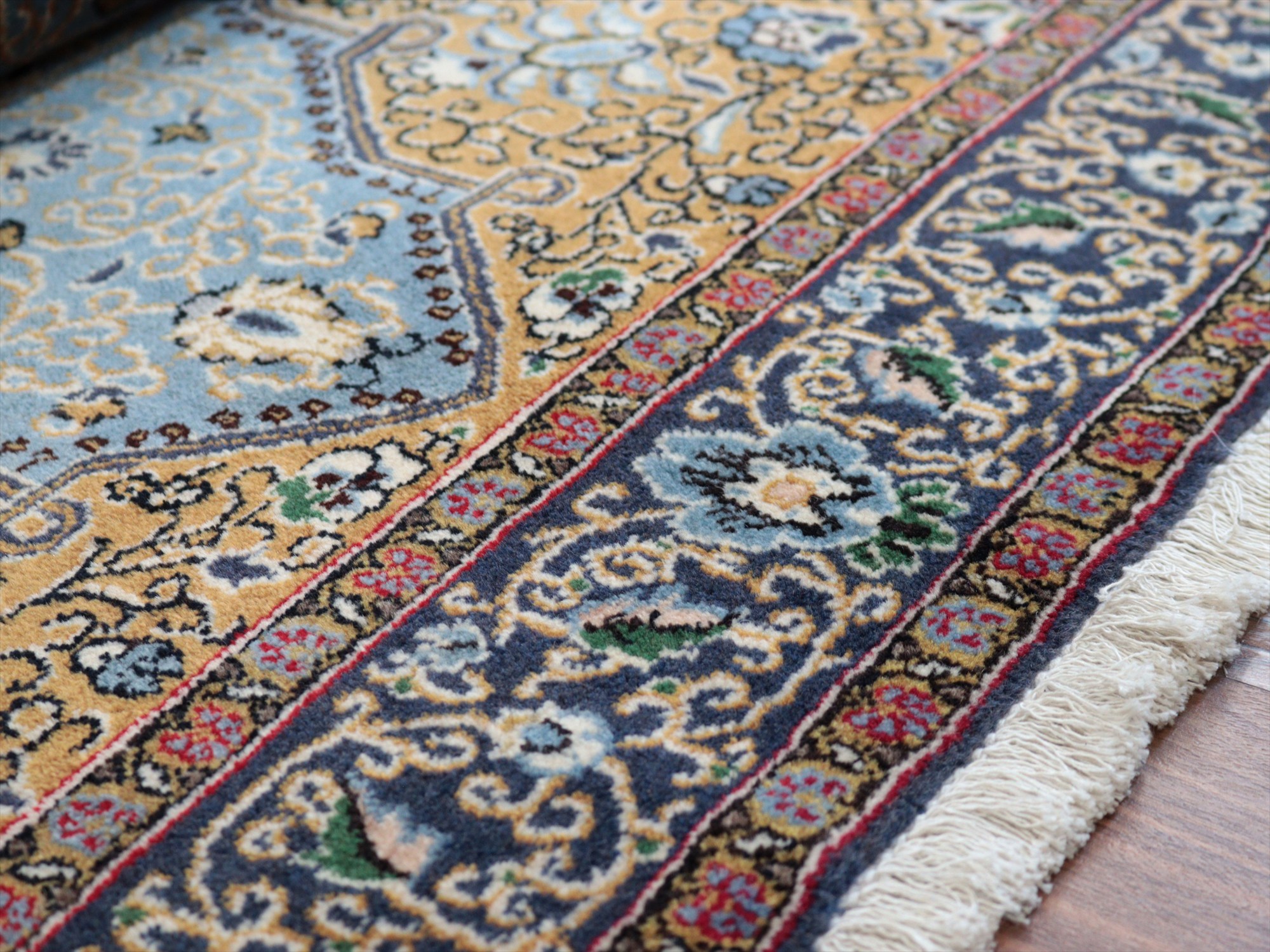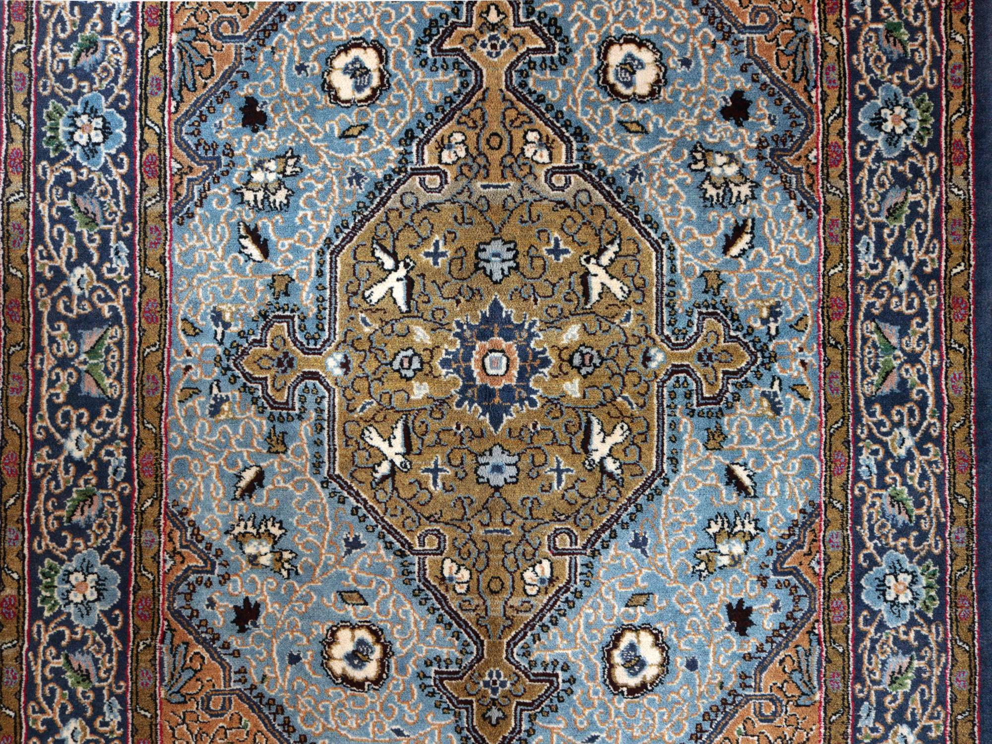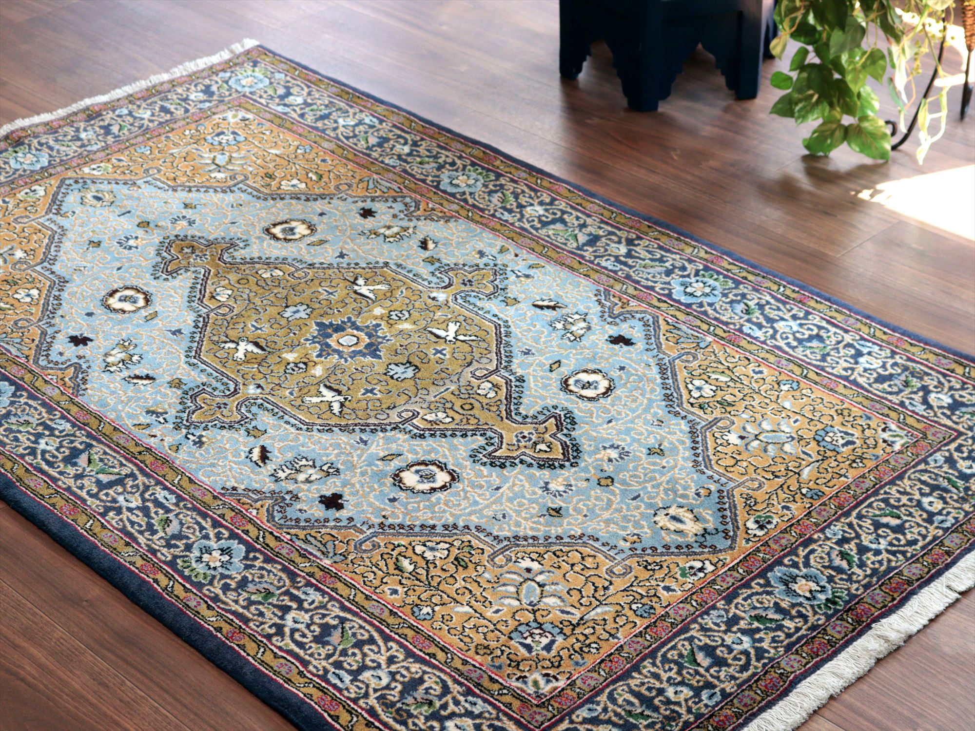 イランのクム近郊の都市シャヘレザーの絨毯。緑がかったブラウンと、ブルー、ネイビーをメインとした色使いで全体が構成された1枚。中央のメダリオンを中心に、一面に花模様が織り込まれた上品なデザイン。