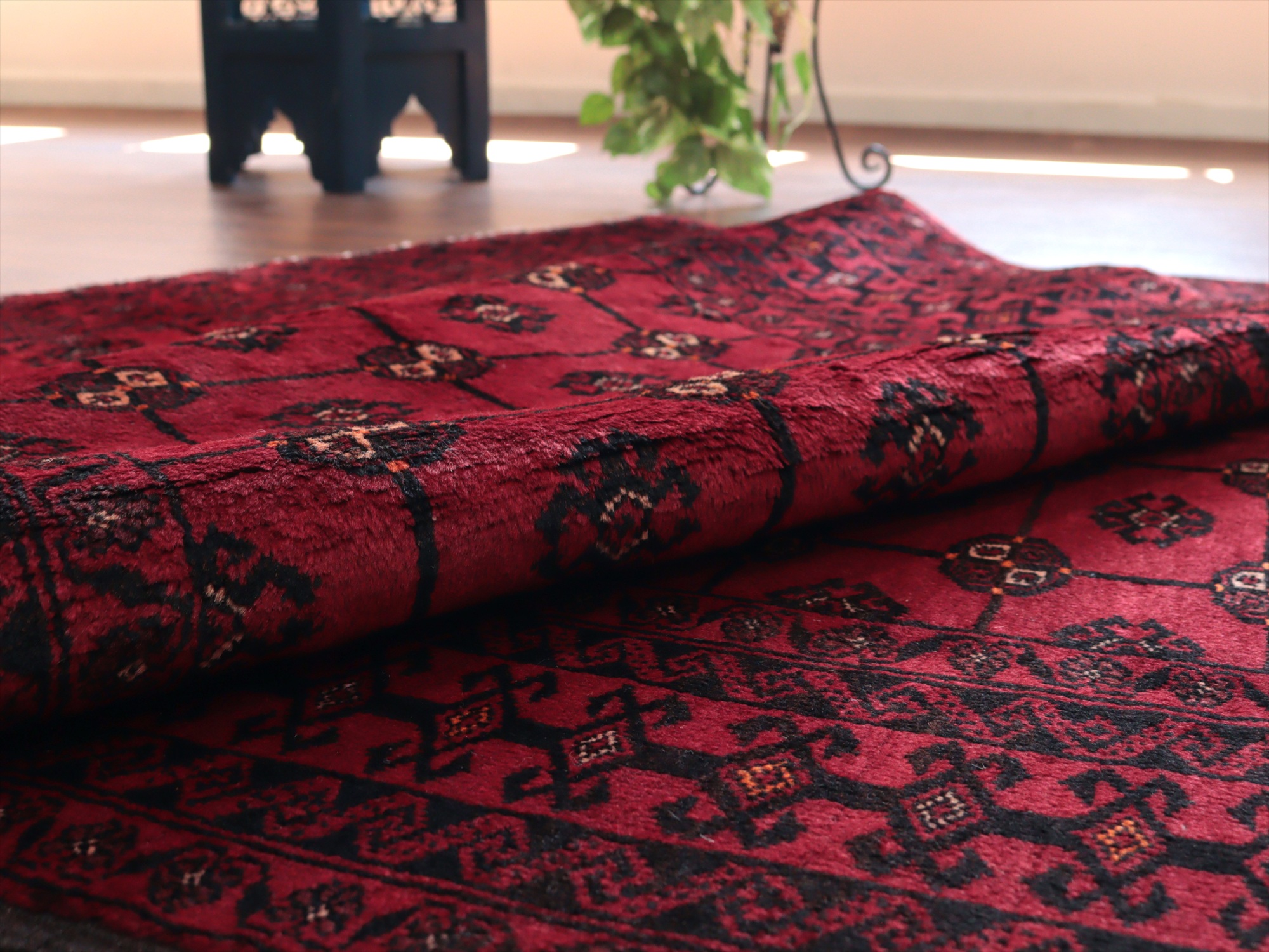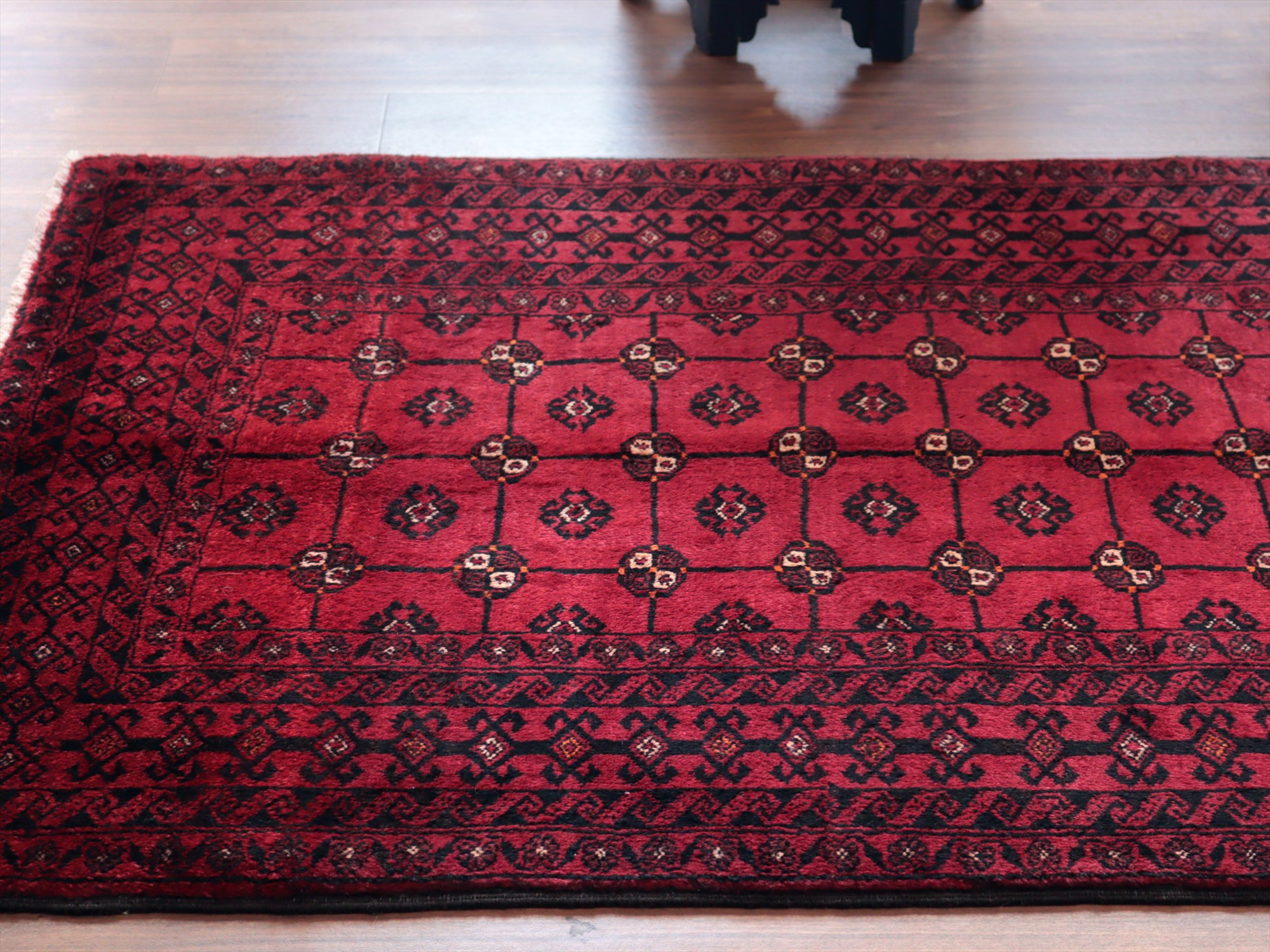 イラン東部からアフガン・パキスタンなどに住むバルーチ族のカーペット。赤地にギュルのモチーフが入ったバルーチの典型的なデザインです。中央のフィールドには、文様が格子状に並ぶように織られていてクラシカルな雰囲気が良く出ています。