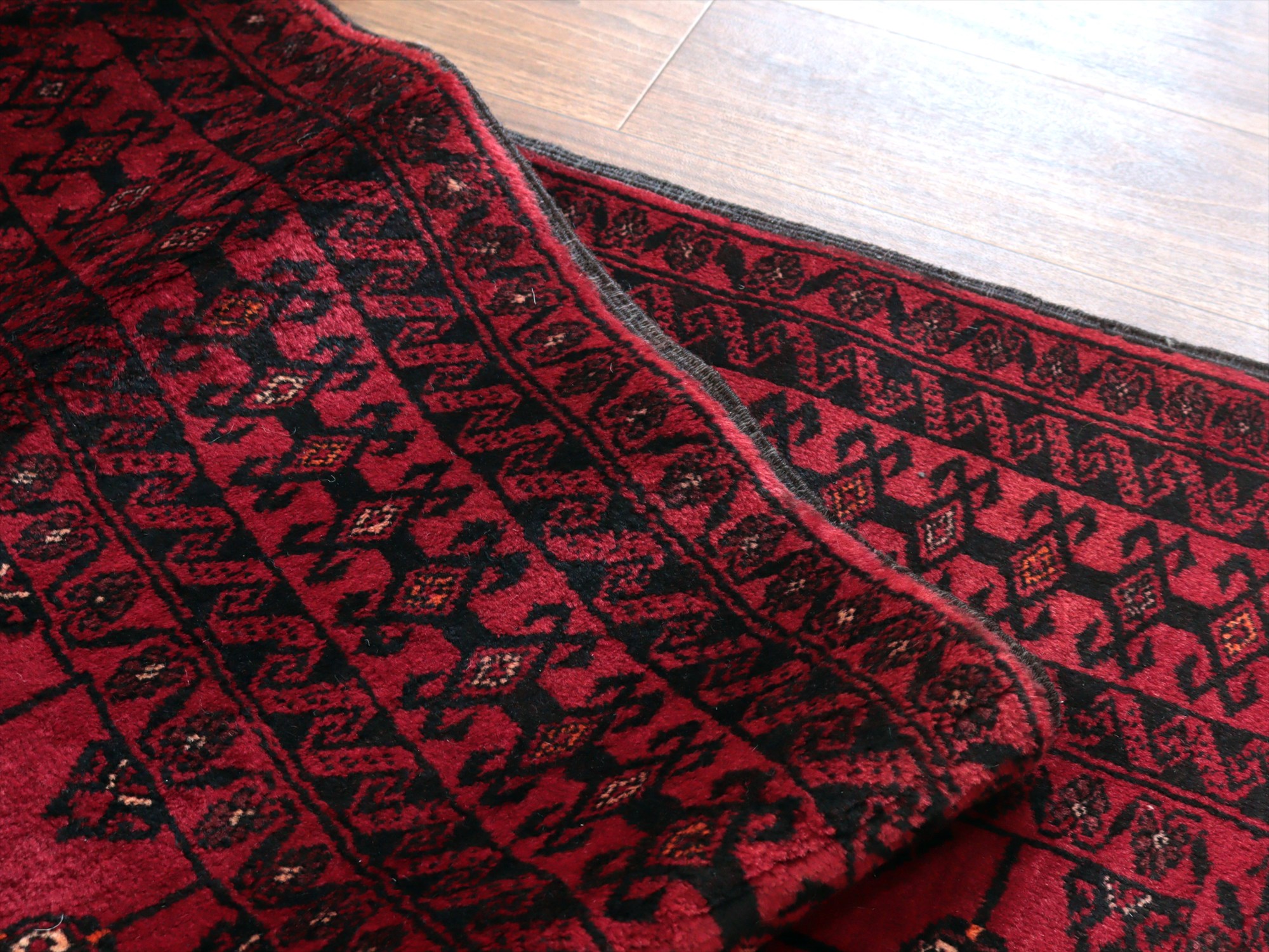 - イランの手織りラグ バルーチ214×115cm 連なる幾何学模様 レッド