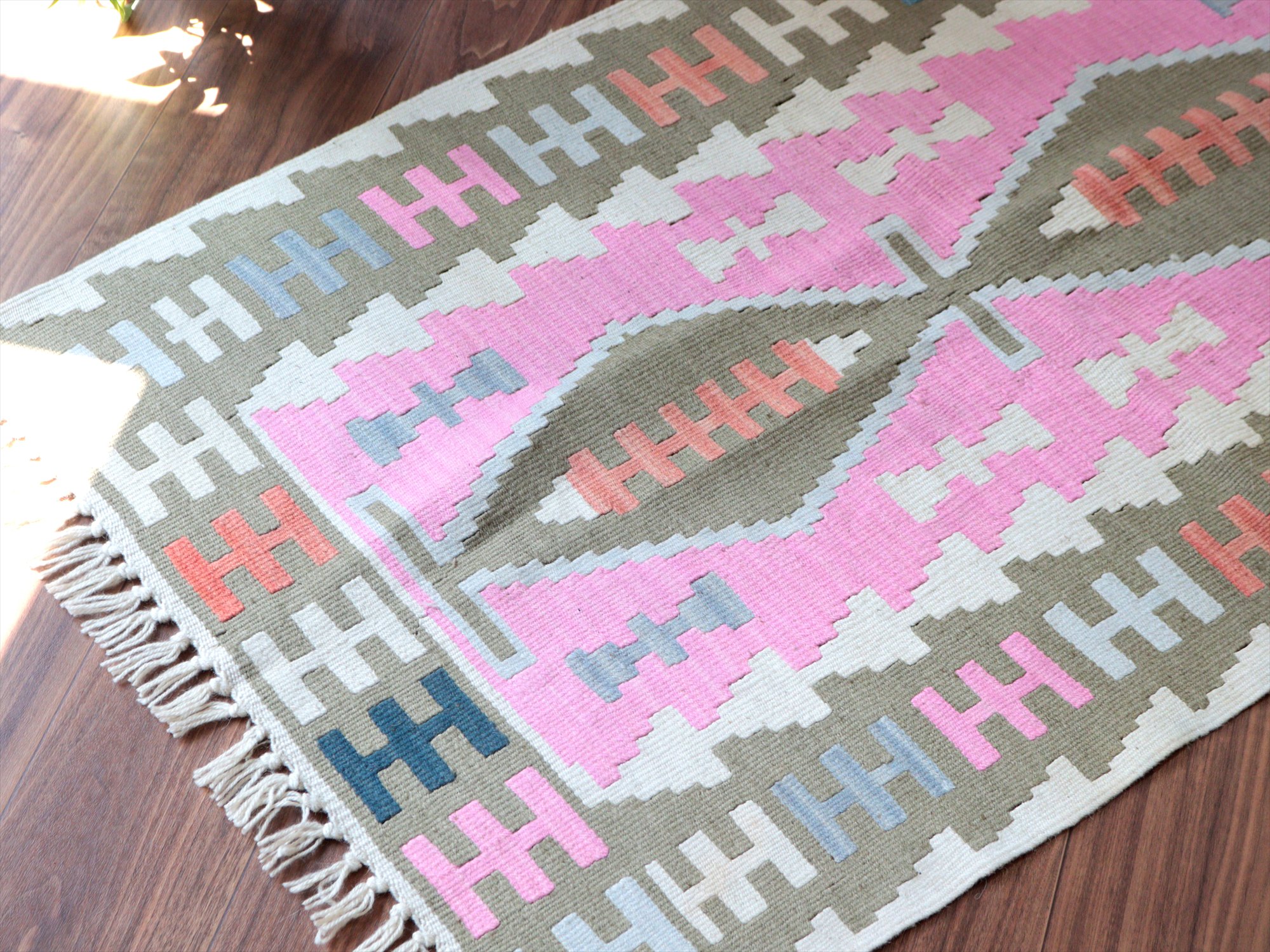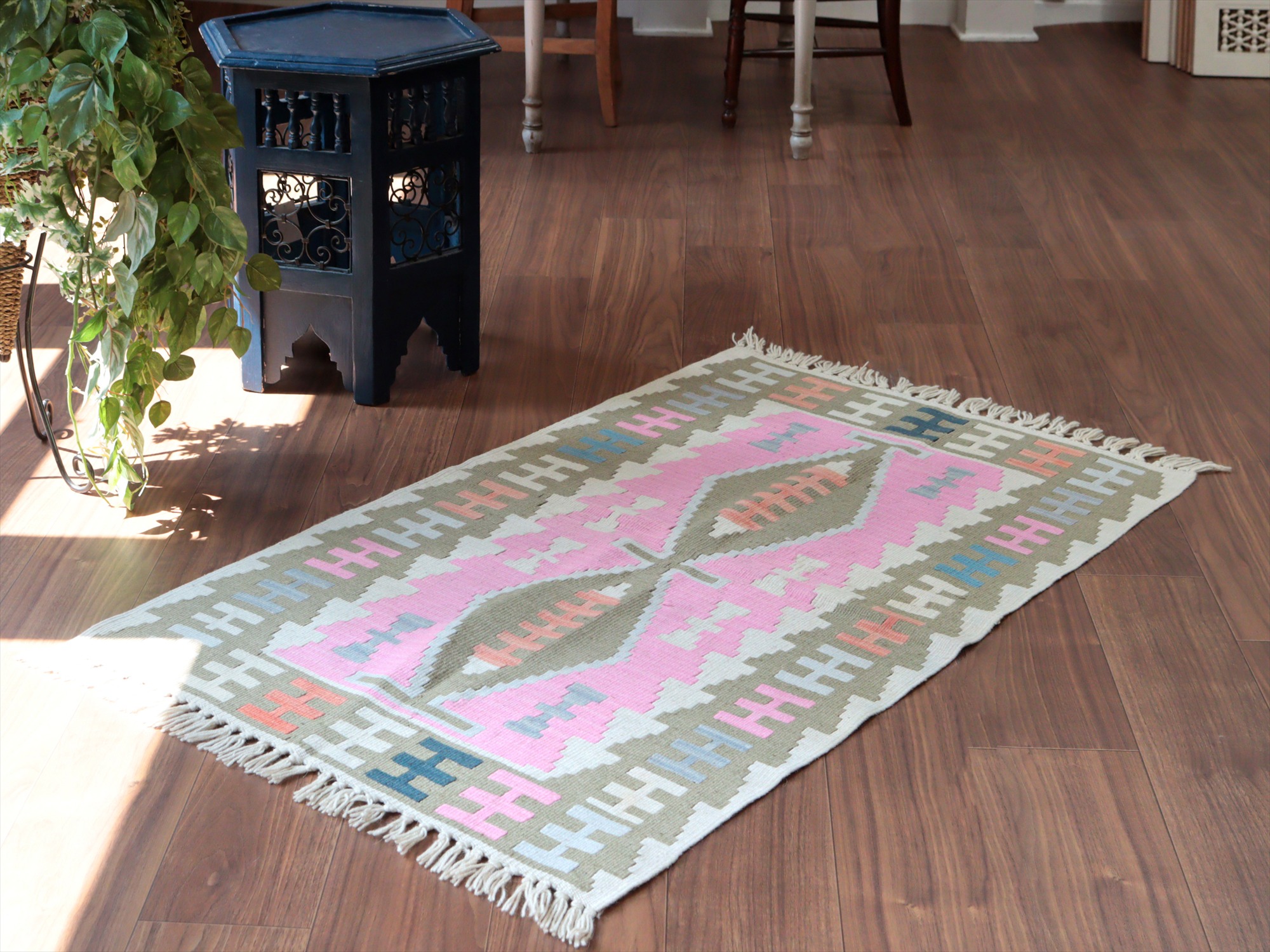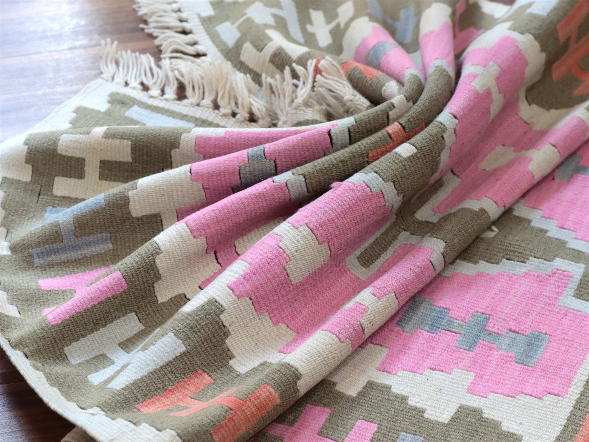 - カイセリ産手織りキリム ピンク121×76cm ベレケットのモチーフ トルコの手織りラグ