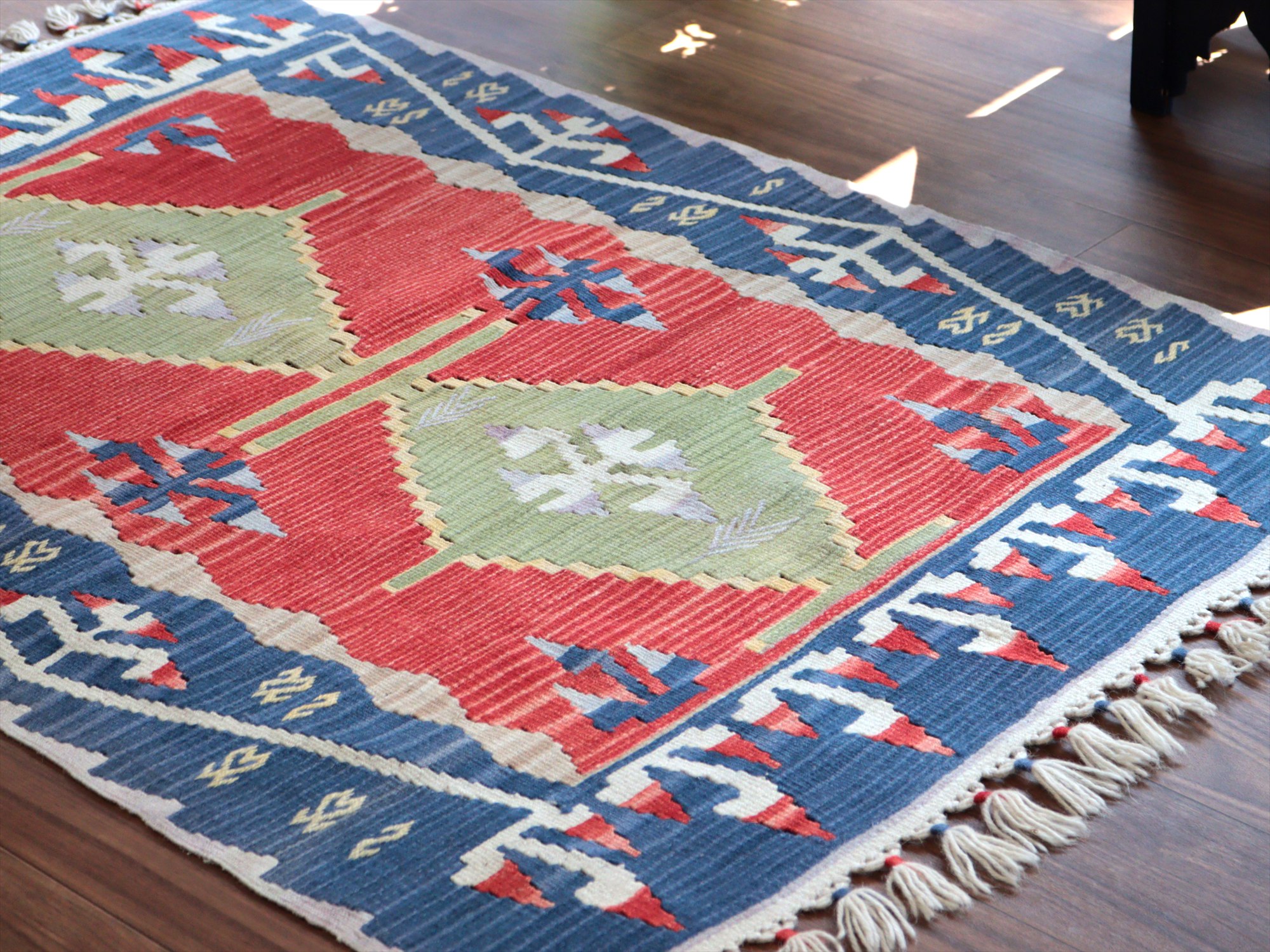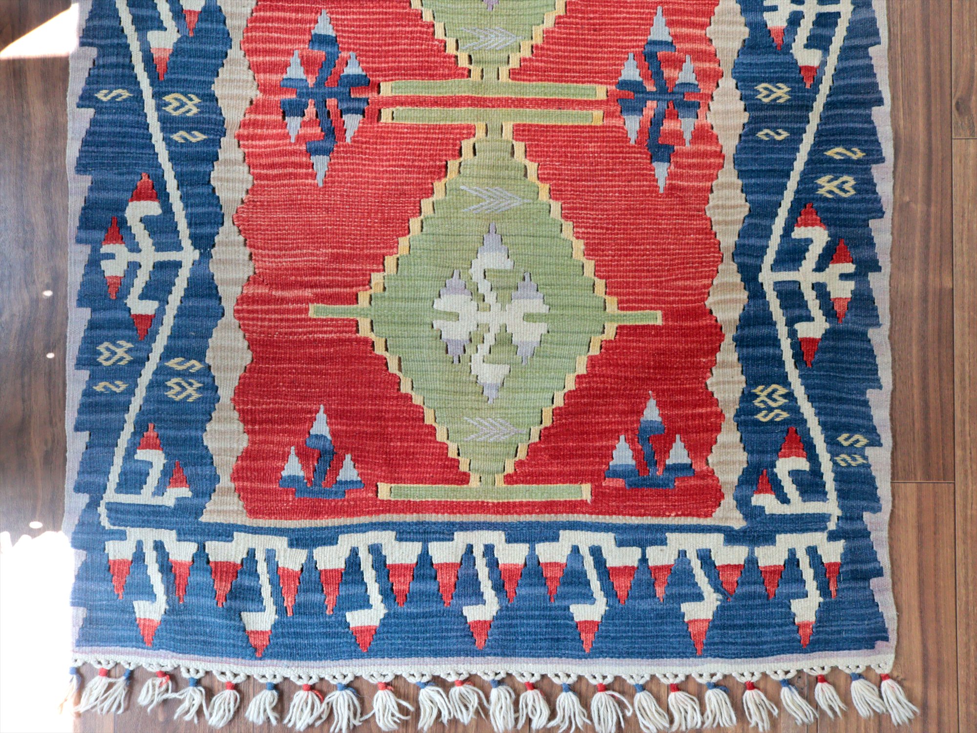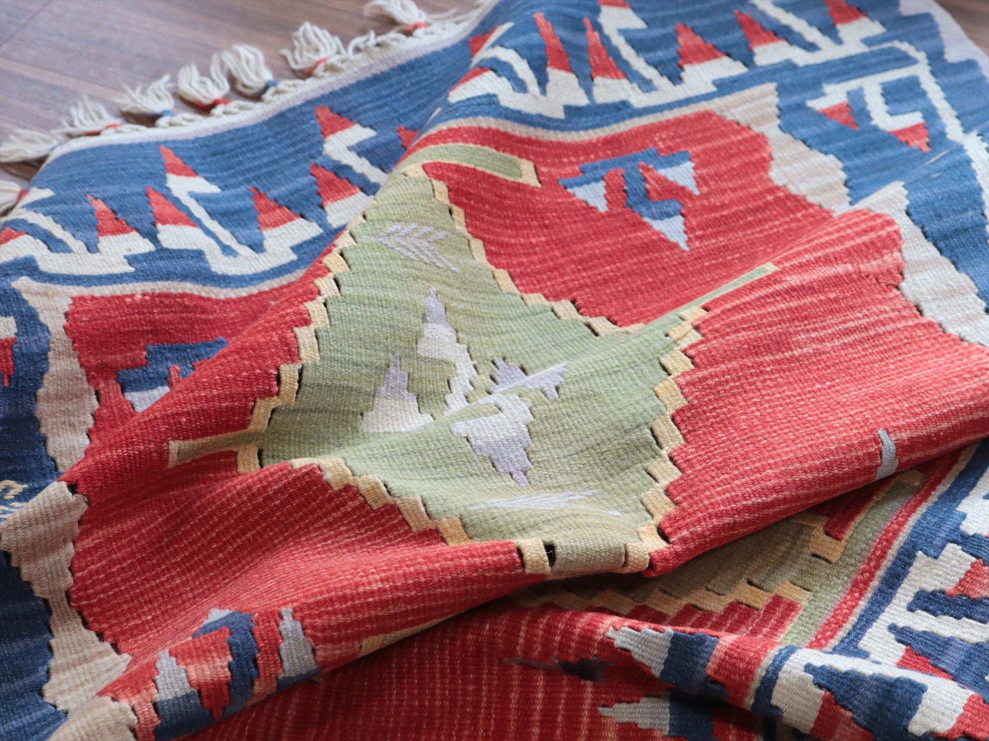 カイセリ産手織りキリム125×91cm レッド&ブルー トルコの手織りラグ