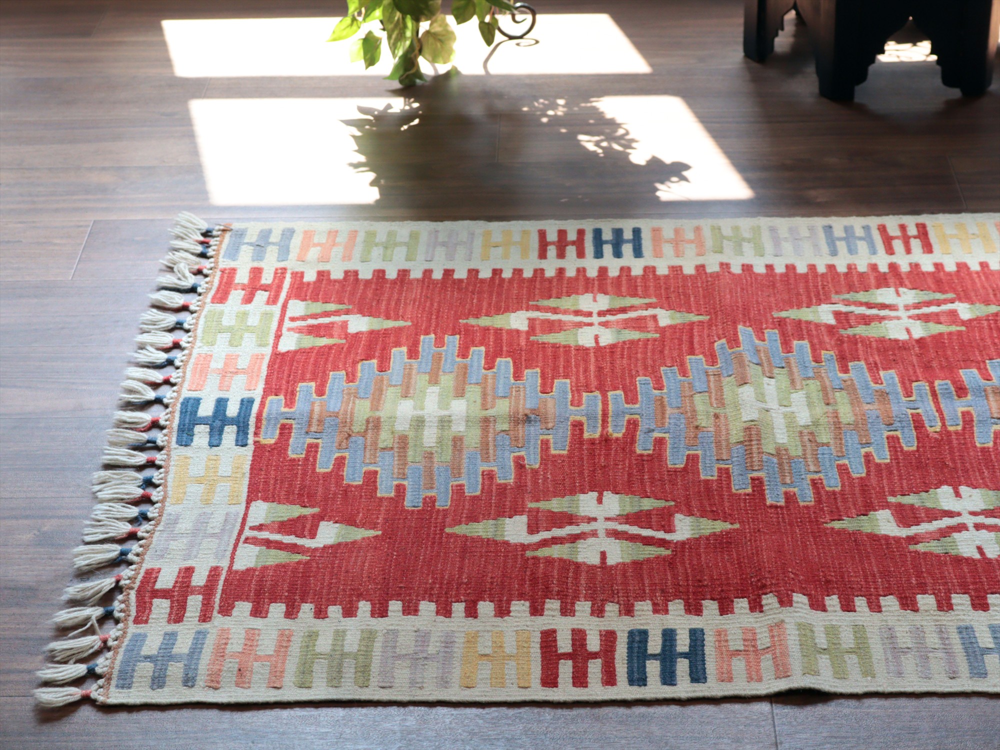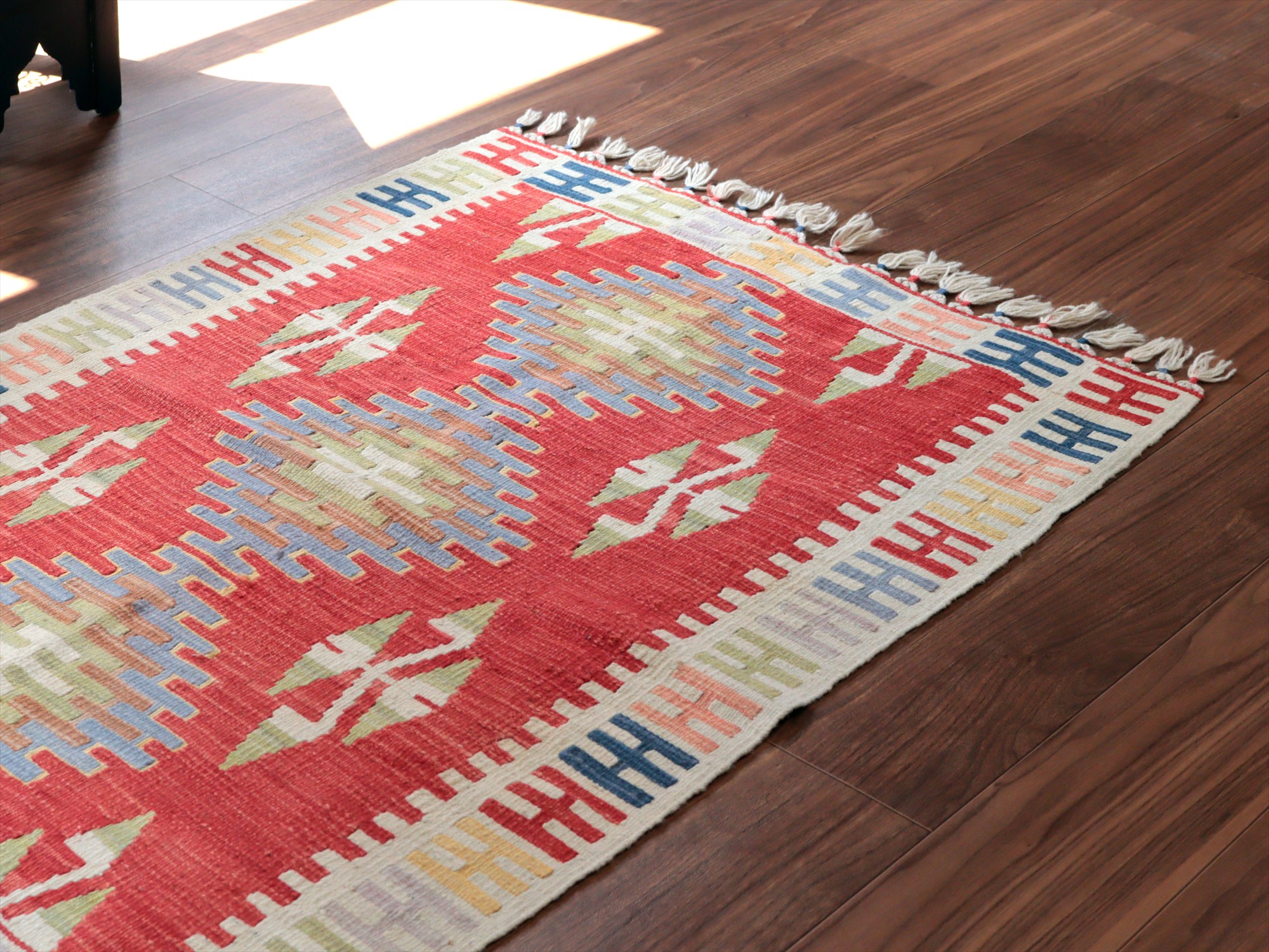 - カイセリ産手織りキリム117×89cm レッド&ベージュ トルコの手織りラグ