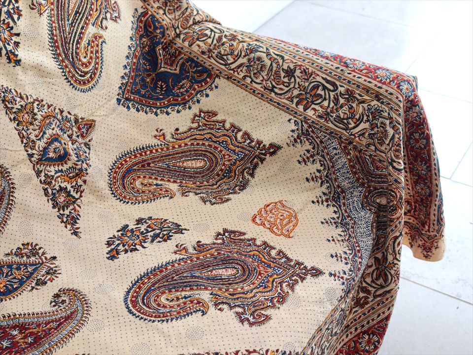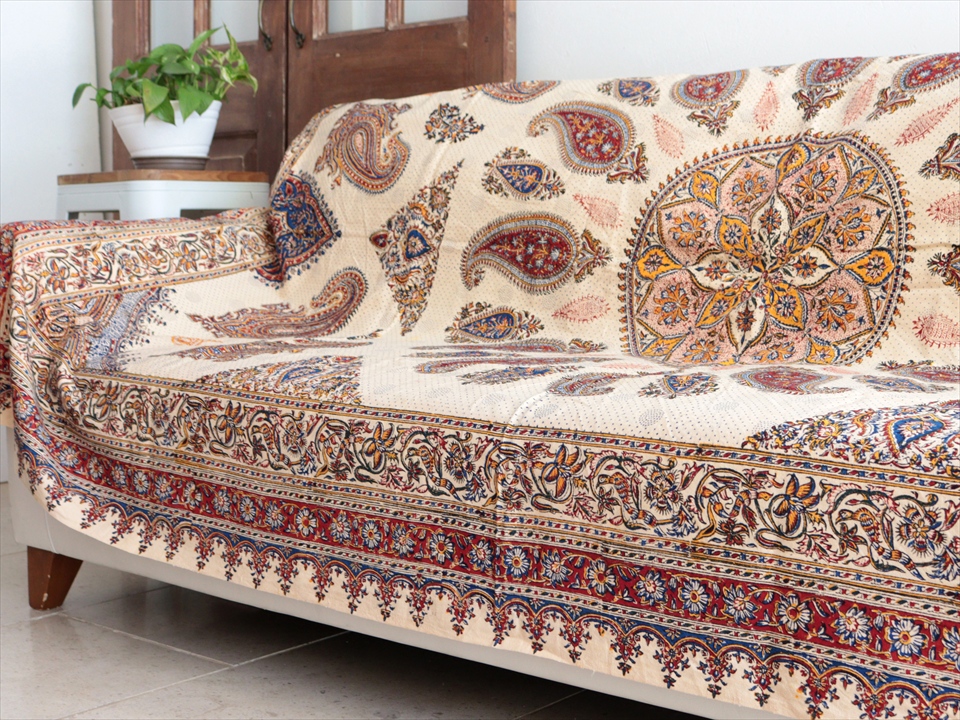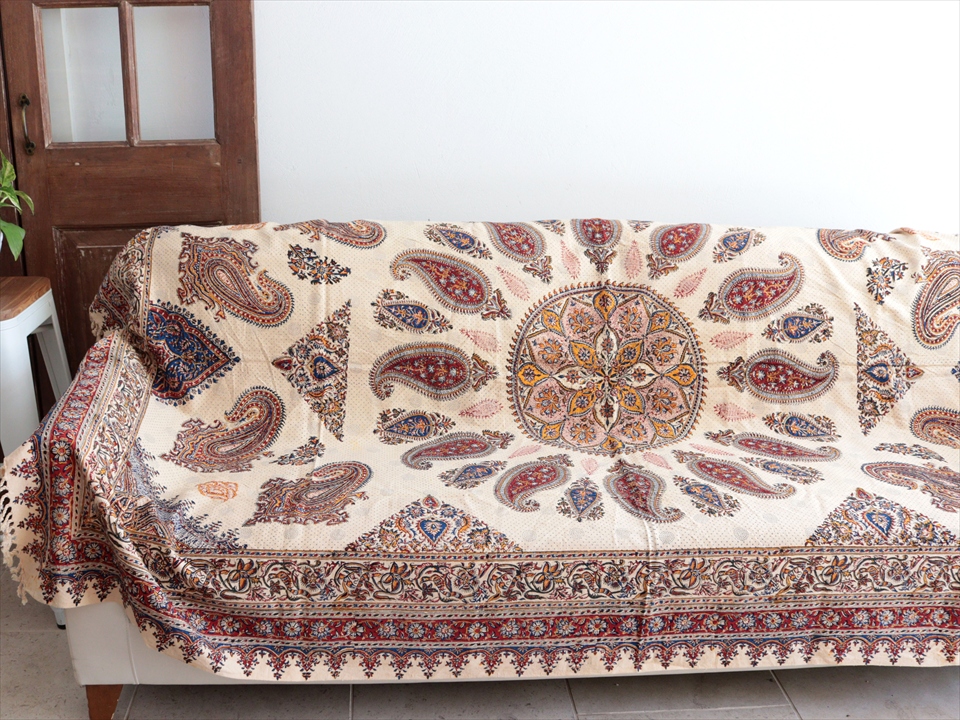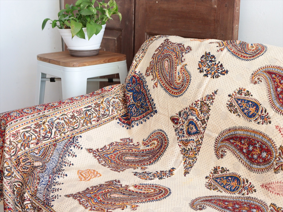 Key:コットン 染色 ブロックプリント 木版 捺染 伝統工芸 ペルシャブルー ペイズリー フリークロス マルチカバー ベッドスプレッド ベッドカバー ソファカバー カーテン タペストリー ファブリック インテリアファブリック クラフト インテリア ペルシャ ペルセポリス イラン 中東 シルクロード アジアン エスニック