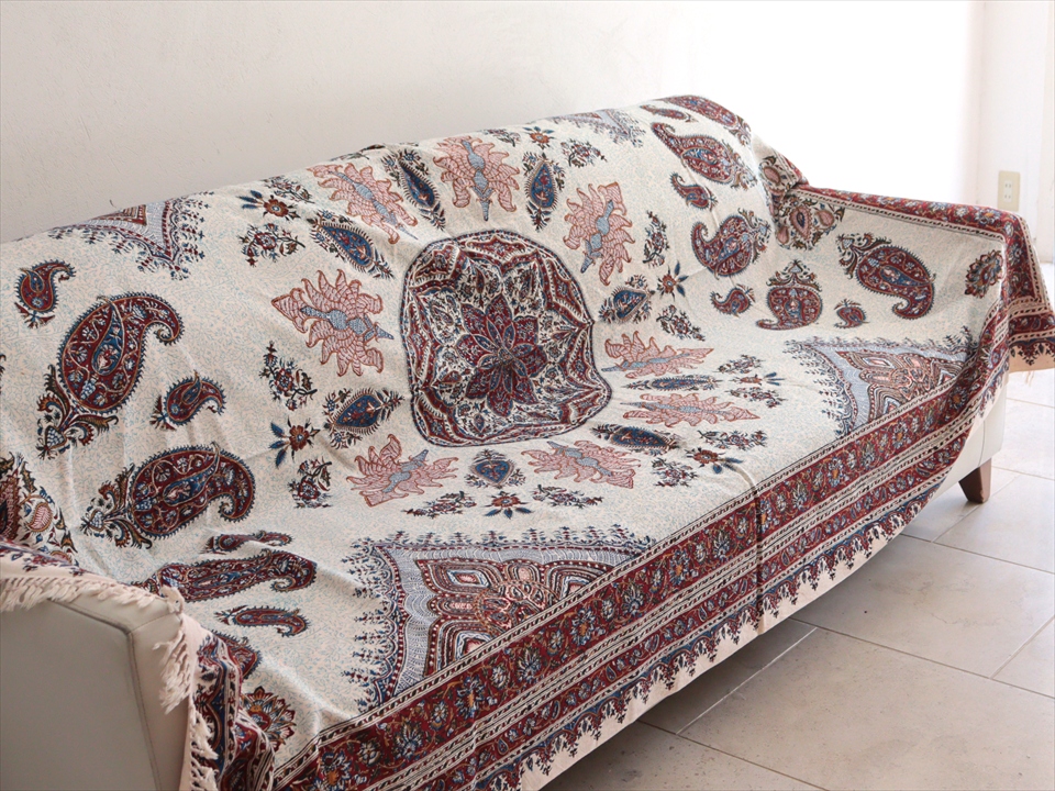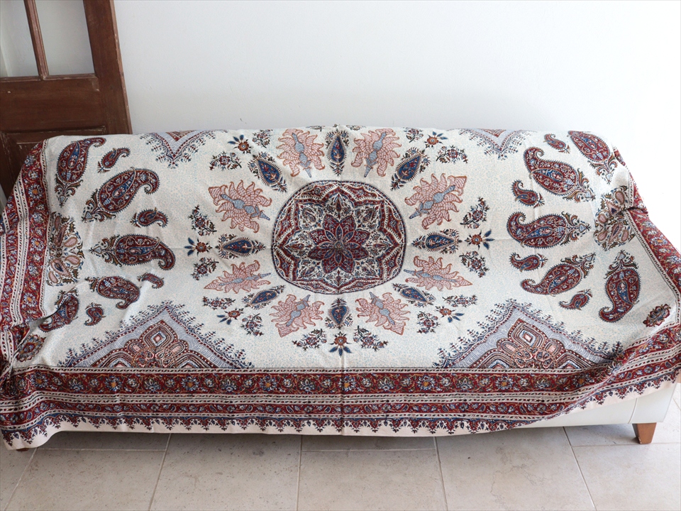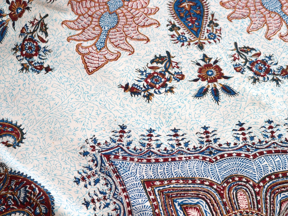 Key:コットン 染色 ブロックプリント 木版 捺染 伝統工芸 ペルシャブルー ペイズリー フリークロス マルチカバー ベッドスプレッド ベッドカバー ソファカバー カーテン タペストリー ファブリック インテリアファブリック クラフト インテリア ペルシャ ペルセポリス イラン 中東 シルクロード アジアン エスニック