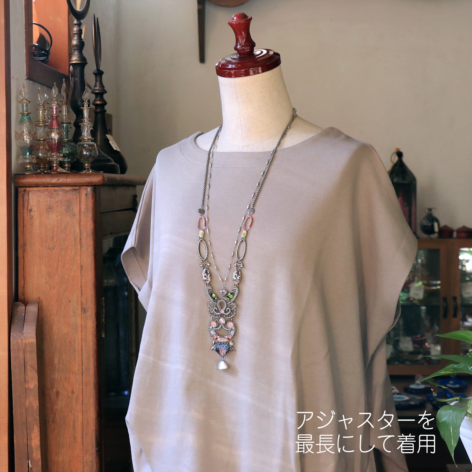 シンプルなシルバーチャームとビーズチャームがゴージャスな、2連ネックレス。蜂は西洋のラッキーチャームで、幸運を呼び込むと言われています。モチーフにはカラフルなパーツですが、遠目にみるとシルバー系の上品な雰囲気。短い連が63.5cmで、長い連が66.5cmです。トップモチーフの大きさは9.5cm×4.5cm。アジャスターを最長にすると、おヘソのあたりまで長く、スラっとした縦長のシェイプがきれいなロングネックレスです。