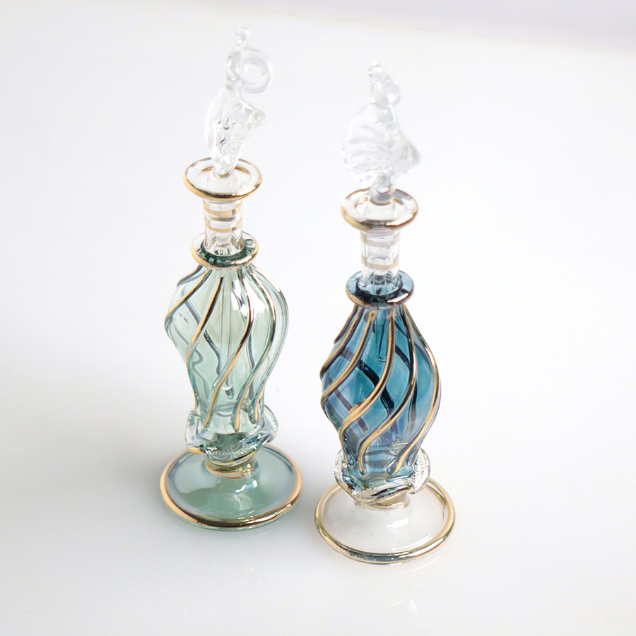 5. エジプト ガラス香水瓶 11cm 2本セット ゴールドライン ファラオ ユニークなボトルキャップ