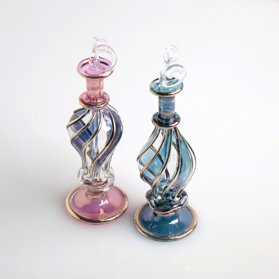 5. エジプト ガラス香水瓶 11cm 2本セット ゴールドライン ファラオ ユニークなボトルキャップ