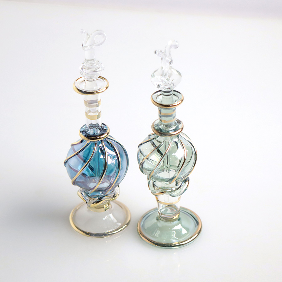 5. エジプト ガラス香水瓶 11cm 2本セット ゴールドライン ファラオ ユニークなボトルキャップ