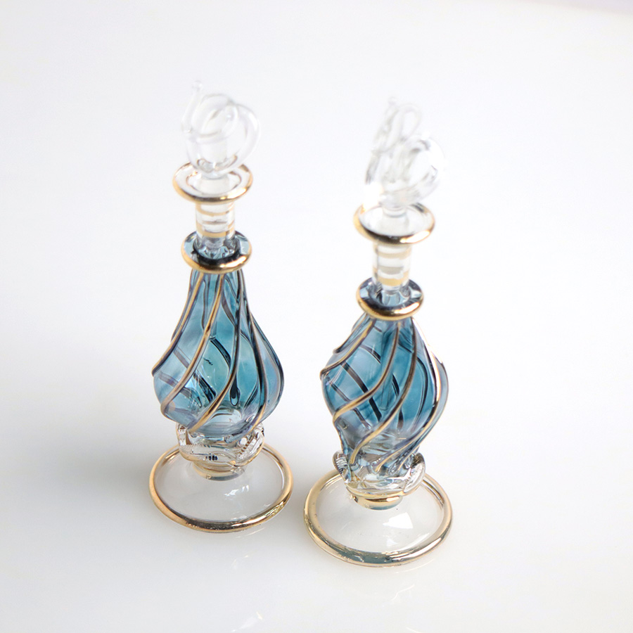 5. エジプト ガラス香水瓶 11cm 2本セット ゴールドライン ファラオ ユニークなボトルキャップ