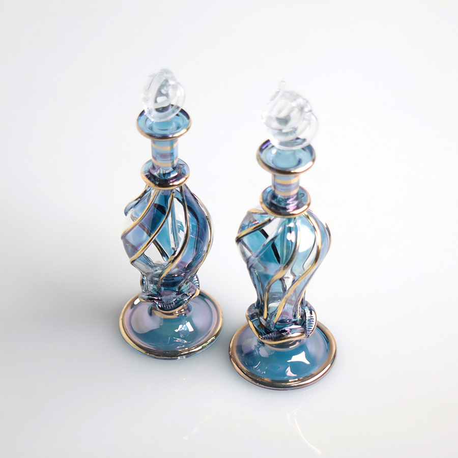 5. エジプト ガラス香水瓶 11cm 2本セット ゴールドライン ファラオ ユニークなボトルキャップ