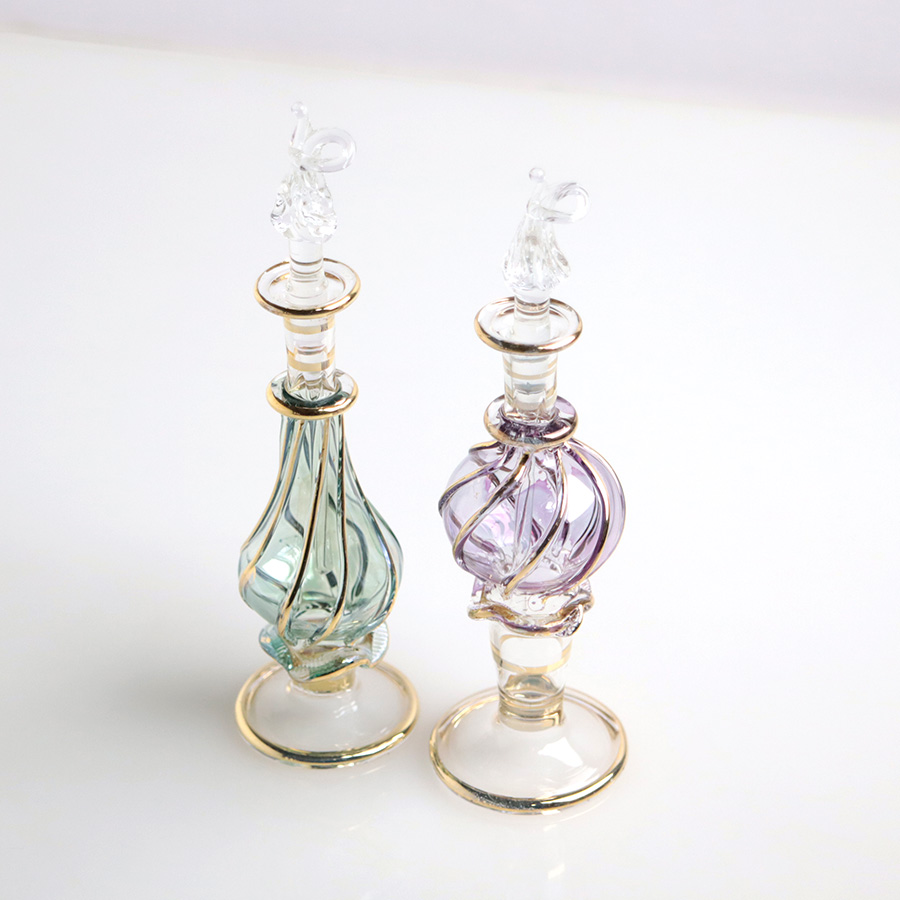 5. エジプト ガラス香水瓶 11cm 2本セット ゴールドライン ファラオ ユニークなボトルキャップ