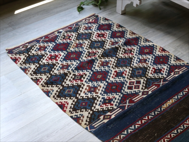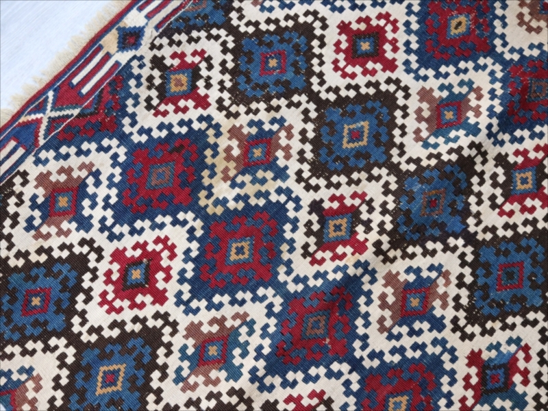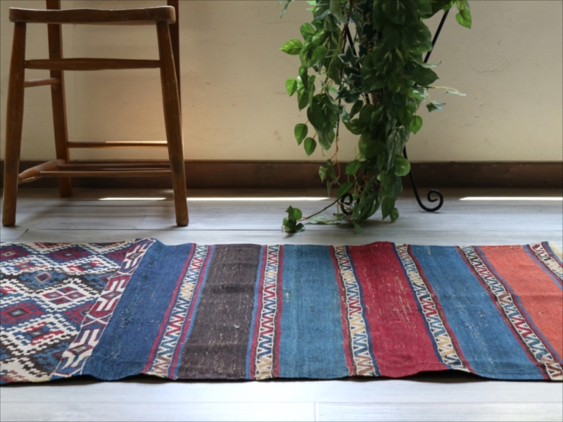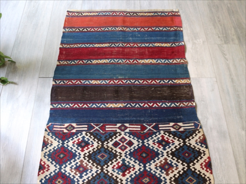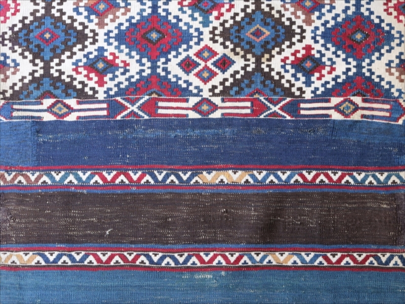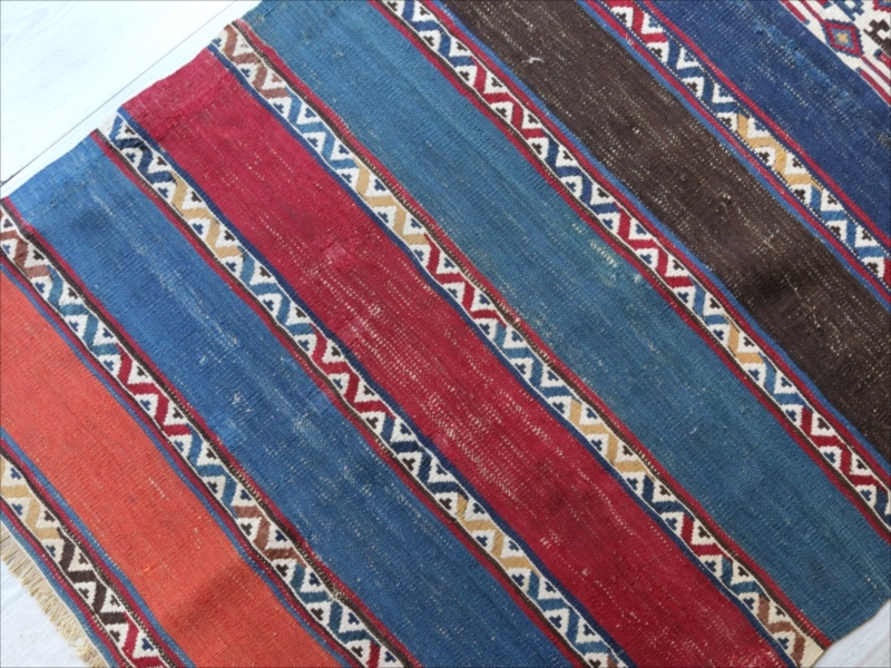 二つに折って袋として縫い合わせて使うために織られたキリムで、オリジナルはおそらく左右二対になっていたものです。厳密にはわかりませんが、ほぼ全ての色が天然染料の染めといってよいかと思います。100年を経過した現在でも、しっかりとした鮮やかな色が残っています。