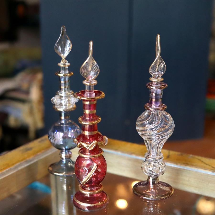 アラビアンな輝きの香水瓶。約12cmの高さのミニサイズ3本セットです。エジプトのカイロにて職人さんが一つ一つ手作りで作っているので、カラーやデザインのバリエーションも様々です。