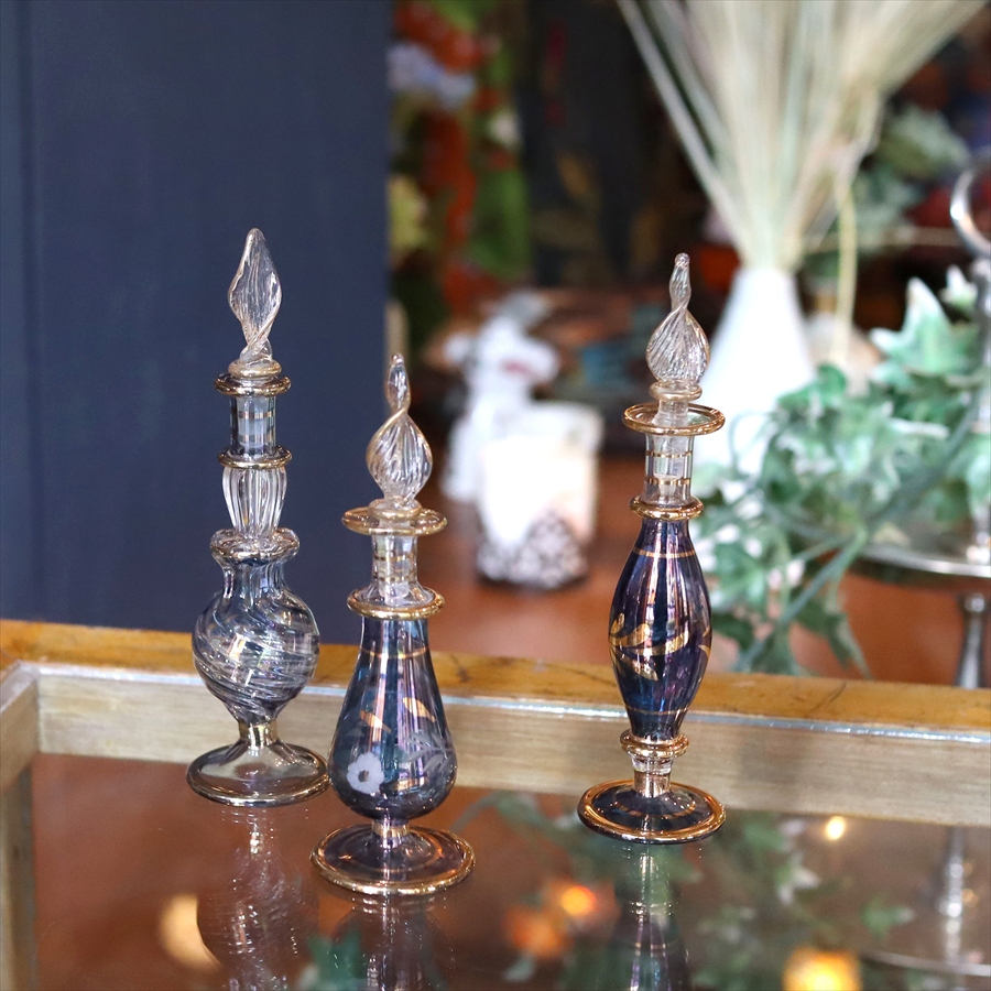 アラビアンな輝きの香水瓶。約12cmの高さのミニサイズ3本セットです。エジプトのカイロにて職人さんが一つ一つ手作りで作っているので、カラーやデザインのバリエーションも様々です。