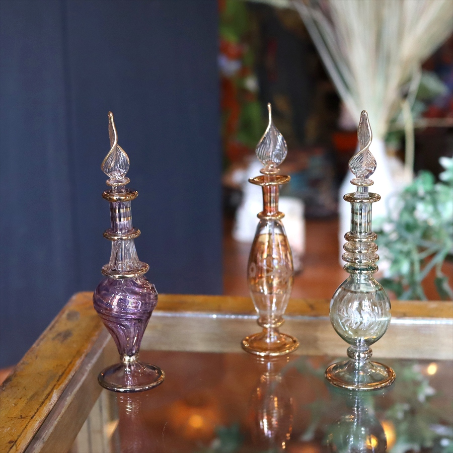 アラビアンな輝きの香水瓶。約12cmの高さのミニサイズ3本セットです。エジプトのカイロにて職人さんが一つ一つ手作りで作っているので、カラーやデザインのバリエーションも様々です。